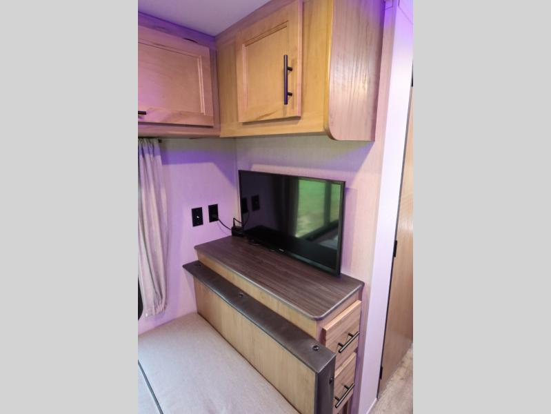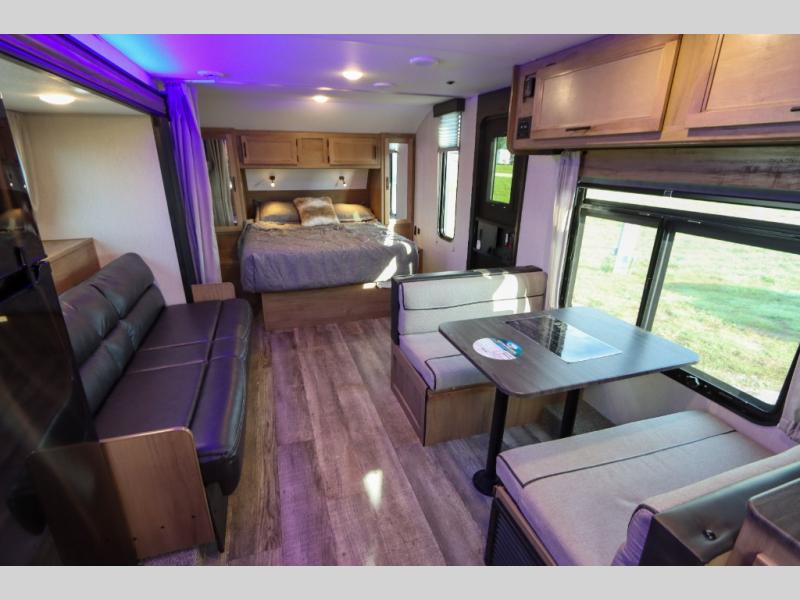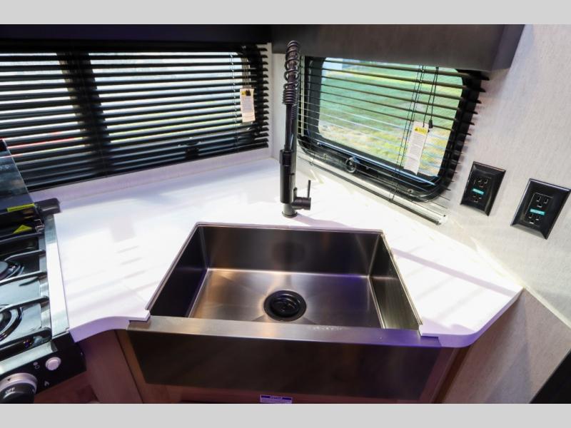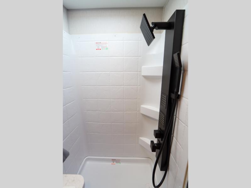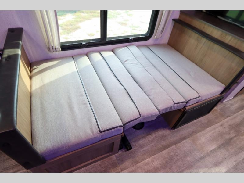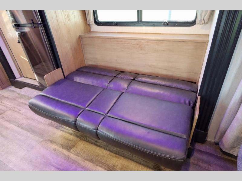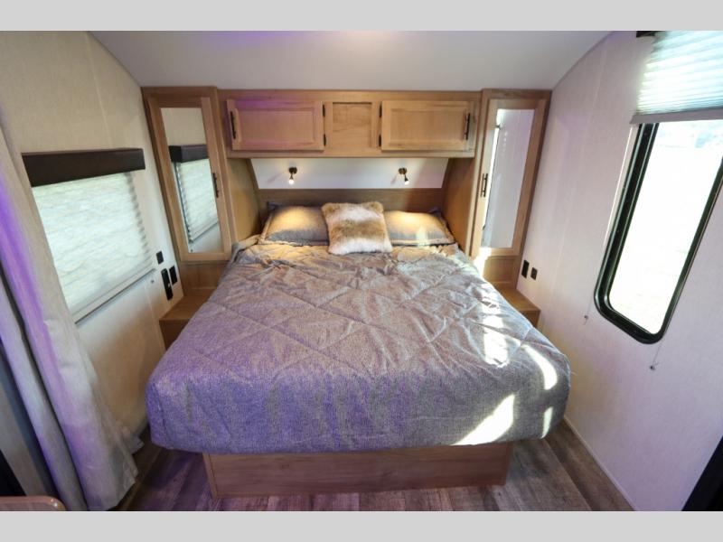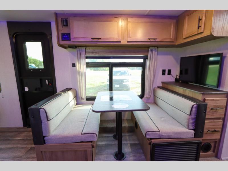 Make yourself at home in this Cherokee Grey Wolf Black Label travel trailer model which features a single slide for added interior space. The slide houses your sofa with upgraded fabric, an 11 cu. ft. 12 volt refrigerator, and pantry for tons of storage. You will find a two burner range top and microwave oven next to the farm style black stainless steel sink with upgraded faucet. In the rear corner bathroom, enjoy the added headroom and natural lighting that streams in each morning due to the skylight overhead in the shower. The upgraded showerhead is also a plus, as well as the on demand tankless water heater! You will enjoy the booth dinette and sofa for seating when inside, and when it's time to head to bed, a queen bed is a welcome retreat. The sofa and dinette can also be converted for children or an extra guest.