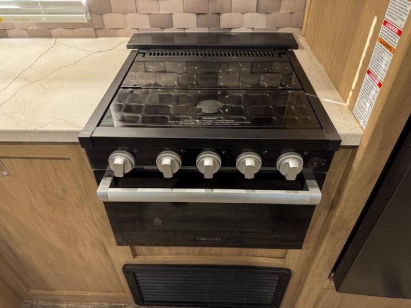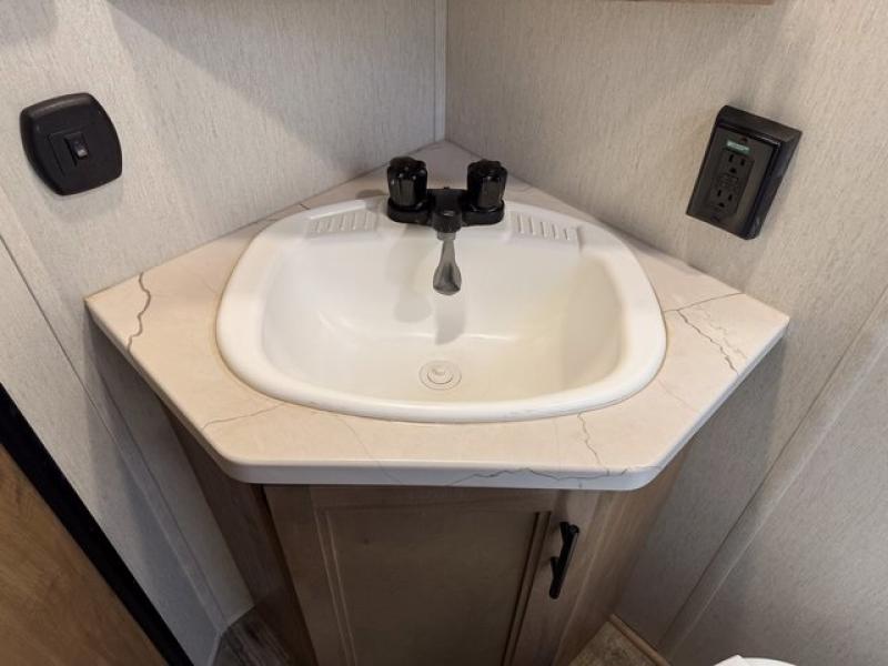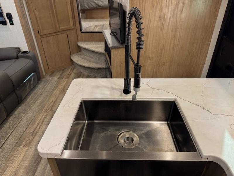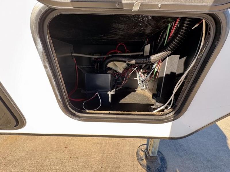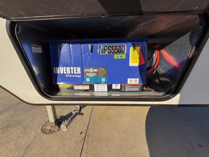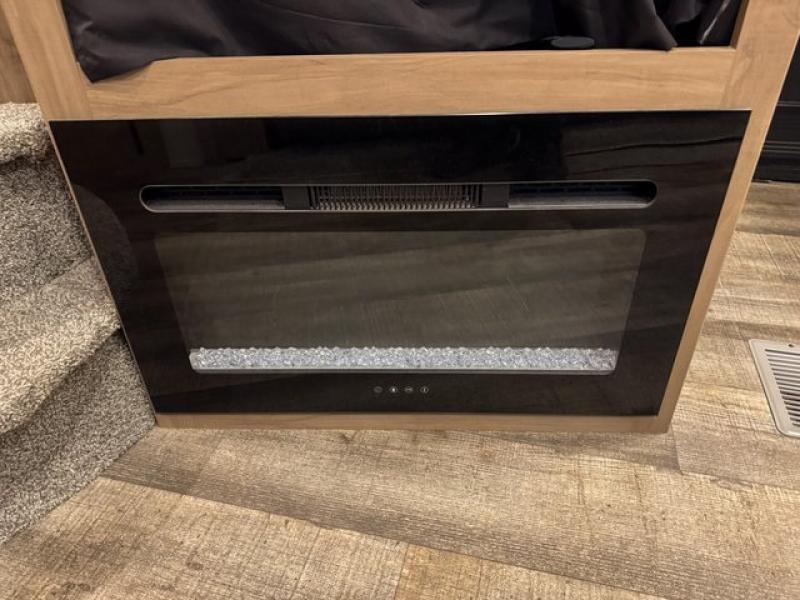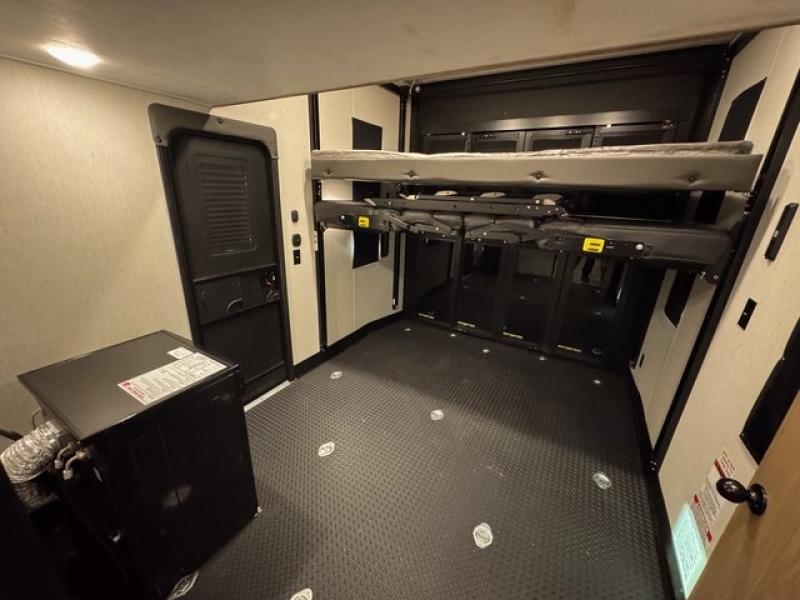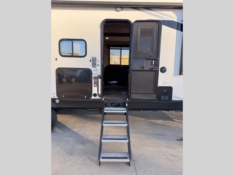 With dual entry doors, you will experience a smooth flow of traffic in and out of this toy hauler! One of the entrances leads into the 12' garage area with a folding dinette table below a Happijac bed lift system, and an area prepped to add an optional washer and dryer. The chef will have everything they need to prepare their best home cooked meals indoors or they can head to the outside kitchen to breathe in some fresh air while they cook. Gather together at the booth dinette for game night or relax on the sofa across from the entertainment center with a fireplace. When you're ready to wind down your nights, clean up in the dual entry bathroom with the radius shower then head directly into the front private bedroom where you can rest your head on the 67" x 74" Wolf Pack king bed!