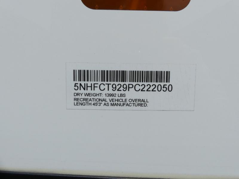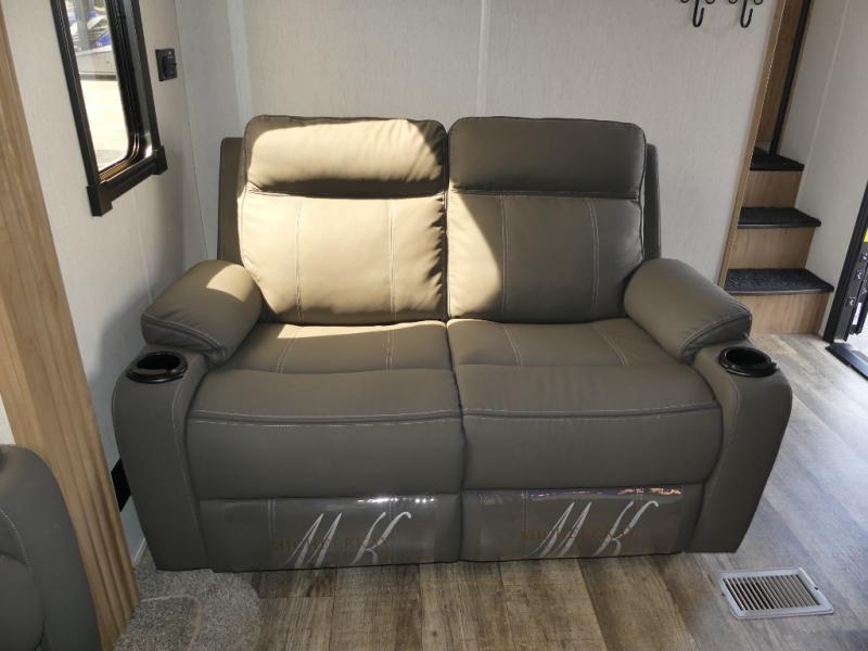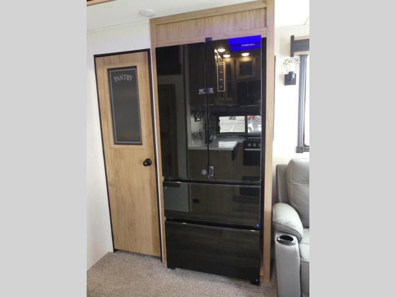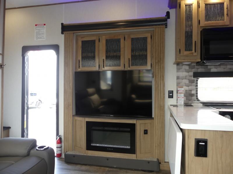 This fifth wheel is packed with features you don't want to pass up! The Diamond Package includes a three season garage wall, 6-point auto leveling, slam latch doors, and a TV in the living room for movie nights. You will also find aluminum sidewall construction, solid surface countertops in the kitchen, a 30" residential microwave, and more! The 14' separate garage will not only store your toys, but will double as your guests' bedroom since there is a Happijac power bed above a sofa/bed, a convenient half bath, plus a loft. Everyone can meet in the main living area/kitchen to relax on the theater seating or additional sofa, and the U-shaped kitchen will be a big plus with the chef of your group. There is a flip-up counter for more prep space, a pantry, plus an extra large 16 cu. ft. 12V refrigerator for perishables. And don't overlook the outside kitchen with a refrigerator and an ice maker! The front master suite will feel just like home with its queen bed slide out, full-length wardrobe, and bedroom fireplace!