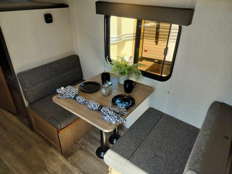 The whole family can sleep comfortably in this travel trailer! It has a set of bunk beds for the kids to sleep on with a TV mount location for extra entertainment, and you can sleep comfortably on the front queen bed with overhead cabinets and a shelf. There is even an exterior pack and play door that accesses the storage space under the bottom bunk. The chef will enjoy preparing their best home cooked meals either indoors with the high output cooktop or at the outside mini kitchen while staying protected by the 12' power awning, plus you have an outside TV mount location for added entertainment while you cook!