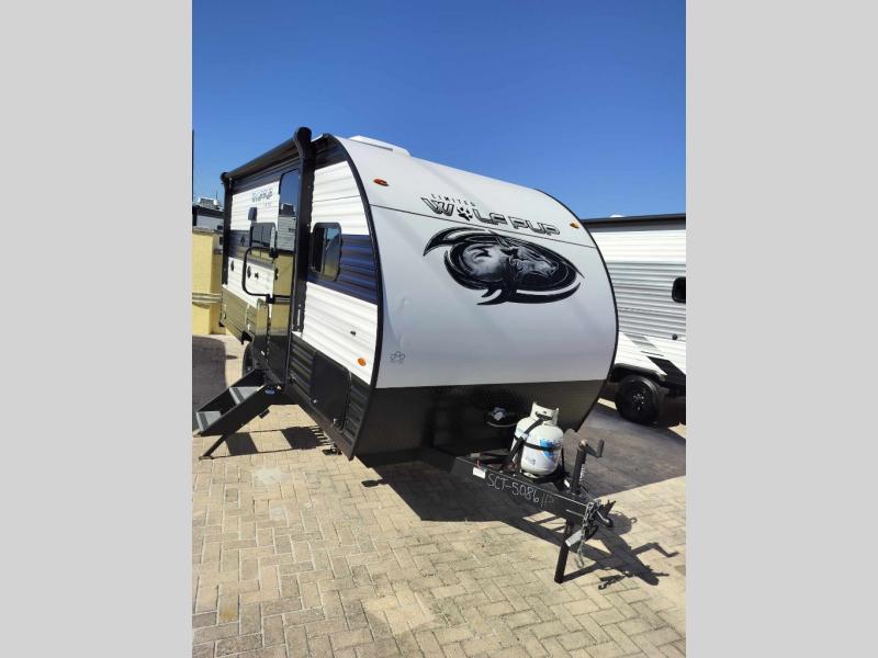 Each one of these Forest River Cherokee Wolf Pup travel trailers and toy haulers are lightweight and easy to tow! They are fully self contained with ample tank capacities, an abundance of storage space, and filled with at home amenities. The aerodynamic smooth radius front profile, the Power Gear frame technology, and the space saver rail design make them easier to maneuver. You will also appreciate the seamless roofing membrane with heat reflectivity to keep the sun from making your unit a hot box. The tongue and groove plywood flooring will hold up for years of fun and the USB charging stations help to keep your electronics at 100% while you're away. Come find the best model for you today!