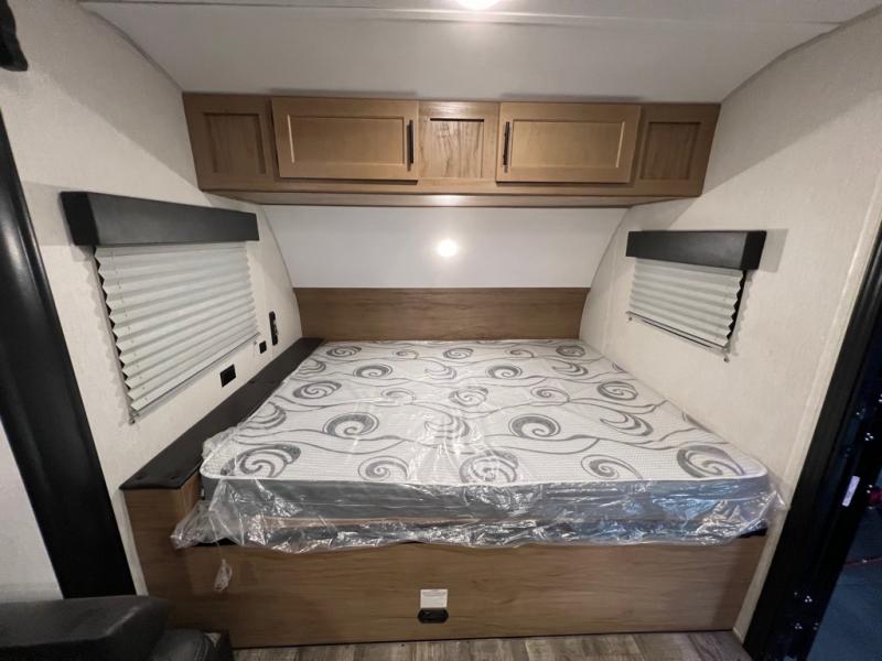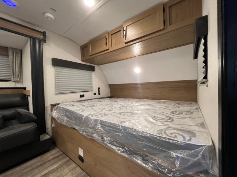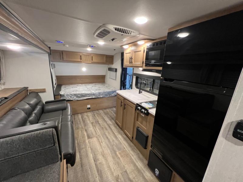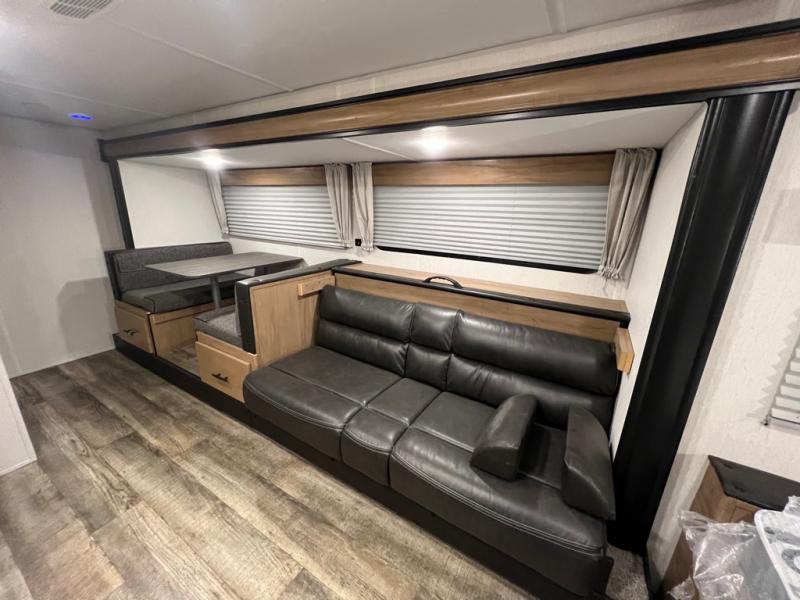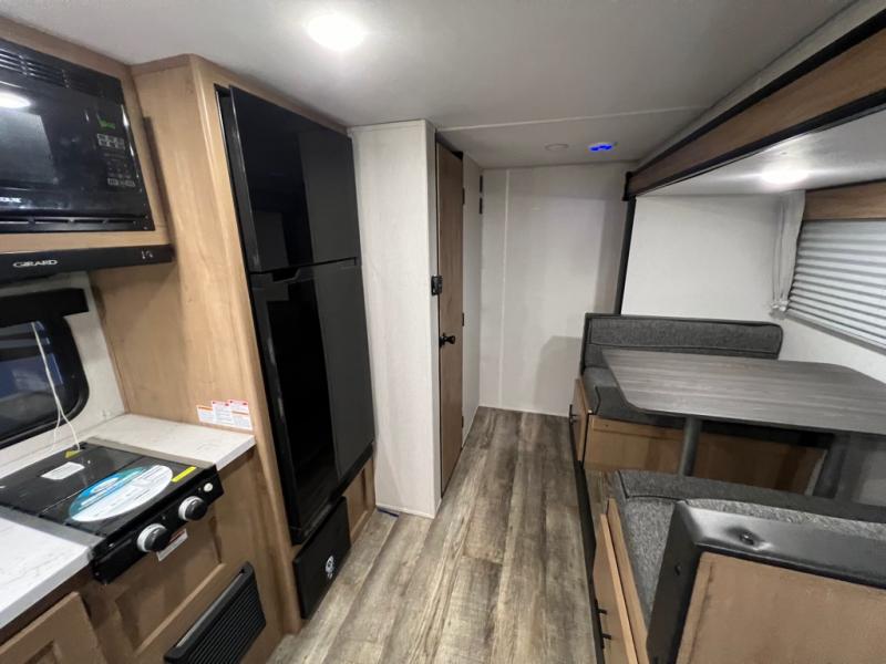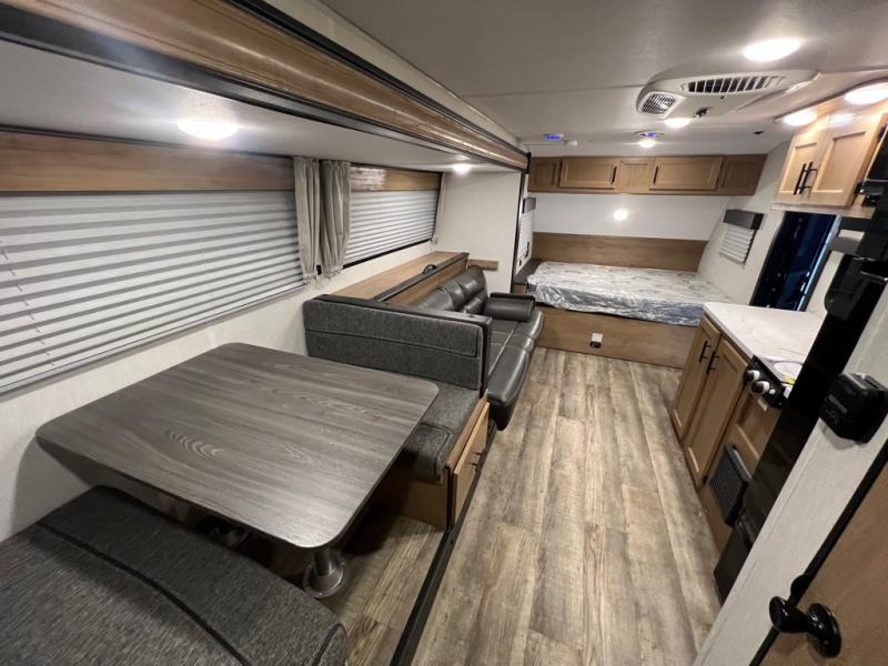 Enjoy plenty of walking around space in this travel trailer with the full slide! Inside the slide is a sofa with a hidden bunk above it and a booth dinette to play card games and enjoy delicious meals prepared with the high output cooktop and 11 cu. ft. Cannon high efficiency refrigerator. There is also an outside mini kitchen to cook your meals, outside storage to keep your camping chairs, and a 12' power awning to protect you while you cook and relax in the chair. For your entertainment needs, there is an outside TV mount and a TV mount location next to the rear corner bathroom which has a tub/shower to get squeaky clean each morning!