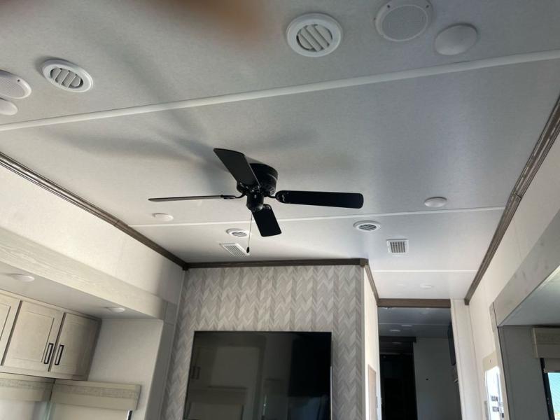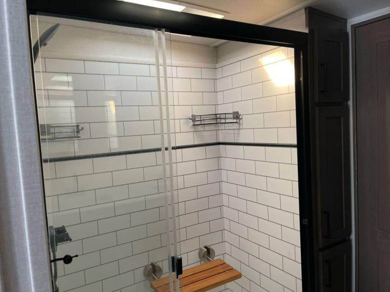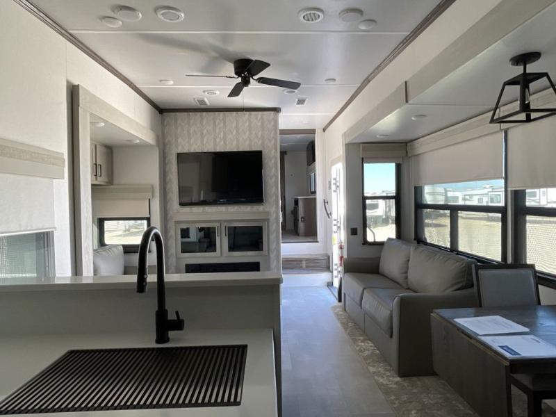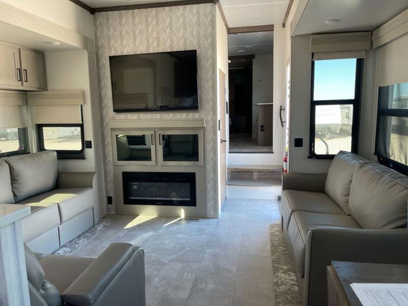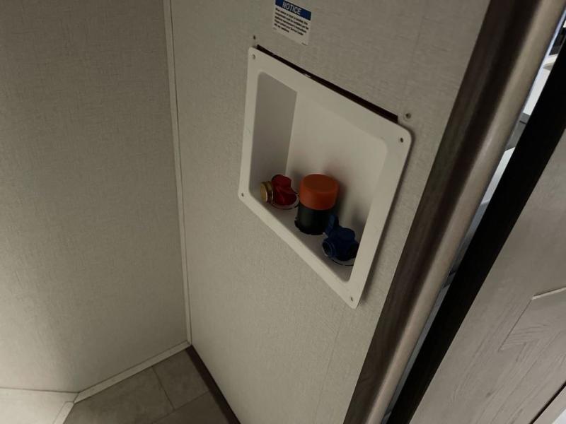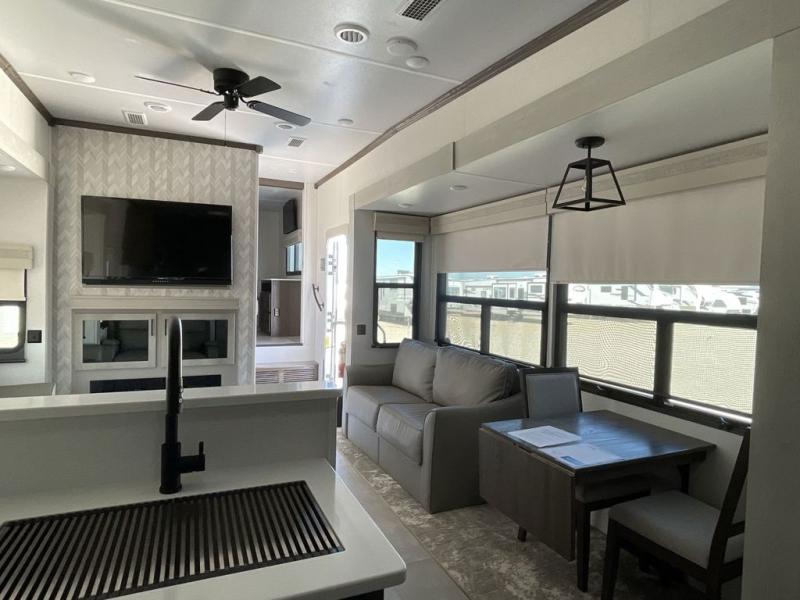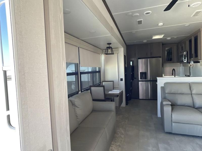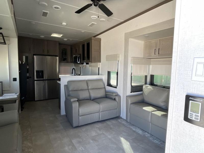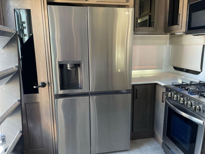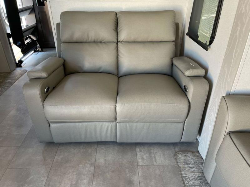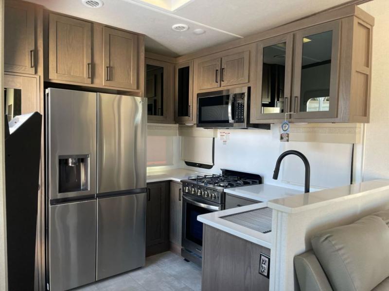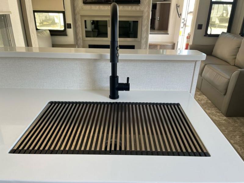 You won't believe all that this fifth wheel has to offer! Starting with the rear kitchen which has plenty of countertop space to prepare your delicious meals, a four burner cooktop with an Insignia 24" residential oven to cook them, and a deep-bowl stainless steel sink for easy clean up. The living area has opposing tri-fold sofas and a 60" theater seat with USB charging and storage across from an entertainment center with 50" LED TV. The half bathroom is close to the living area so you can get back to watching your movie faster. You will feel right at home sleeping in the master suite on a slide out king bed across from a dresser and bench where you can sit while you put on your shoes, plus entrance into the front full bathroom. Inside the bathroom, you will find a vanity with dual sinks for two to get ready at once, a large signature spa shower with a teak flip up seat, and a front wardrobe that has an area prepped to add an optional washer and dryer!