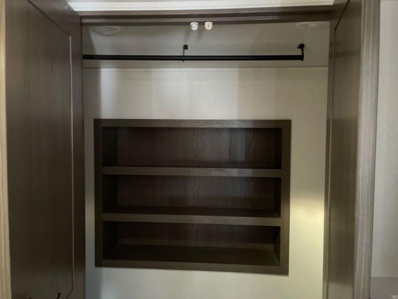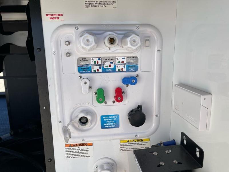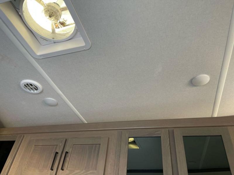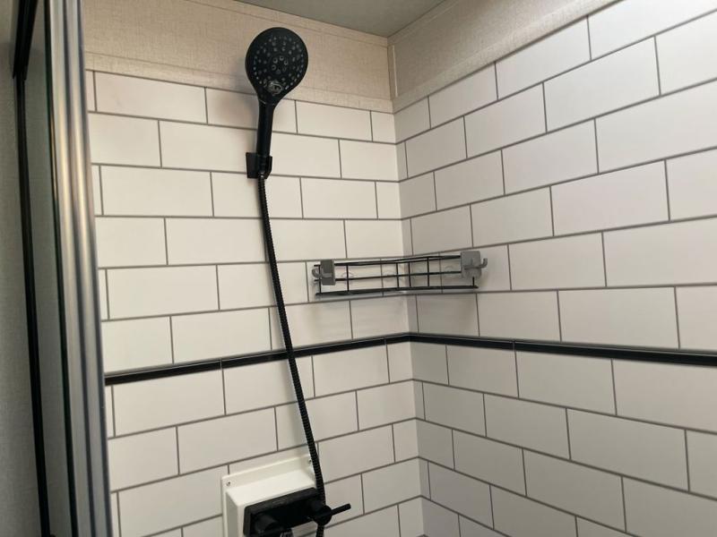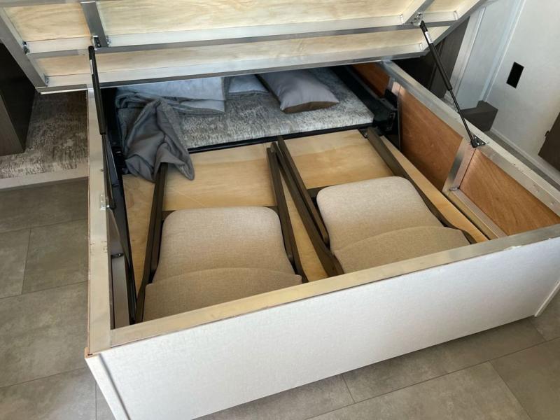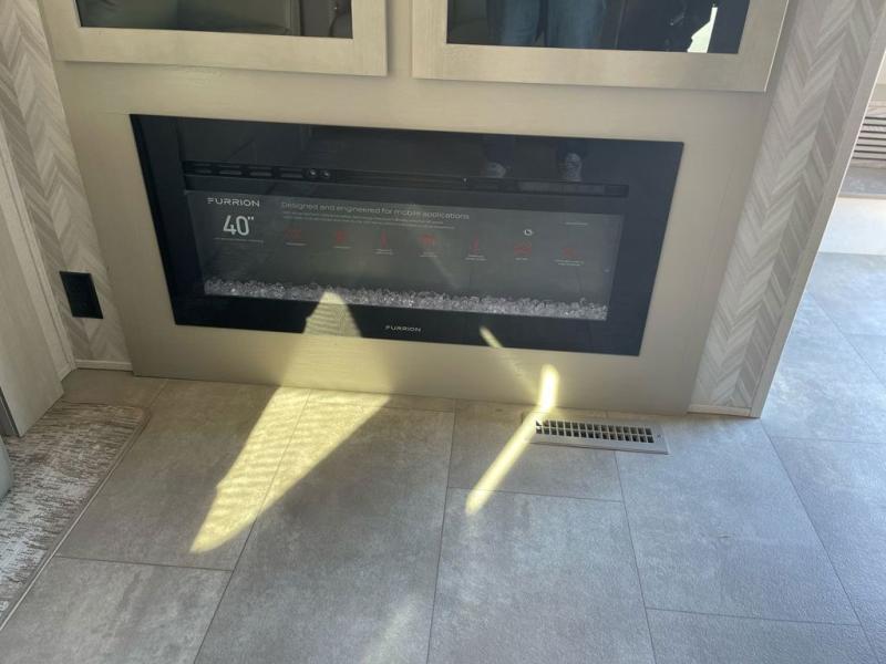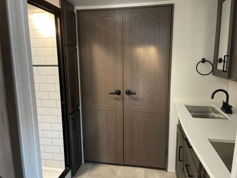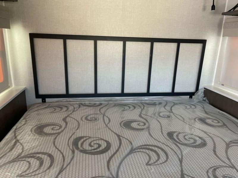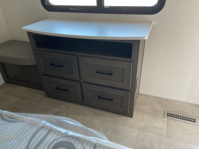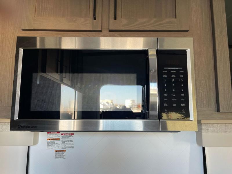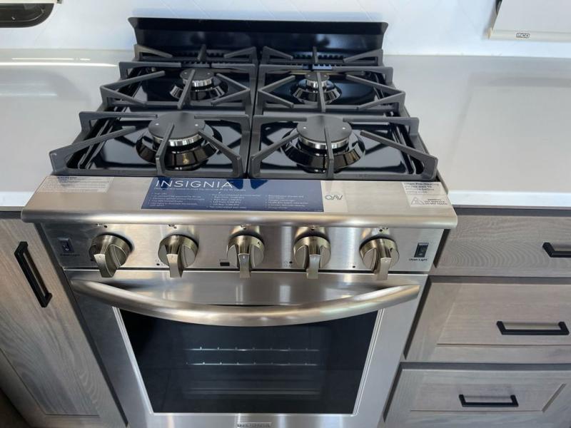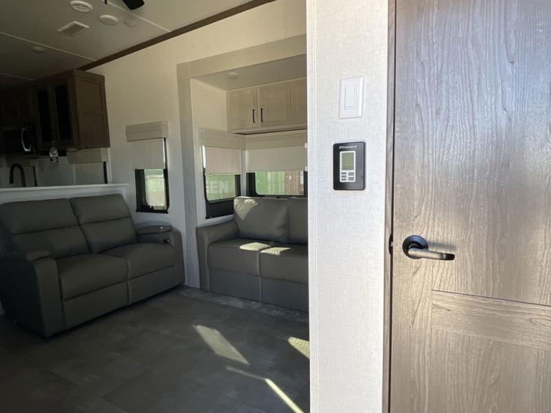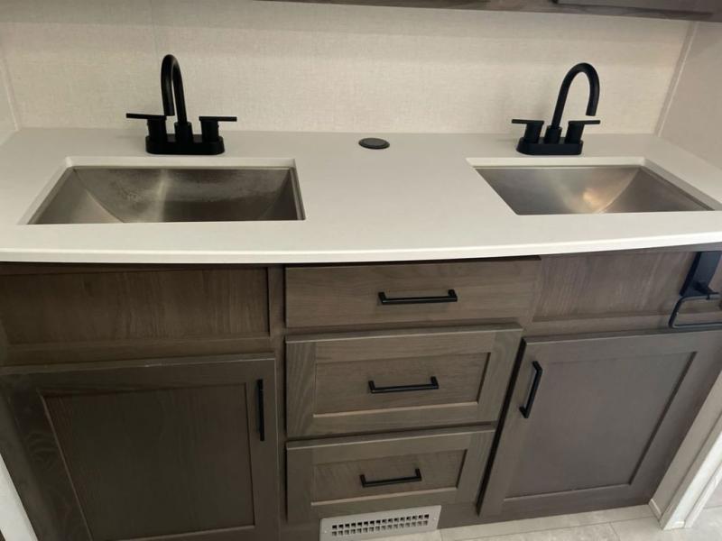 You won't believe all that this fifth wheel has to offer! Starting with the rear kitchen which has plenty of countertop space to prepare your delicious meals, a four burner cooktop with an Insignia 24" residential oven to cook them, and a deep-bowl stainless steel sink for easy clean up. The living area has opposing tri-fold sofas and a 60" theater seat with USB charging and storage across from an entertainment center with 50" LED TV. The half bathroom is close to the living area so you can get back to watching your movie faster. You will feel right at home sleeping in the master suite on a slide out king bed across from a dresser and bench where you can sit while you put on your shoes, plus entrance into the front full bathroom. Inside the bathroom, you will find a vanity with dual sinks for two to get ready at once, a large signature spa shower with a teak flip up seat, and a front wardrobe that has an area prepped to add an optional washer and dryer!
