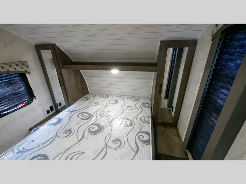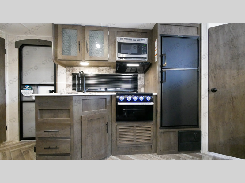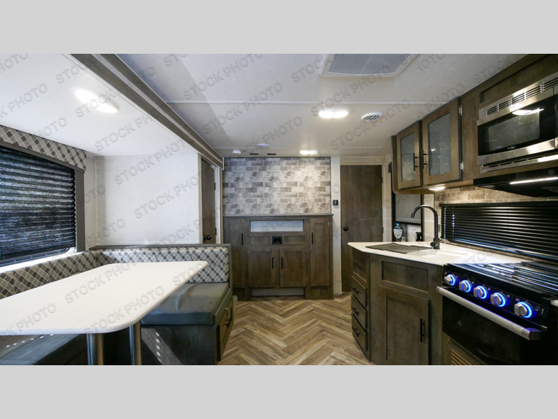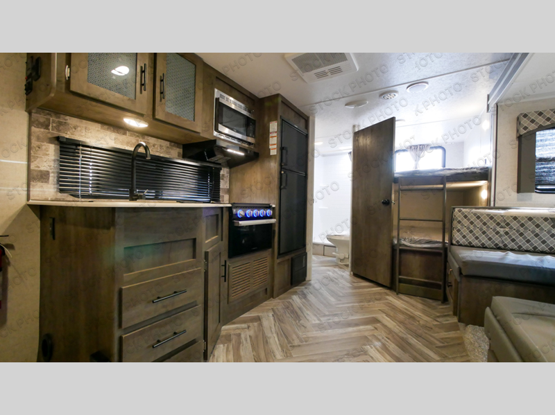Whether you camp to "glamp" or explore, you can do both with this trailer at your campsite or RV resort spot! You will have dual entry allowing easy access into the main living and kitchen area with a slide out U-shaped dinette and walk-in pantry for lots of goodies, plus a fireplace below an entertainment center to enjoy when relaxing inside. The kitchen L-shaped counter offers everything nearby for the cook to whip up meals, and the front private bedroom offers a queen bed to sleep on at night while the kids or your friends sleep on the double-size bunks on the opposite side of the trailer. And there is a full bathroom that includes the second exterior entry/exit door for easy in and out when hanging outside under the power awning.