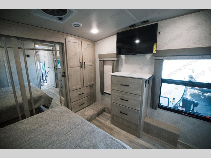 Camp in comfort with your favorite person or your friends in this spacious bedroom and bathroom fifth wheel! From the shower with a seat and linen storage to the slide out queen bed or choose a king option, you will feel right at home. The bedroom also offers a dresser, a front wardrobe with shelves, and an optional TV. The main living area provides a hide-a-bed sofa that sleeps two or choose the theater seating option, a rear kitchen with a 11 cu. ft. refrigerator to store lots of food, and a bar top with seating to dine at. You can watch the LED TV before going to bed or each morning. And the 20' awning gives you even more living space outdoors protected from the outside elements.