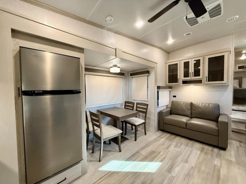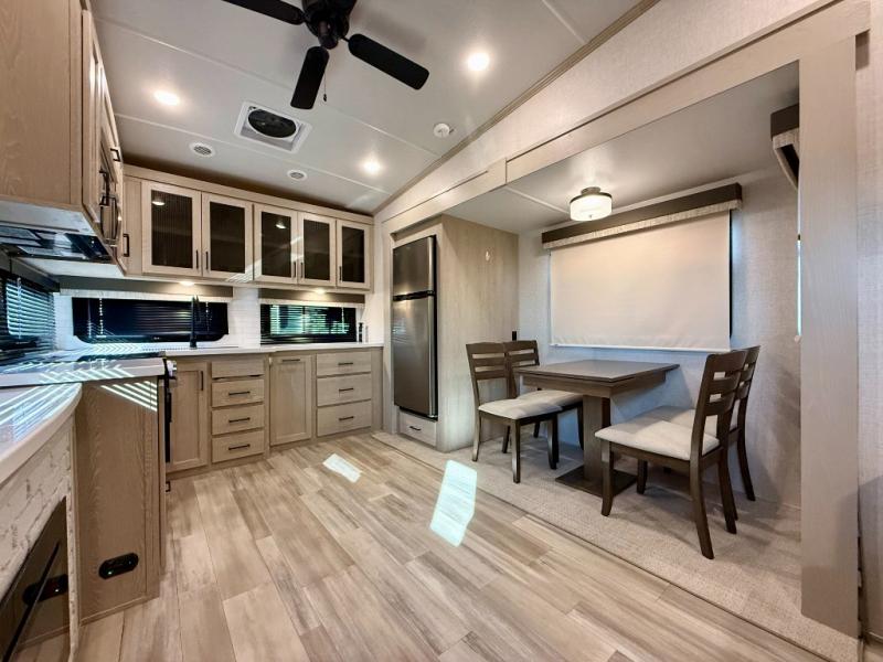 The perfect couple's fifth wheel offers privacy in a front bedroom with a queen bed, a slide out wardrobe providing more floor space, and more storage for your things. You have found it in this Flagstaff Classic! You will also appreciate the second entry into the bathroom from the bedroom, and the linen storage in the bathroom and the radius shower that saves floor space. The cook will love all the counterspace and cabinets provided in the rear kitchen and along the side wall, plus the ceiling fan can keep the air circulating when the air conditioner is off. And the king U-shaped dinette allows you to play games, dine and even work with lots of seating and table space for many to gather when you invite guests over.