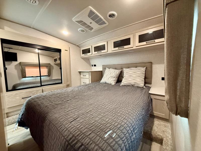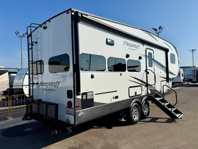 Each one of these Forest River Flagstaff Classic fifth wheels or travel trailers will be your home on wheels! Their quality craftsmanship and attention to detail shines through the surface-coated steel I-beam frame on fifth wheels, the enclosed underbelly, the radius roof with vaulted interior ceilings, and six-sided fully aluminum-framed floor, walls, and roof. Towing your unit will be easy with the torsion axle, Rubber-Ryde suspension, power tongue jack, and nitrogen-filled Goodyear Endurance tires. You will even reduce your use of water with the Showermiser water saving system in the bathroom. A few other convenient features you will enjoy include a control panel with WeRV app control, an upgraded backlit headboard, and an outside shower with hot and cold water. Come choose your favorite one today!