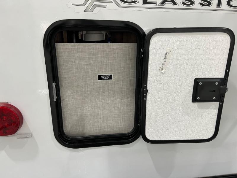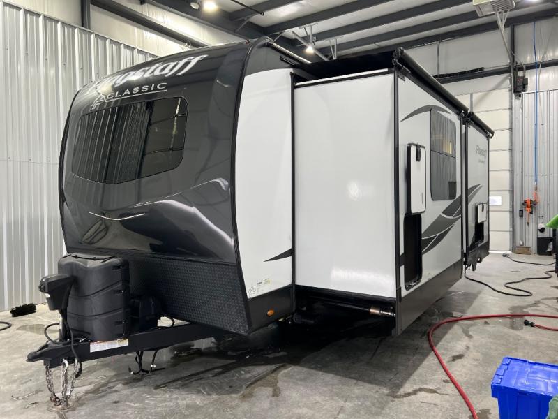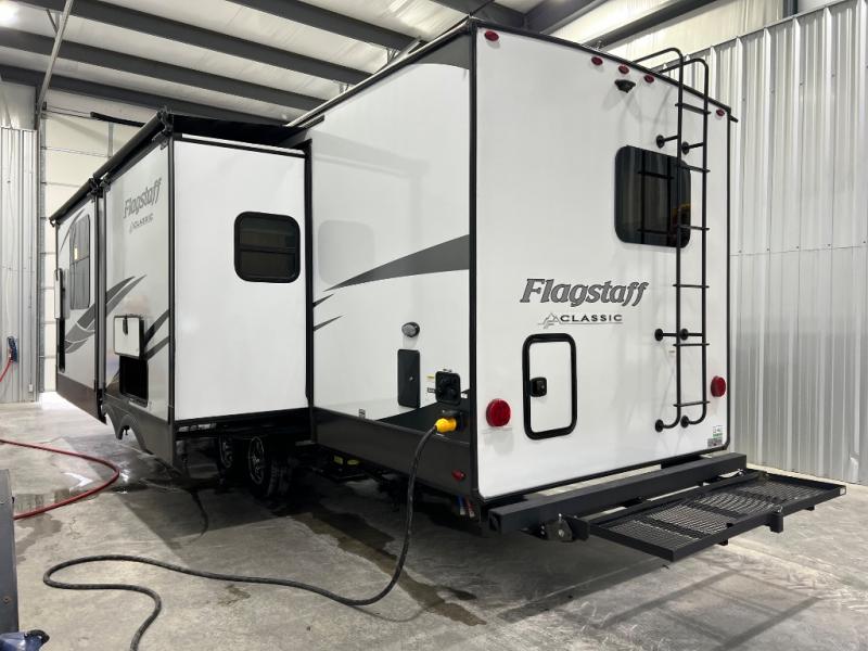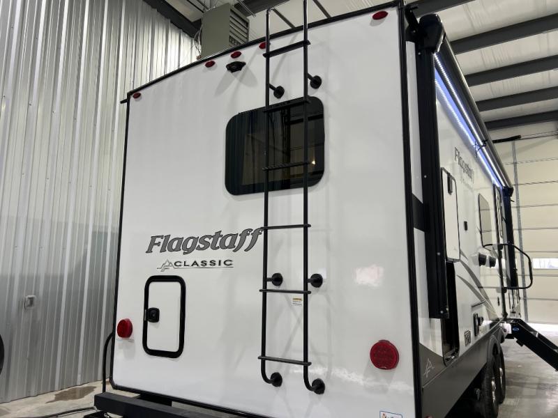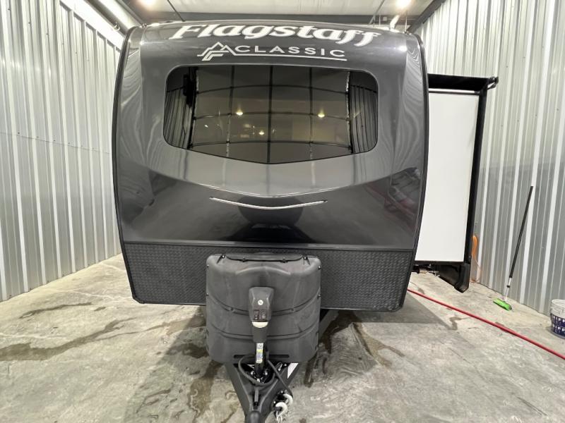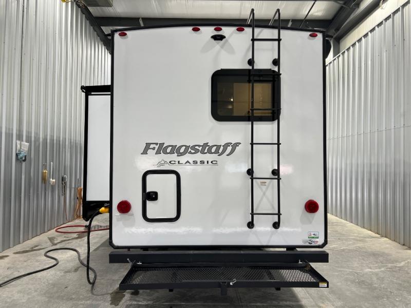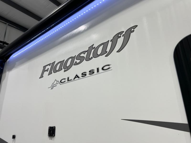 Each one of these Forest River Flagstaff Classic fifth wheels or travel trailers will be your home on wheels! Their quality craftsmanship and attention to detail shines through the surface-coated steel I-beam frame on fifth wheels, the enclosed underbelly, the radius roof with vaulted interior ceilings, and six-sided fully aluminum-framed floor, walls, and roof. Towing your unit will be easy with the torsion axle, Rubber-Ryde suspension, power tongue jack, and nitrogen-filled Goodyear Endurance tires. You will even reduce your use of water with the Showermiser water saving system in the bathroom. A few other convenient features you will enjoy include a control panel with WeRV app control, an upgraded backlit headboard, and an outside shower with hot and cold water. Come choose your favorite one today!