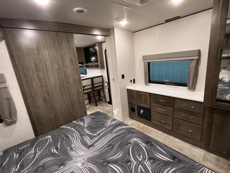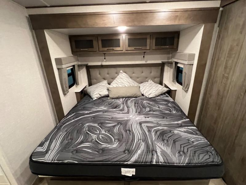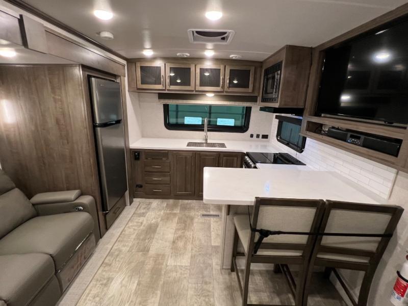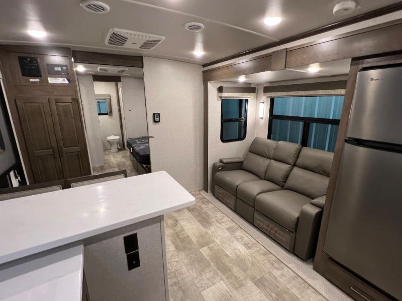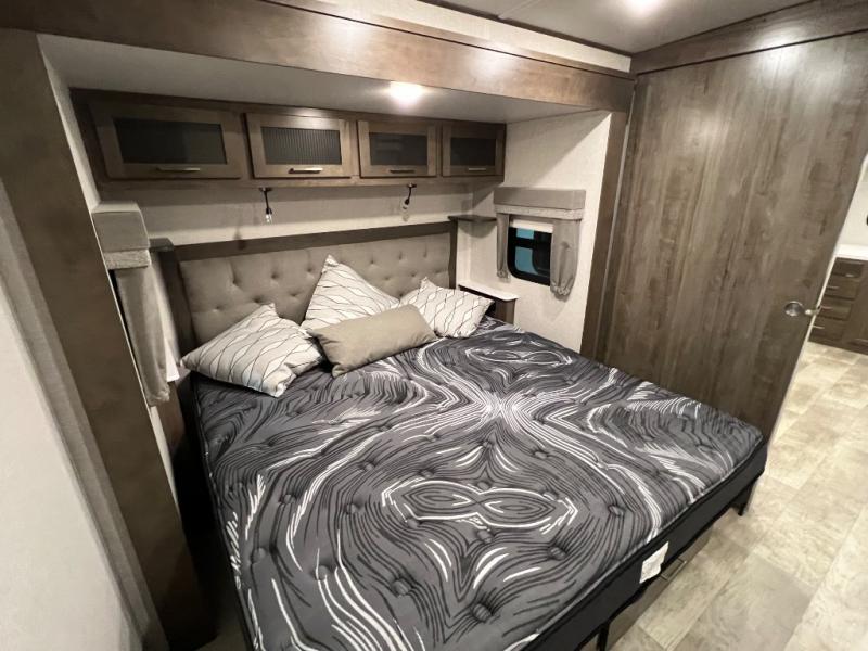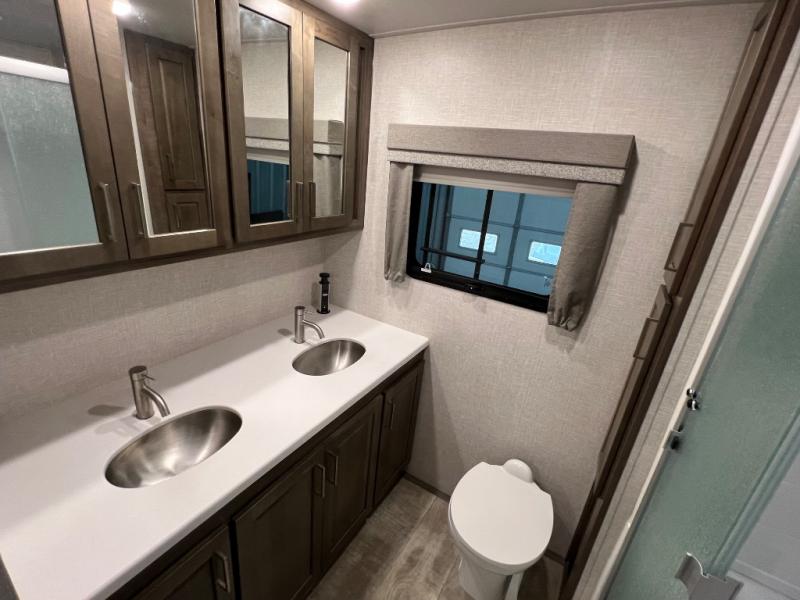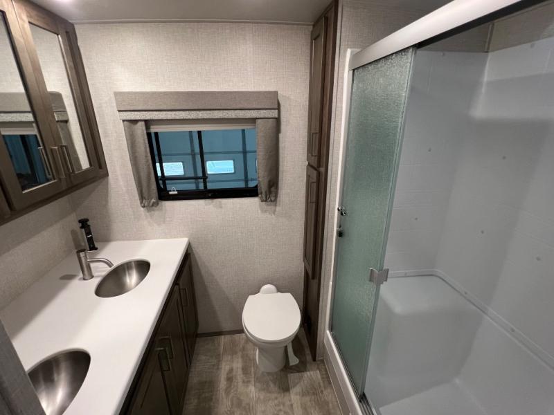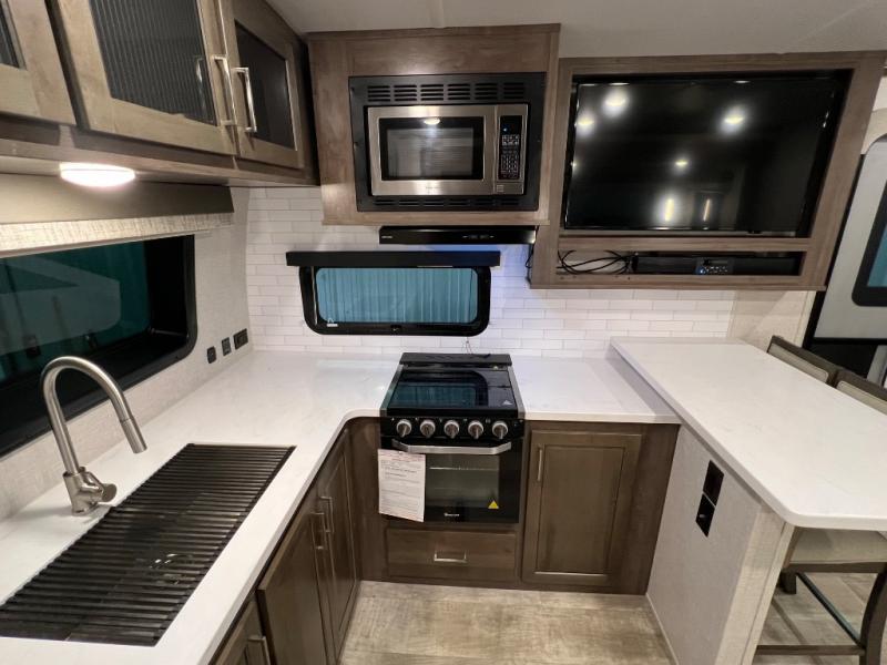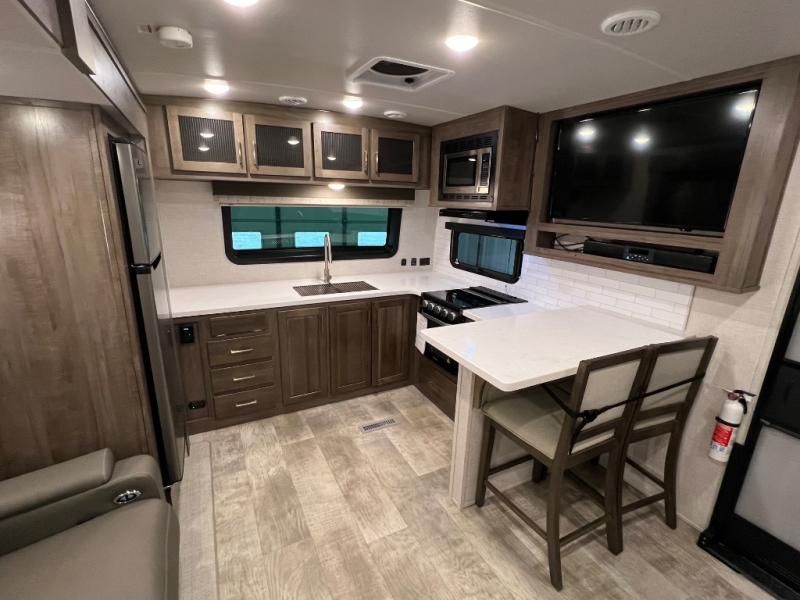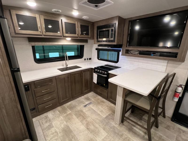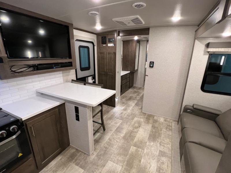 You will love how open this travel trailer will feel with the large front window that you can look out from the two-person bar top seating! The front kitchen has plenty of countertop space for you to prepare your best meals. Your nights will be spent in true relaxation with the 67" theater seating and king bed slide to lay your head. The full rear bathroom has a shower with a seat to take a nice, hot shower before bed and a dual-sink vanity for two to get ready at once in the mornings!
