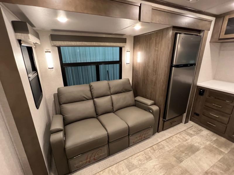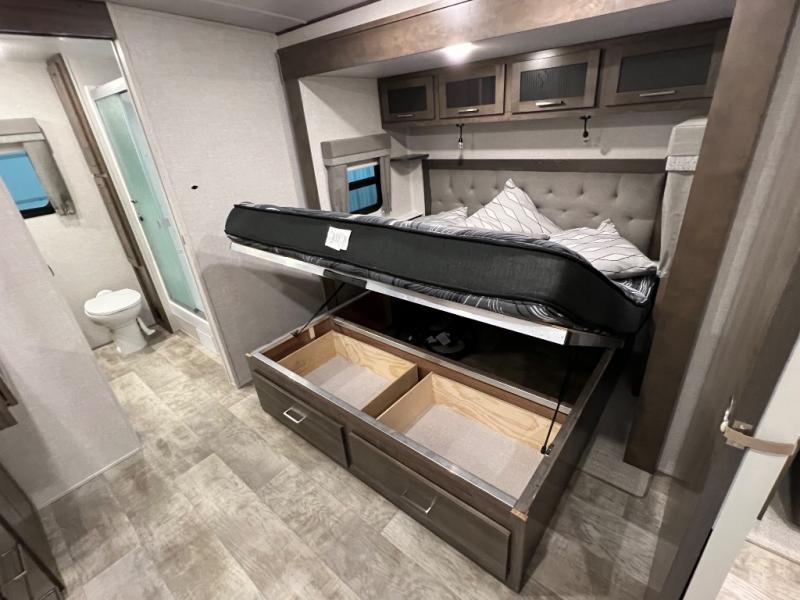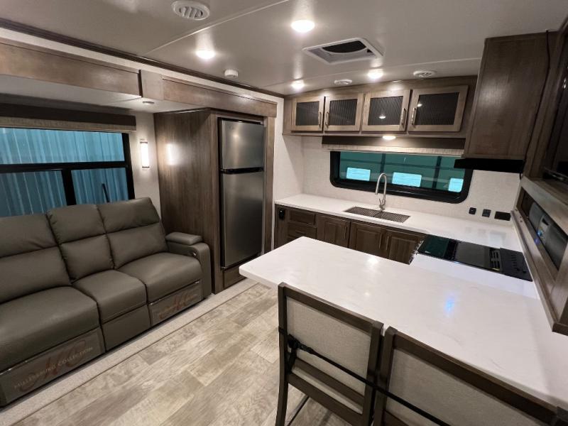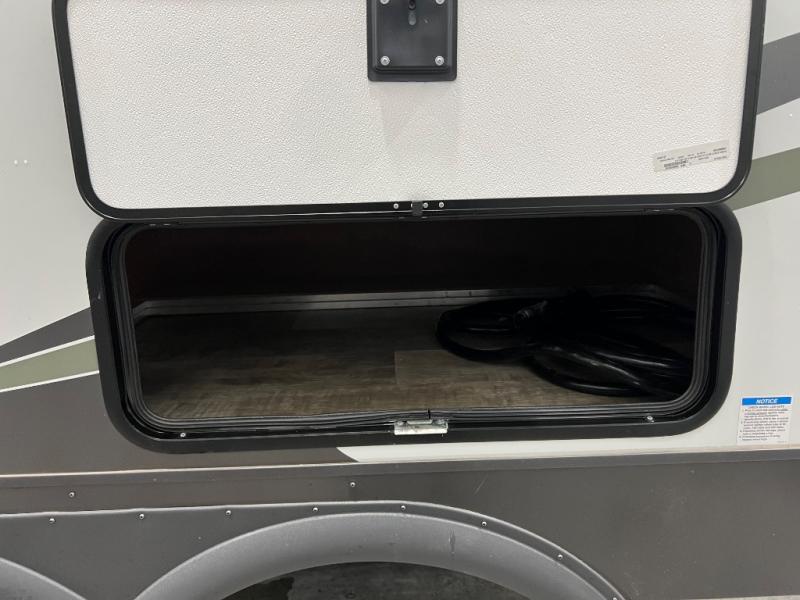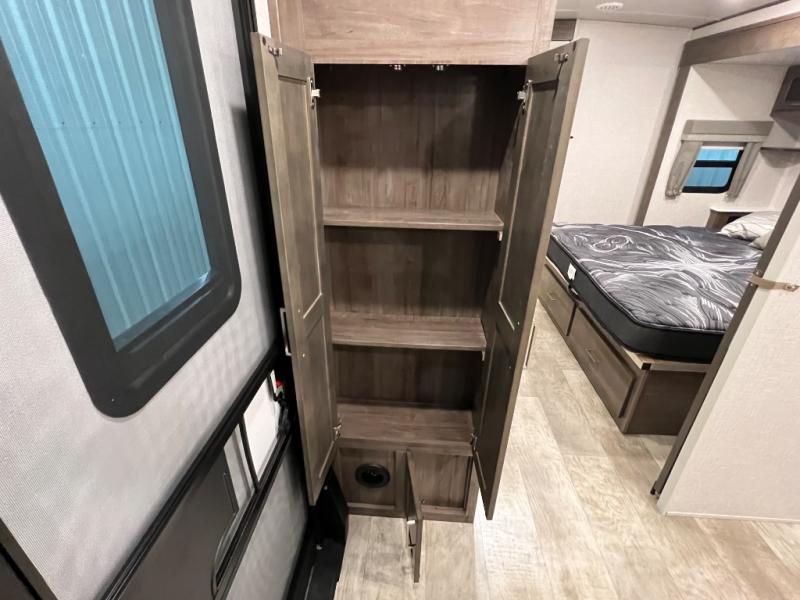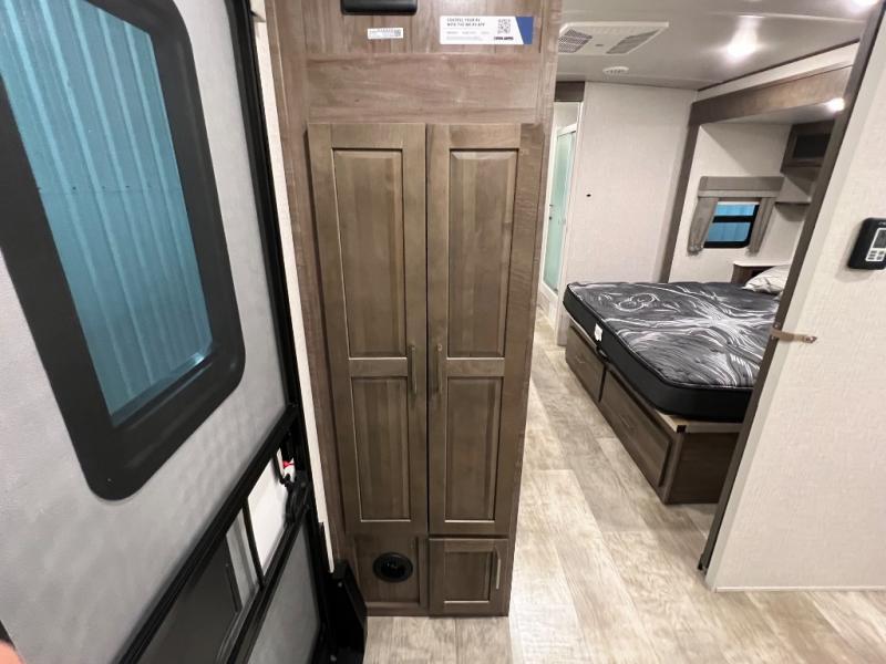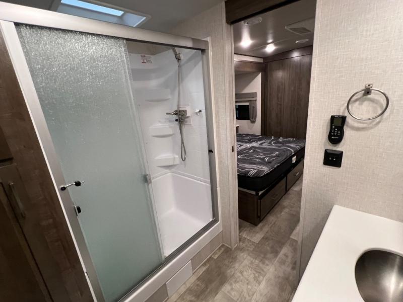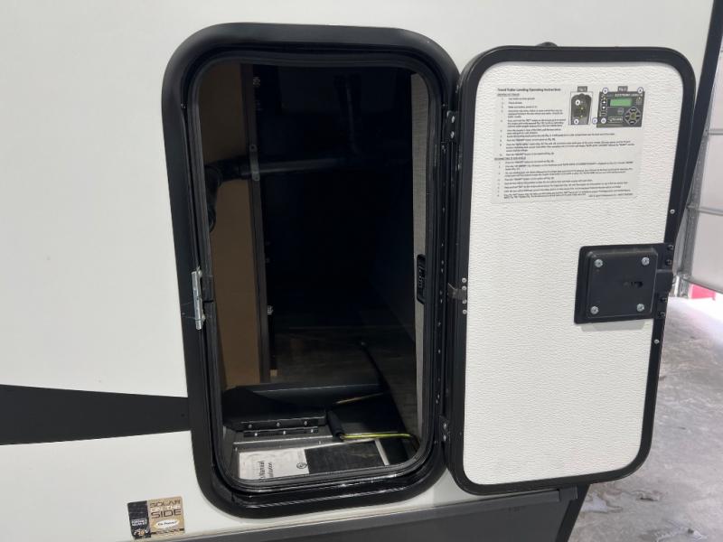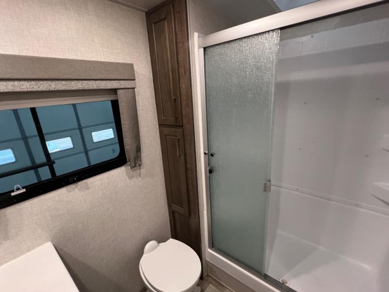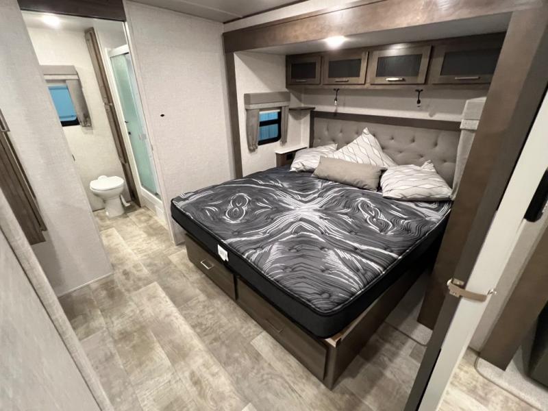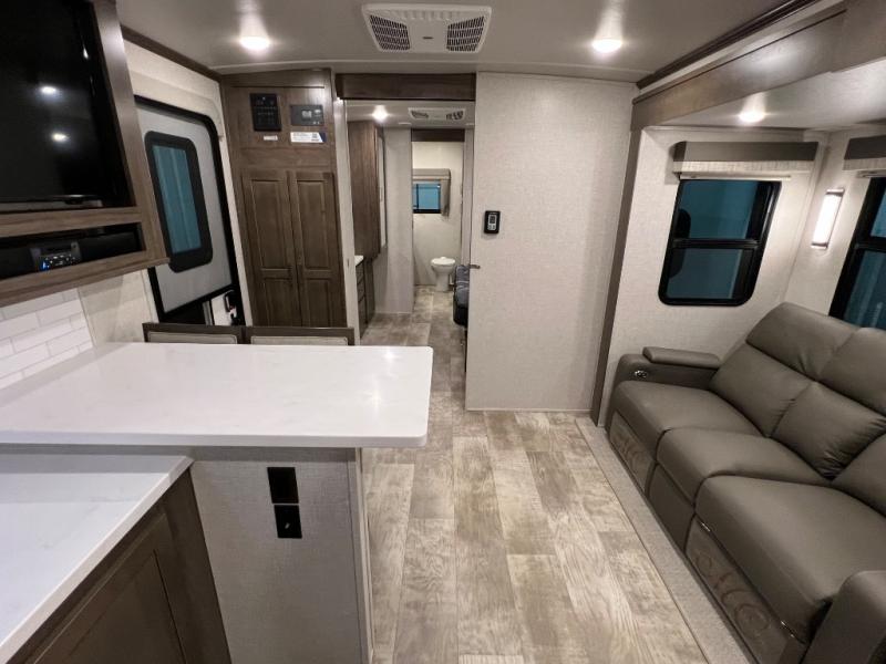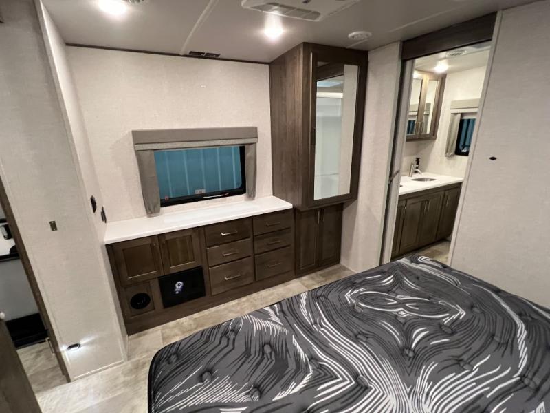 You will love how open this travel trailer will feel with the large front window that you can look out from the two-person bar top seating! The front kitchen has plenty of countertop space for you to prepare your best meals. Your nights will be spent in true relaxation with the 67" theater seating and king bed slide to lay your head. The full rear bathroom has a shower with a seat to take a nice, hot shower before bed and a dual-sink vanity for two to get ready at once in the mornings!