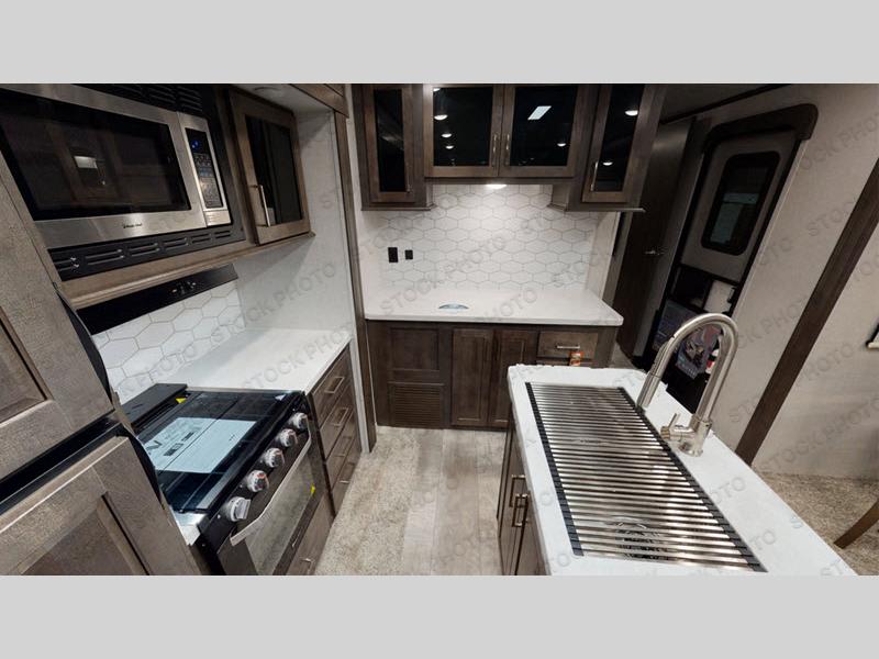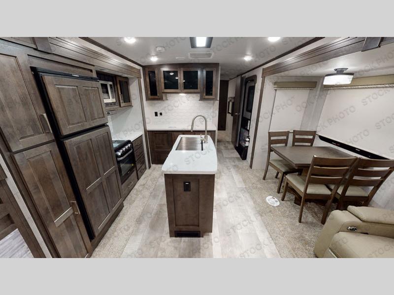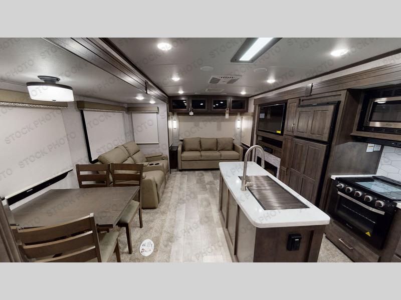 The large windows in the rear and door side slide will bring nature's scenery indoors with this travel trailer! Everyone can relax together in the rear living area with the 76" hide-a-bed sofa and the 60" theater seating across from the entertainment center with a fireplace. Meal prepping will be even easier with the kitchen island, and the 39" booth dinette is a comfortable place to enjoy your meals. The full bathroom has a shower with a seat and a linen closet to keep your towels close. You will feel well rested each morning after sleeping on the king bed slide in the front private bedroom which also has a wardrobe that is prepped to add an optional washer and dryer and an area to add an optional TV!