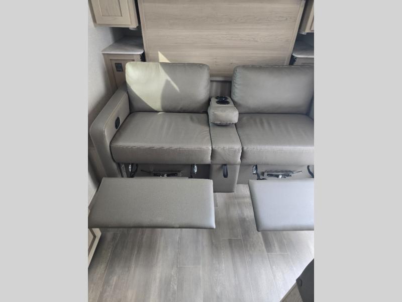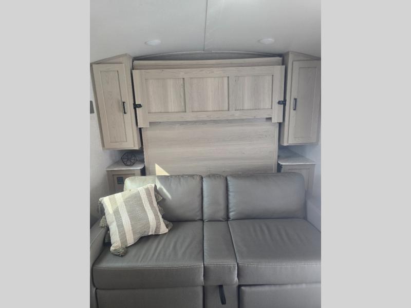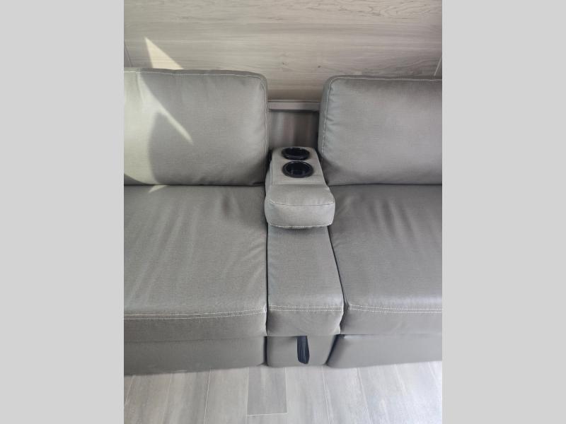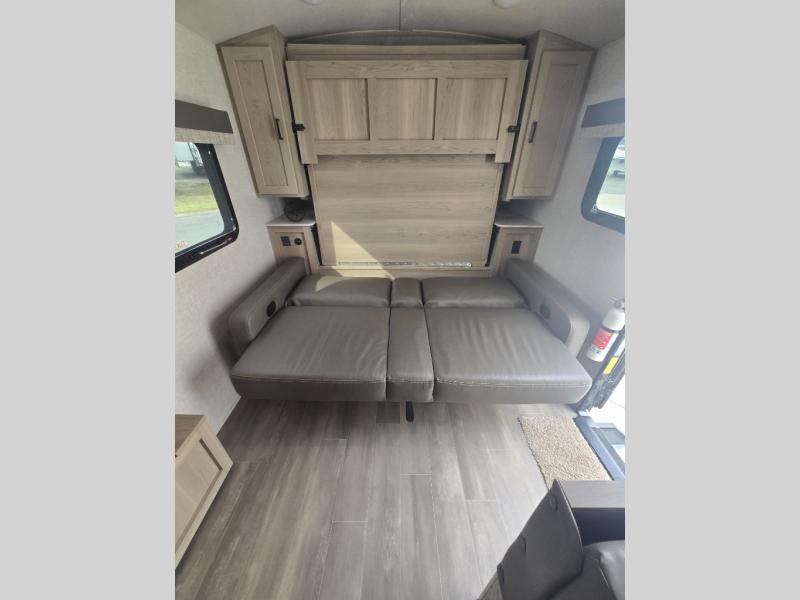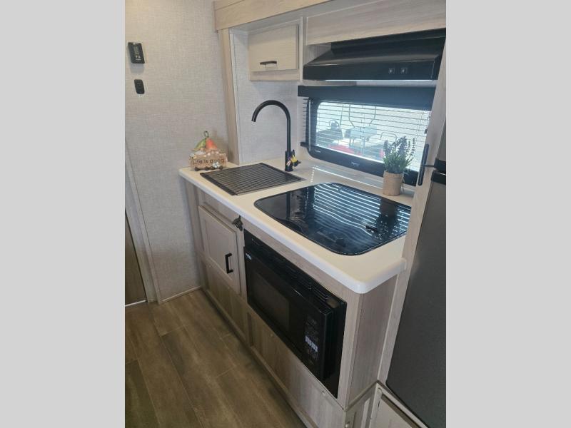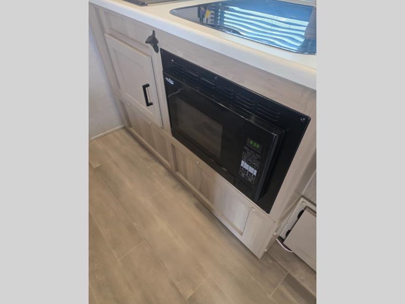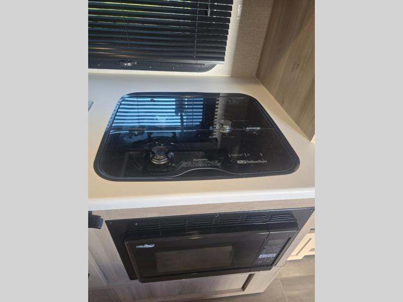 This can be the perfect couples trailer for you or your own RV with more floor space to move around thanks to the slide out sofa with a table which offers sleeping space for friends. You will have a queen bed to lay your head up front, and everyone can watch the 32" TV. The wardrobe and overhead cabinets give you clothing storage, and the kitchen cooktop and microwave allow the cook to make warm meals. And the 12V refrigerator is conveniently next to the entry so you can grab a drink on your way out to relax under the 11' power awning.