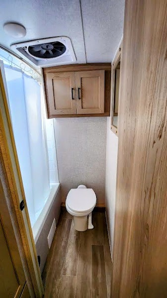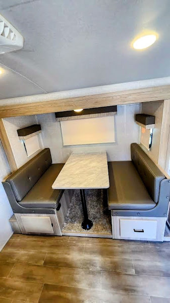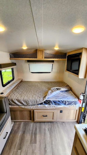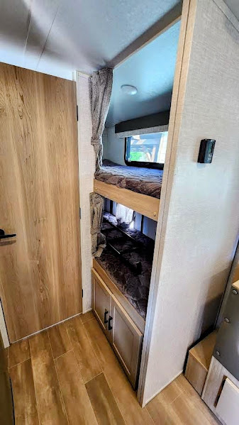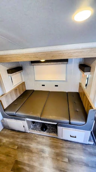 The largest bunk trailer in the E-Pro lineup will work perfectly for a family or friend group that enjoys their own sleeping space, plus more floor space with the dinette slide out that can sleep one to two. The bottom bunk even flips up so you can stow away your bikes, totes and such through the bike door for secure travels. There is exterior storage for more outdoor gear, and interior storage found throughout. The cook will love having a pantry and overhead cabinets for snacks, canned goods, dishes and more. After making a warm meal, the 12V refrigerator can hold the leftovers. The private toilet and shower/tub room gives you privacy and a place to get cleaned up after a fun day outdoors.