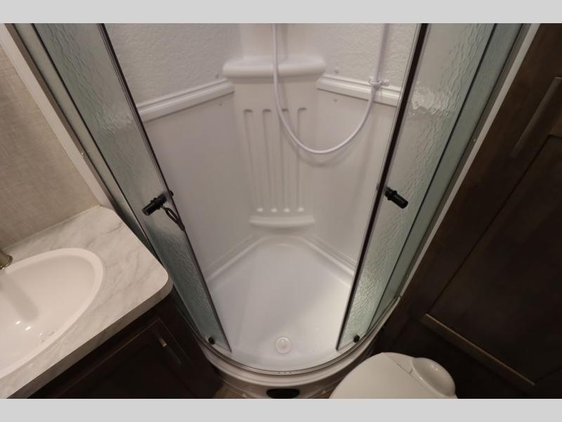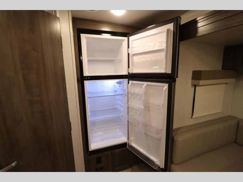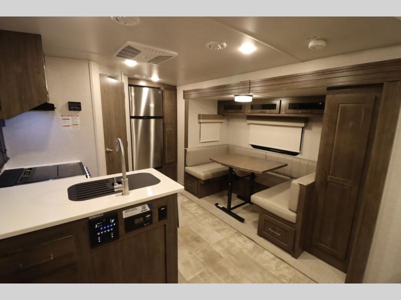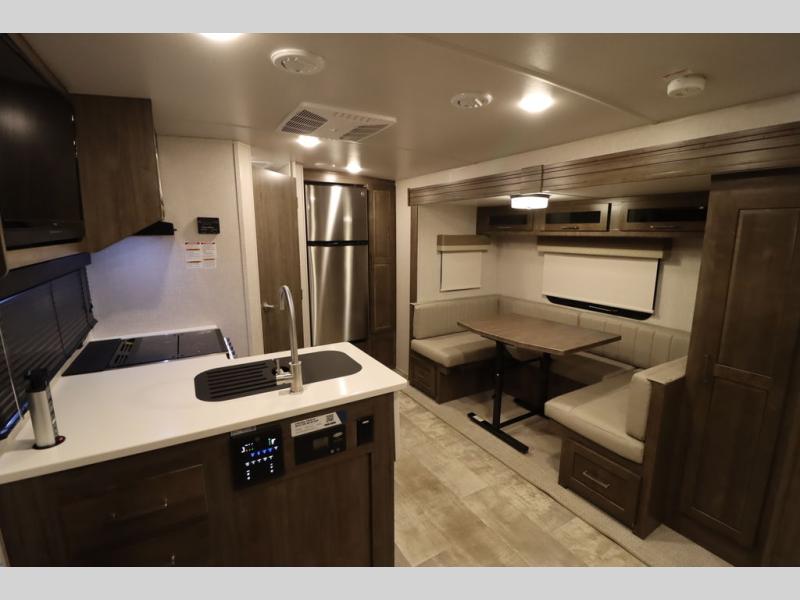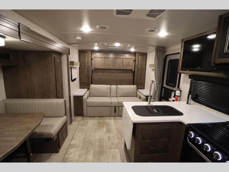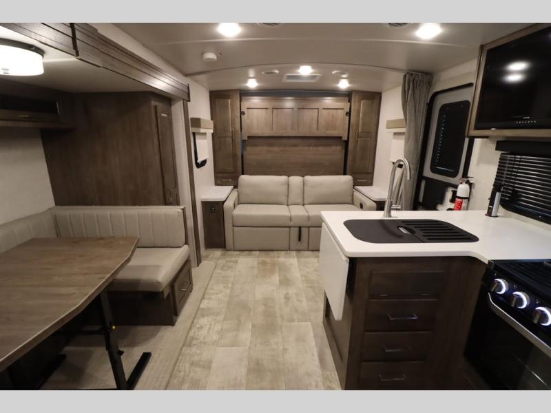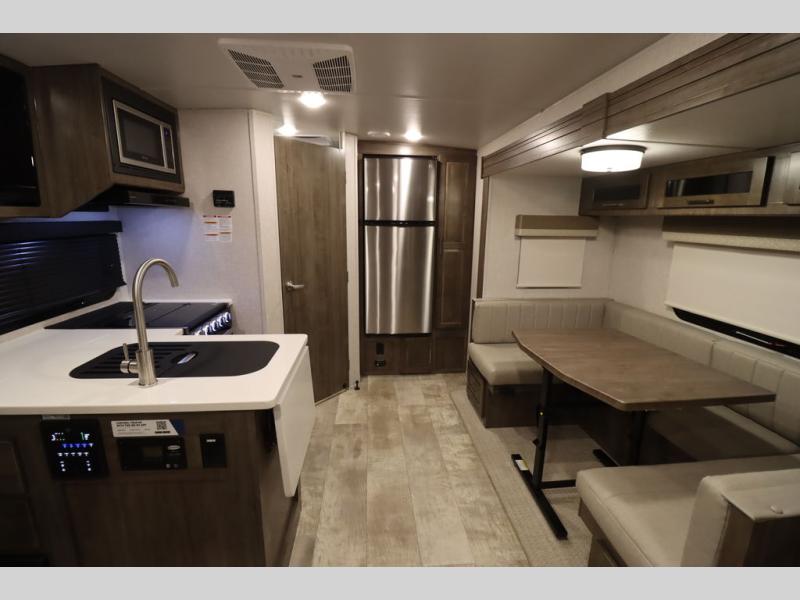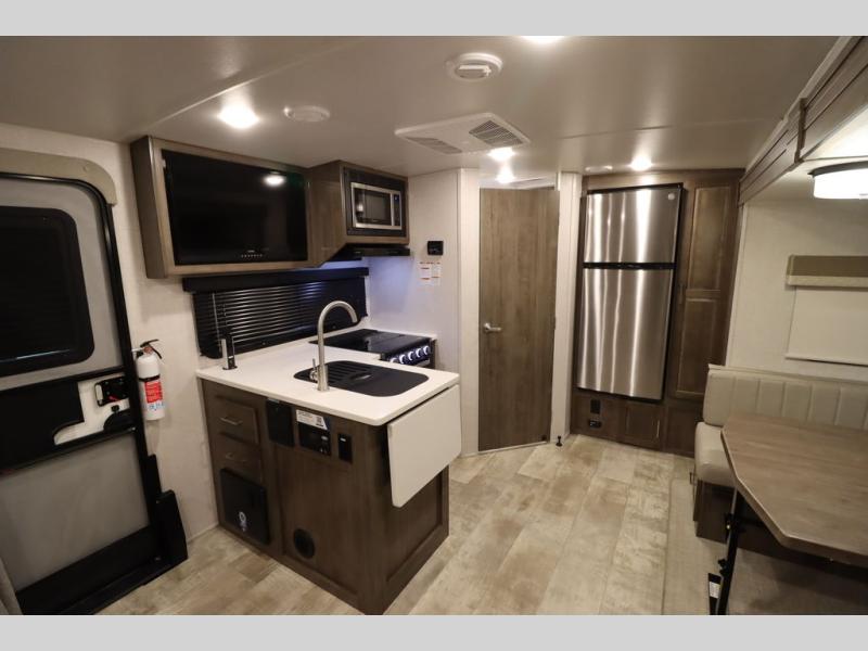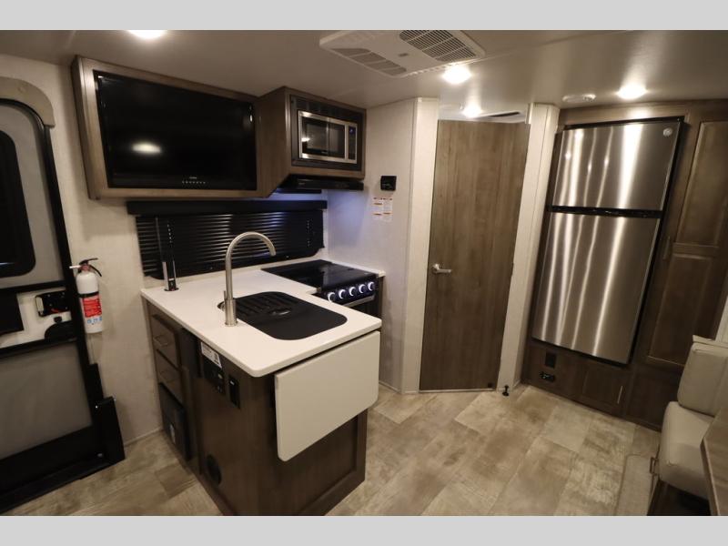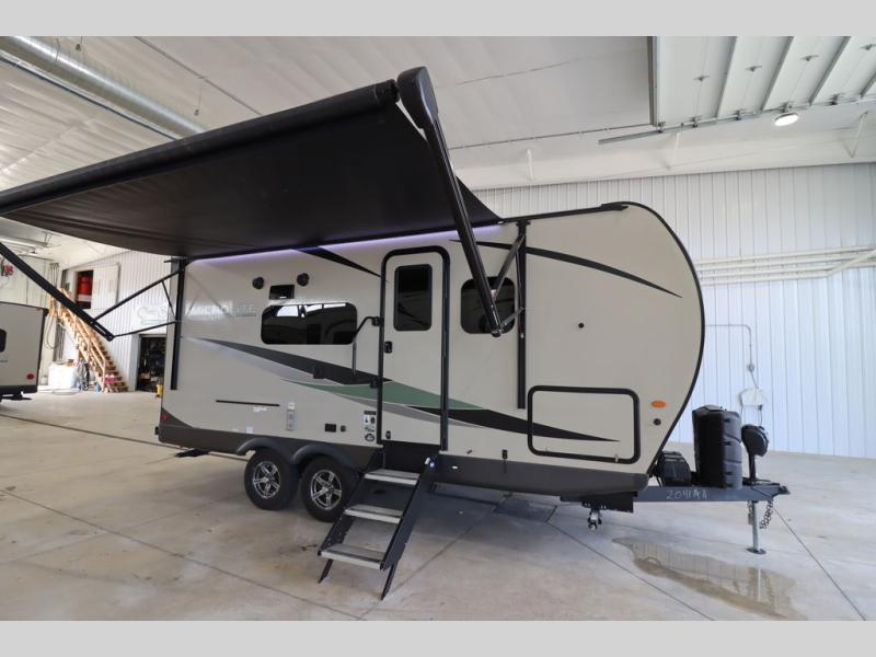 Each Flagstaff Micro Lite travel trailer by Forest River features laminated fiberglass sidewalls, sleek tinted frameless windows, and Azdel composite panels for added strength and support. You can easily tow these travel trailers with an SUV since they are so lightweight, and there is a power tongue jack for quick and easy set up. Some of the convenient amenities you will enjoy are the Teton All-In-One WiFi booster/LTE prep and antenna, the double battery boxes, Key-Alike locks, plus a Maxxair fan with a cover to keep the fresh air moving in your RV. You will love the modern look of the Newport Ash or Autumn Wood cabinetry, plus there are solid wood cabinet doors, solid surface kitchen countertops, and a Showermiser water saving system in the bathroom. Choose a Flagstaff Micro Lite travel trailer and you won't be disappointed!