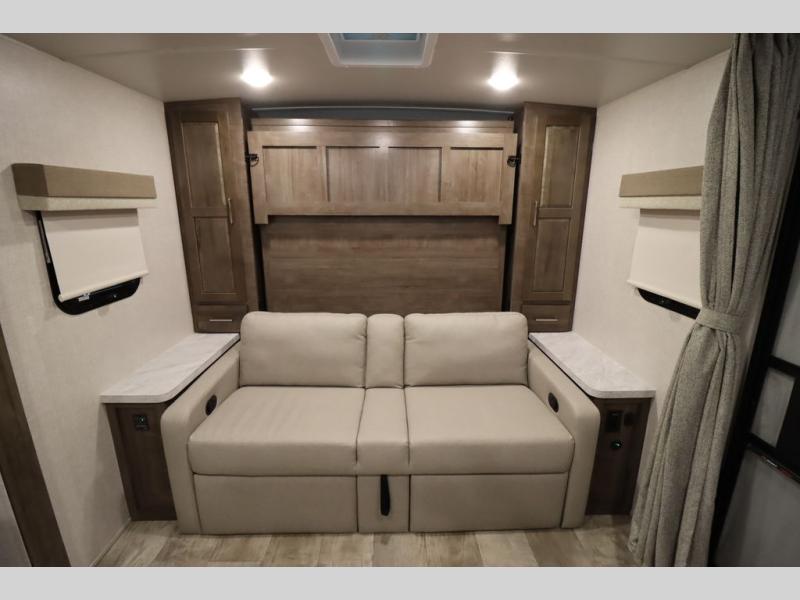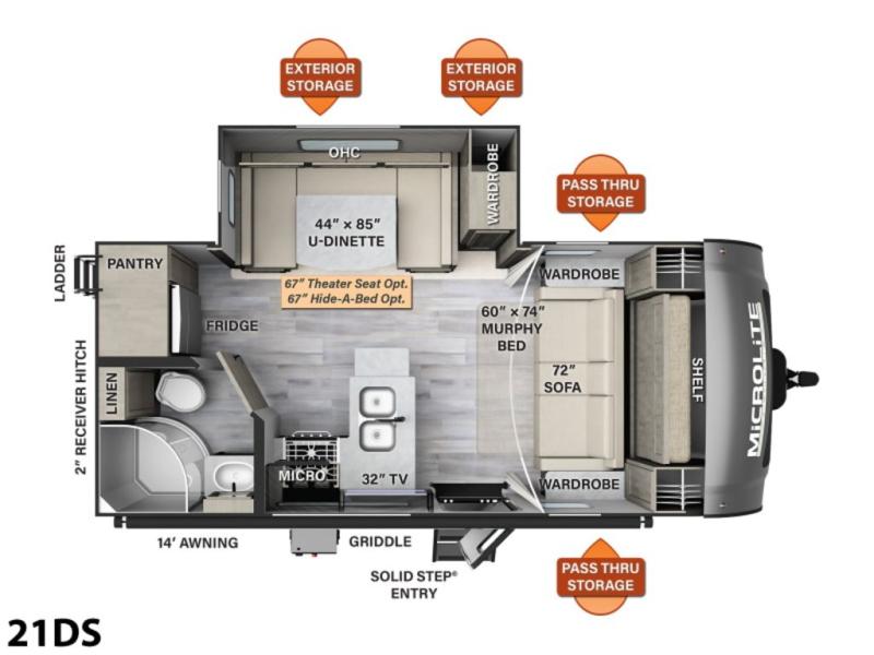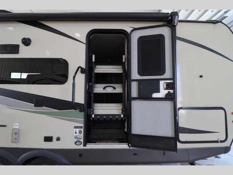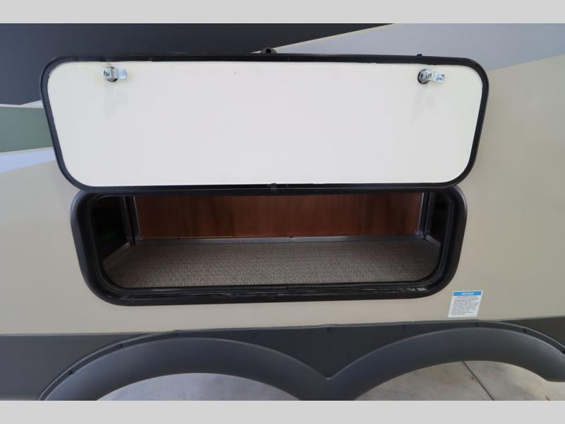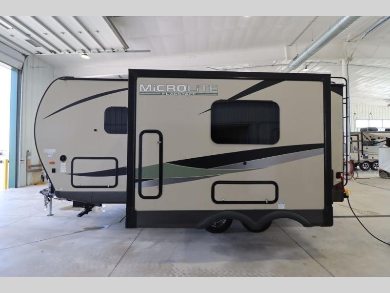 Pack your bags and get ready for your next camping trip with this Flagstaff Micro Lite travel trailer. You will enjoy the space the single slide provides, and within the slide is a U-shaped dinette where you can enjoy your meals. Fold out the Murphy bed each night for a good night's rest, and in the morning you can fold it away and enjoy a cup of coffee on the sofa. This unit features a kitchen with a three-burner cooktop and a microwave, and you'll appreciate a pantry for snacks. Bring along the extra lawn chairs in the pass-through storage, and there is also an exterior storage for your luggage or tackle boxes