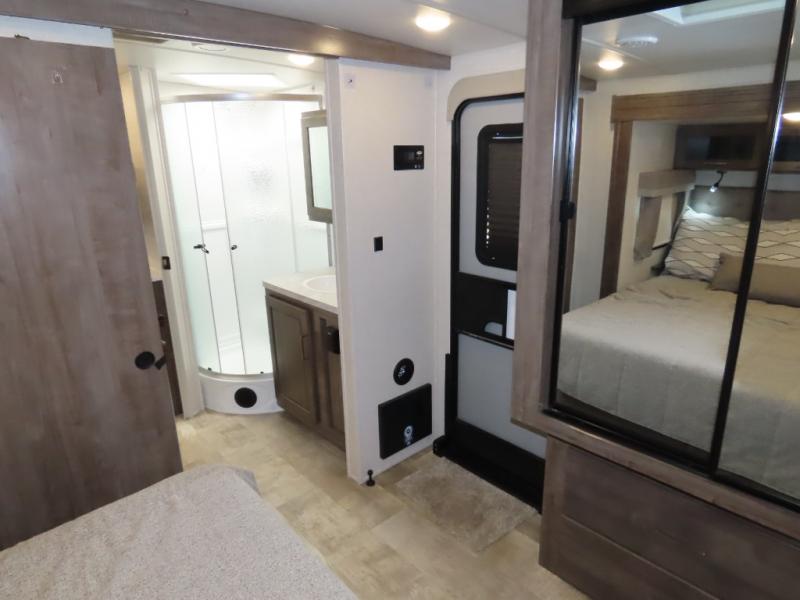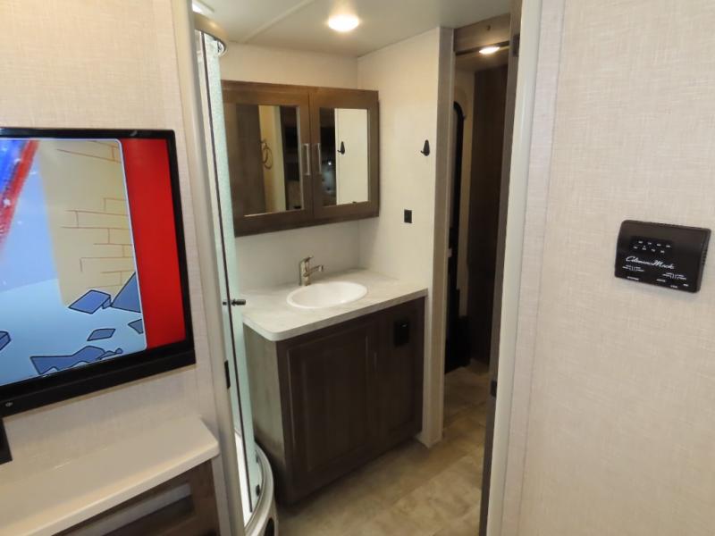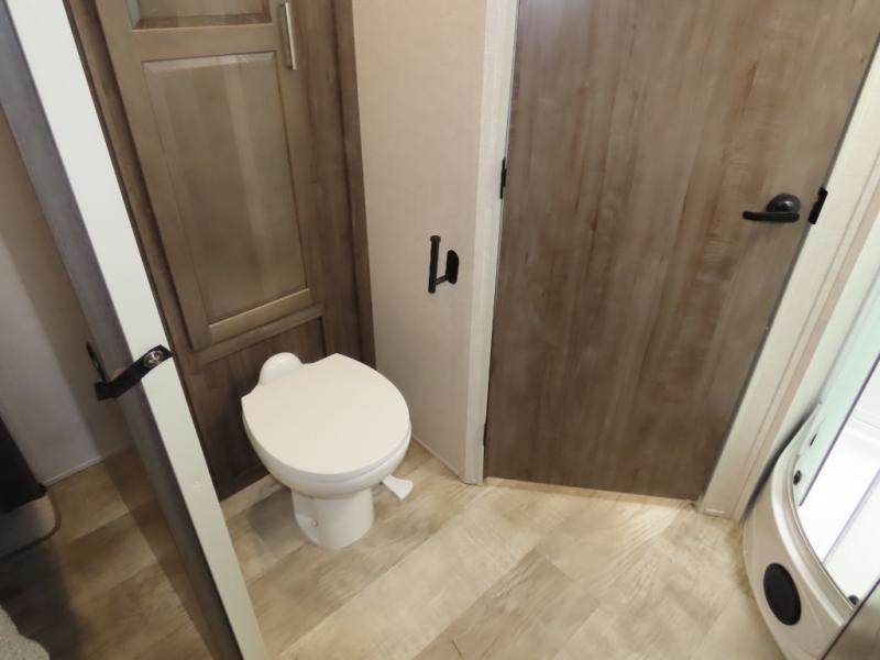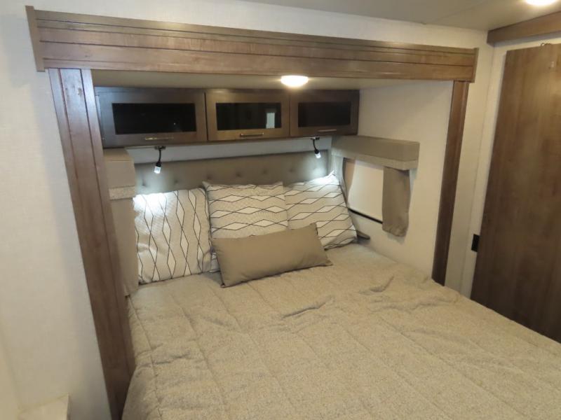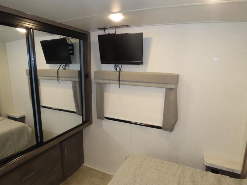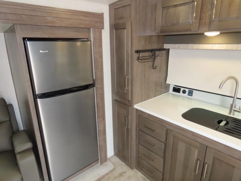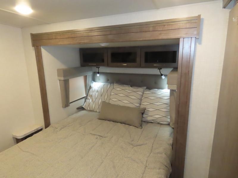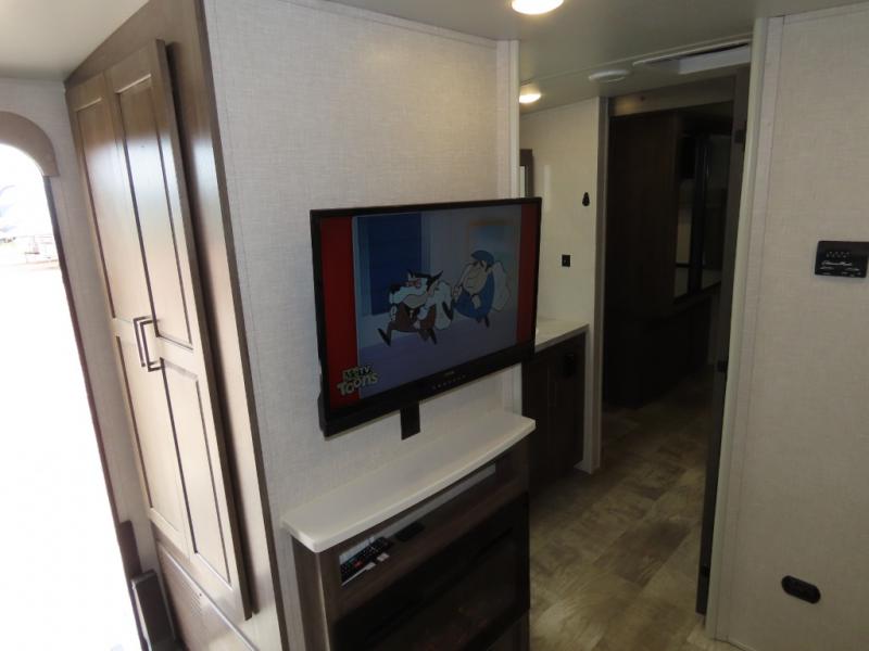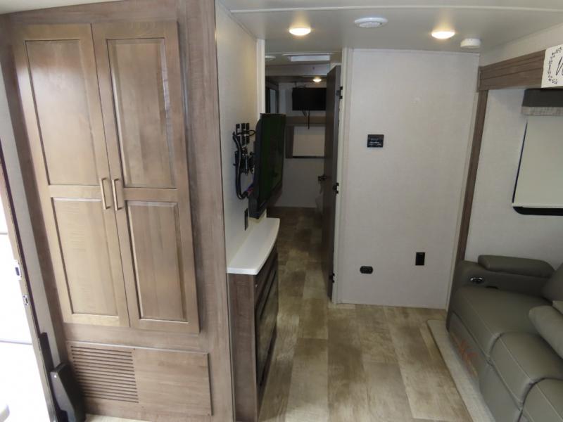 With a queen bed slide and a large wardrobe in the private bedroom, you will have all that you need for sleeping and storing your belongings. Plus, the second exterior entry door leads right into the bedroom so that you can escape for an early morning run without running through the entire trailer to get outside. The front kitchen is open and accommodating with its helpful tools, and the 67" theater seat is right next to the double-door refrigerator on the slide out. Right next to the front entry door is a coat closet so that you can keep your jackets readily available, and there is also a linen closet in the walk-through bath so that you can keep your towels ready for your shower.