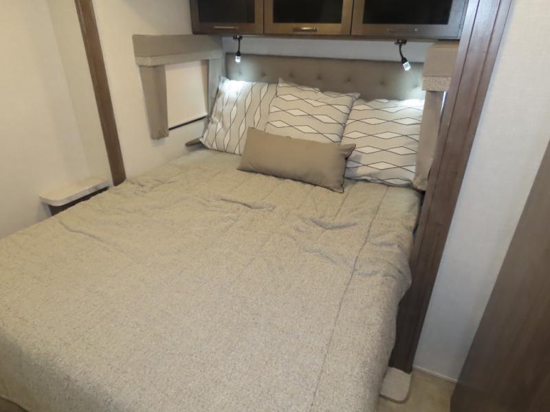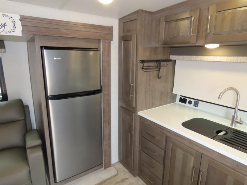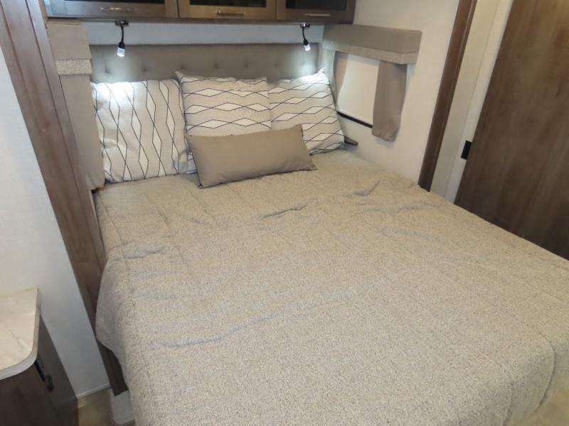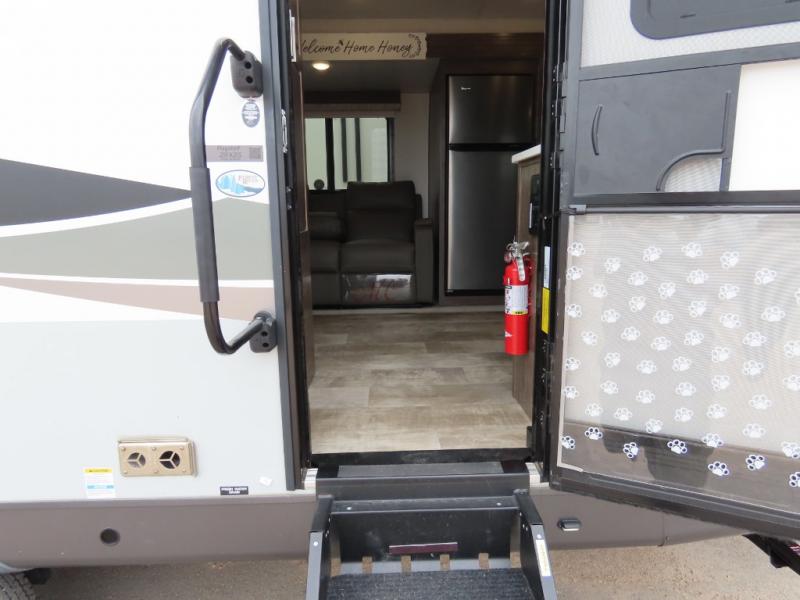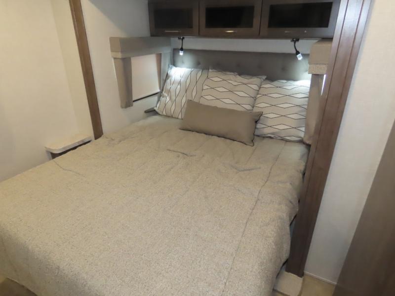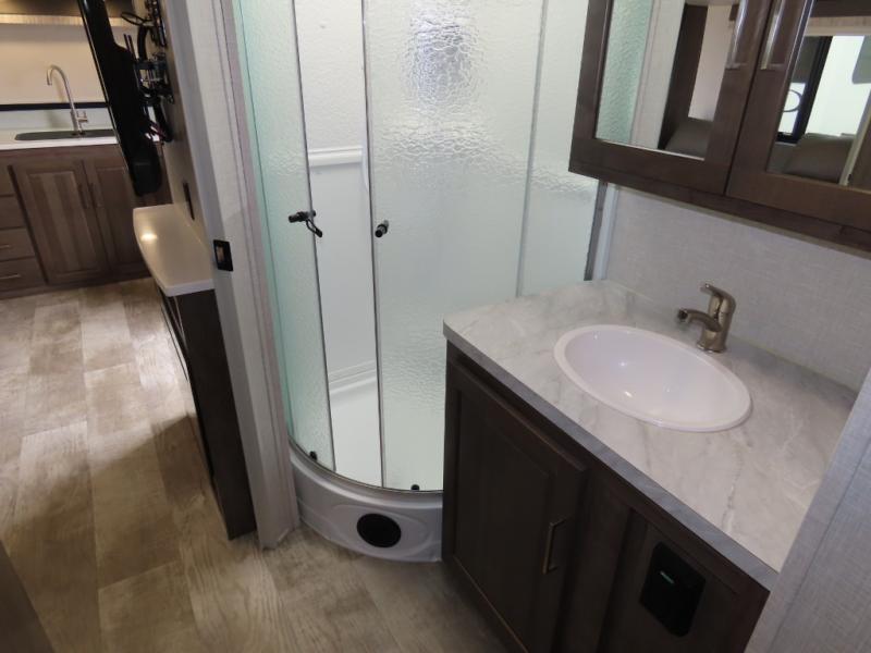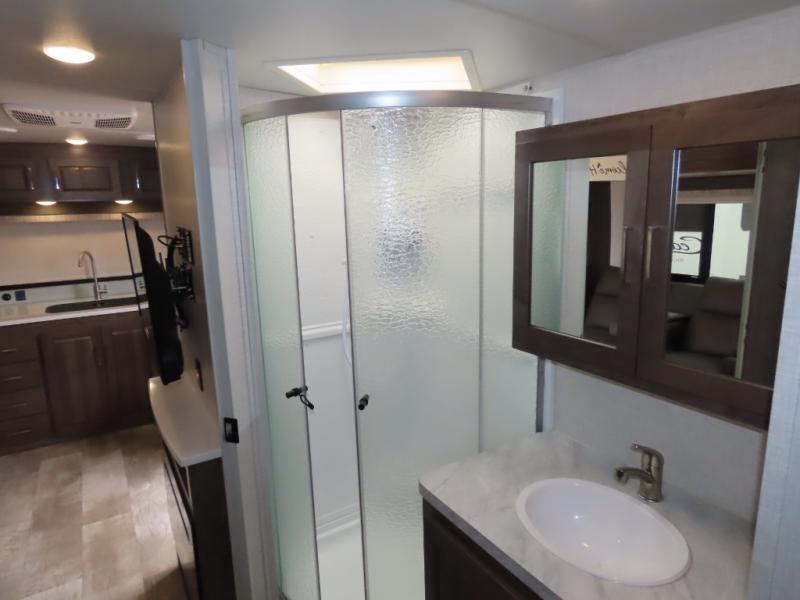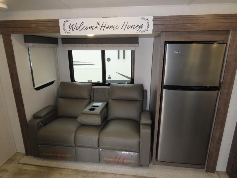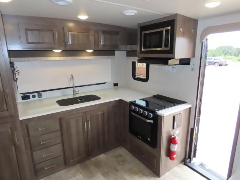 With a queen bed slide and a large wardrobe in the private bedroom, you will have all that you need for sleeping and storing your belongings. Plus, the second exterior entry door leads right into the bedroom so that you can escape for an early morning run without running through the entire trailer to get outside. The front kitchen is open and accommodating with its helpful tools, and the 67" theater seat is right next to the double-door refrigerator on the slide out. Right next to the front entry door is a coat closet so that you can keep your jackets readily available, and there is also a linen closet in the walk-through bath so that you can keep your towels ready for your shower.