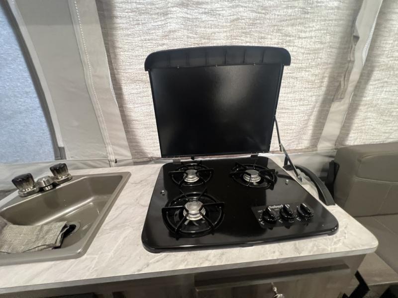 If you are serious about your love for the great outdoors, this Flagstaff SE folding pop-up camper will allow you to get out there and explore! You can enjoy a night of camping out underneath the stars as you sit around the campfire, roast some marshmallows, or use the exterior griddle to add to your snacks. Keep your 8' 6" awning folded out to protect you from any sporadic rain that may show up while you're outside breathing in the fresh air. When you do come inside, you'll be able to continue the stargazing from one of the two tent beds as you drift off to sleep, and in the morning, you won't have to start a fire in order to prepare breakfast. Just use the three-burner range for your coffee percolator and your pan of flapjacks.