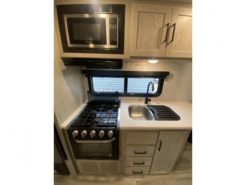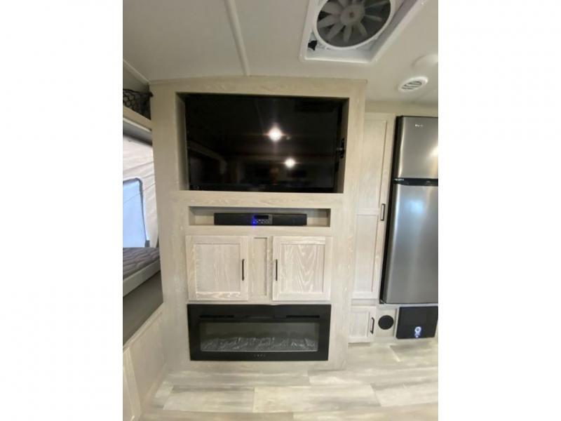 You will feel right at home in this spacious expandable thanks to the large slide out and the fireplace with an LED TV. There is a full kitchen with a three burner cooktop, a 12V refrigerator, plus a microwave oven, and if you enjoy cooking outdoors, you're going to love the outside kitchen! You'll also find an 18' power awning outdoors, along with three exterior storage compartments and Solid Step entry steps.