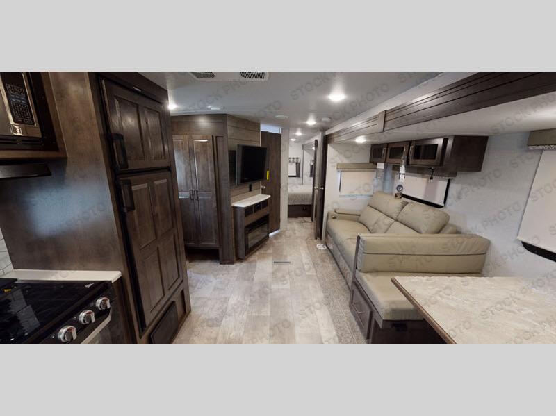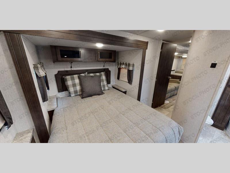 This is the perfect couples trailer with a spacious living and kitchen area and a rear bedroom which includes the second exterior entry/exit door! The bedroom also provides a slide out queen bed, a wardrobe and an optional TV, plus windows for great views and access to the double entry bathroom. The front kitchen gives the cook counter space and cabinetry for dishes and such, plus all the appliances needed to make warm meals and store leftovers. You can dine at the booth dinette, relax on the 67" theater seating and watch the LED TV while enjoying the fireplace.