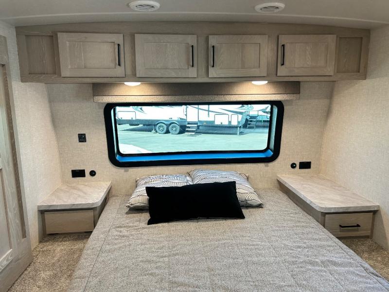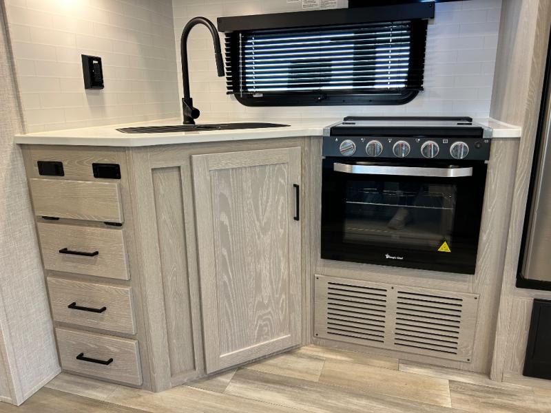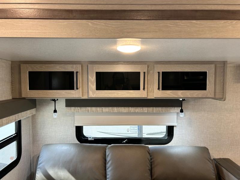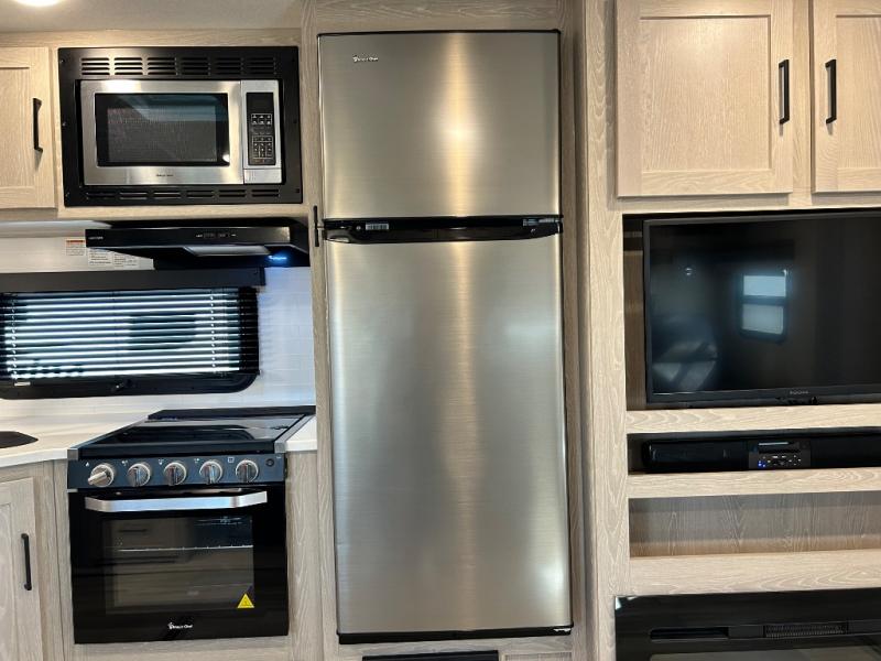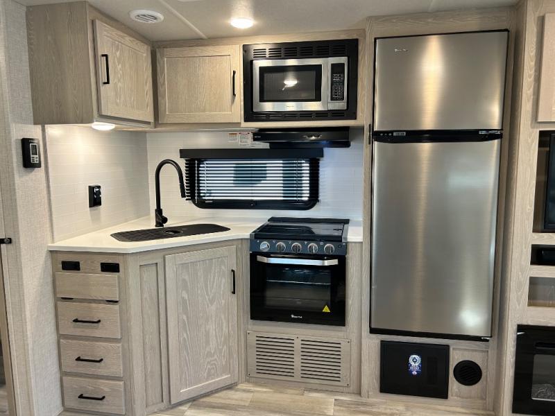 Enjoy inside comforts, and outside conveniences in this trailer. You can relax under the 21' awning which offers an outdoor living area protected from the elements, and a front drop frame pass-through storage allowing you to take camping chairs, tables, fishing poles and such. Enjoy privacy in the rear full bathroom with a space savings sliding door, and a spacious living and kitchen area thanks to the slide out with furniture that also doubles as sleeping space for your kids or guests. The cook will have full amenities to make meals, and when you are ready to sleep, head to the front bedroom with a queen bed and plenty of storage, and a slide out giving you more floor and storage space.