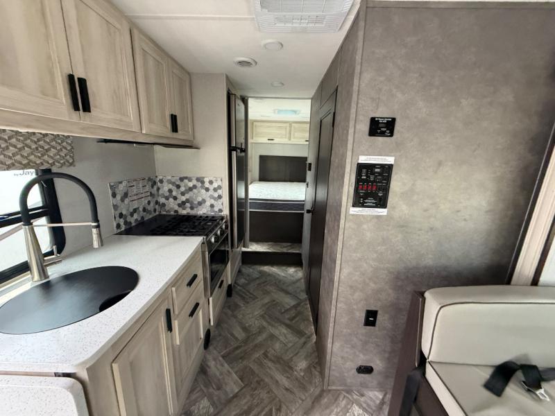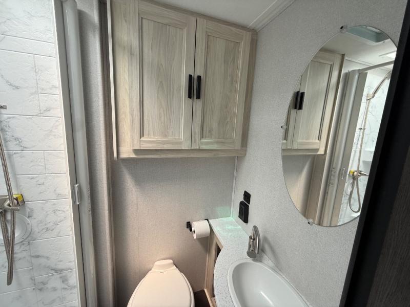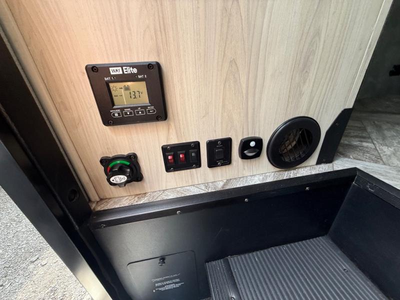 This flush floor bedroom and living area is spacious and inviting with a slide out sofa and booth dinette across from the kitchen amenities. The kitchen offers a 10.7 cu. ft. 12V refrigerator, a convection microwave, and a recessed three-burner range. You will also find the 12V TV with work station below and a pantry. More storage can be found in the linen cabinet next to the rear bathroom plus there is a wardrobe in the rear bedroom. You'll get a great night's rest on the queen bed slide out and your guests can sleep on the cab-over bunk or living area furniture.
