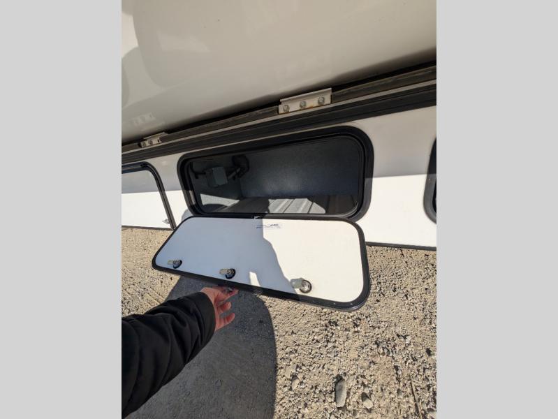 You will feel right at home traveling in this motorhome! The full rear bathroom has a 24" x 36" shower to freshen up in, plus storage space and a private toilet so you both can use this room at once. Inside the bedroom is a 60" x 74" queen bed slide for more space, and a 12V TV for movies in bed. Prepare your best meals with the three burner cooktop and the 10.7 cu. ft. 12V refrigerator or throw some leftovers in the undermount 1.3 cu. ft. convection microwave then enjoy it at the U-shaped dinette slide. The 60" x 80" bunk over cab mat offers a comfortable place to sleep but if you don't need the extra sleeping space, you can switch it out for the optional Trekker cap with a built-in entertainment center, plus there is an optional outside 12V TV to add!
