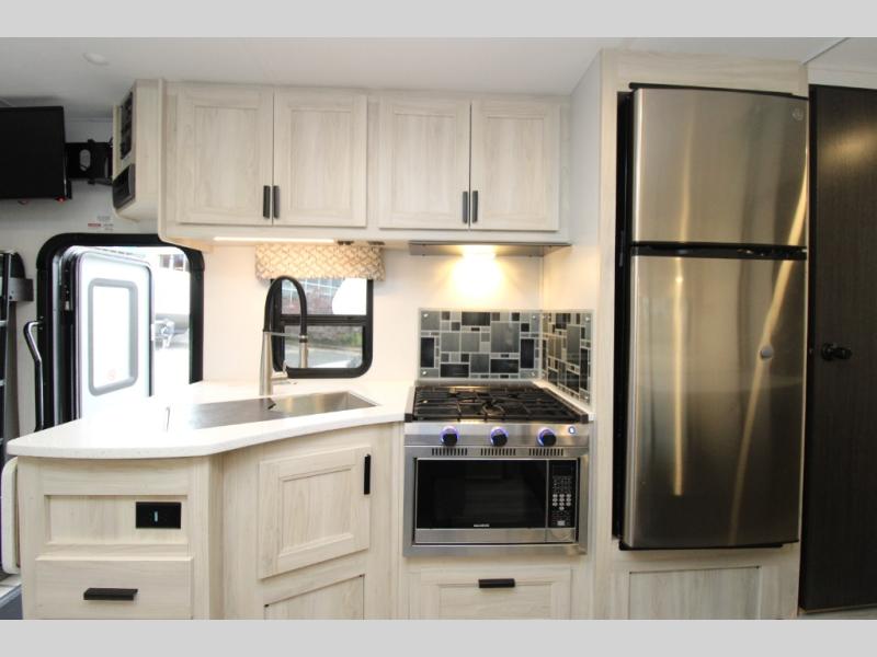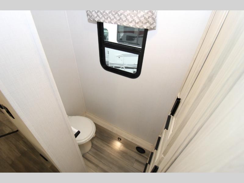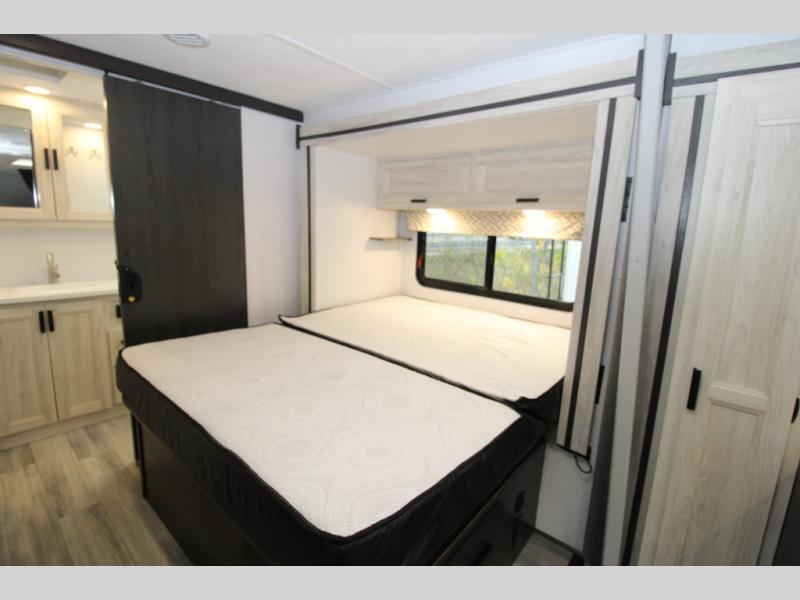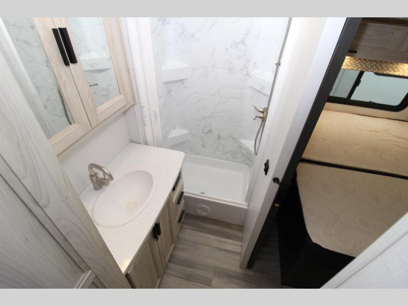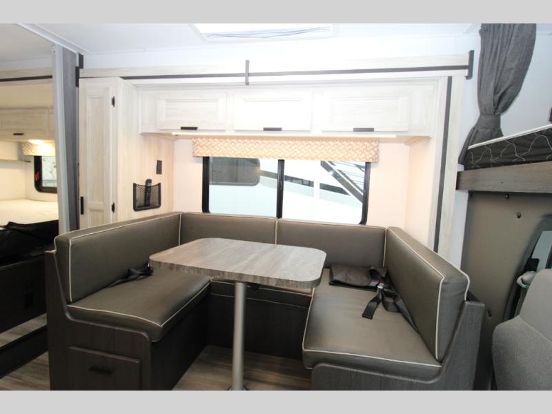 You will feel right at home traveling in this motorhome! The full rear bathroom has a 24" x 36" shower to freshen up in, plus storage space and a private toilet so you both can use this room at once. Inside the bedroom is a 60" x 74" queen bed slide for more space, and a 12V TV for movies in bed. Prepare your best meals with the three burner cooktop and the 10.7 cu. ft. 12V refrigerator or throw some leftovers in the undermount 1.3 cu. ft. convection microwave then enjoy it at the U-shaped dinette slide. The 60" x 80" bunk over cab mat offers a comfortable place to sleep but if you don't need the extra sleeping space, you can switch it out for the optional Trekker cap with a built-in entertainment center, plus there is an optional outside 12V TV to add!