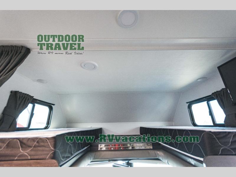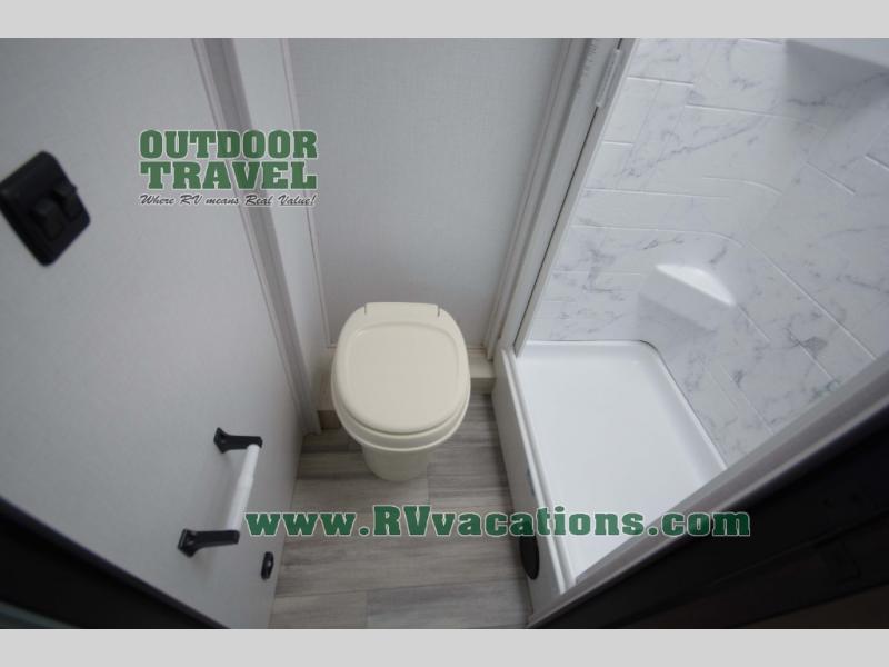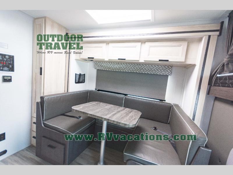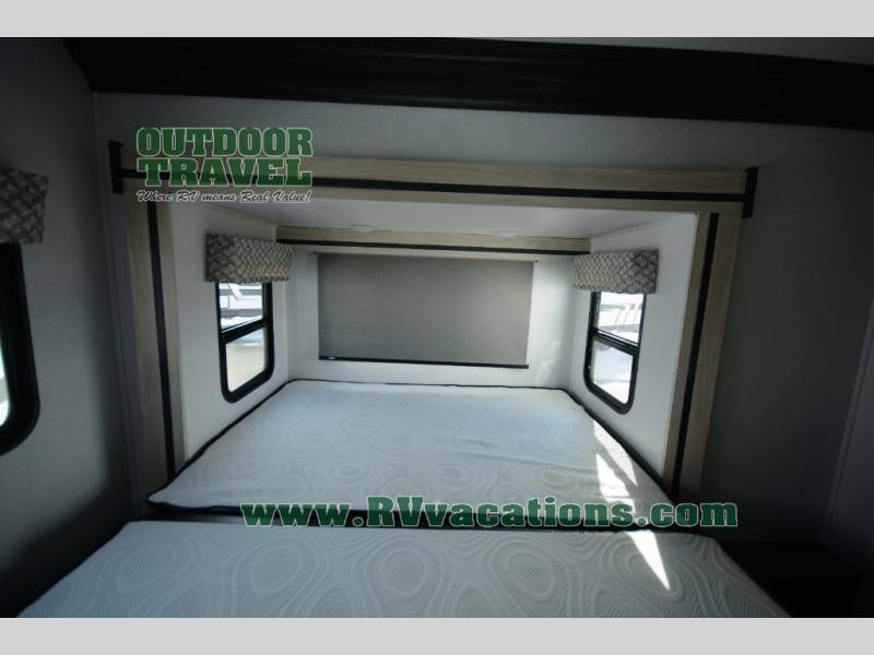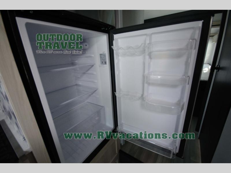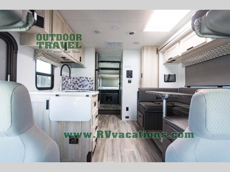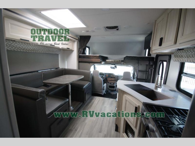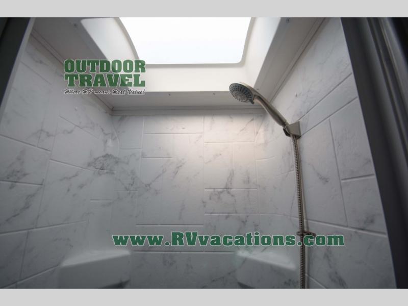 This motorhome has everything you will need for a fun and comfortable road trip! The rear private bedroom has a queen bed slide, a 12V TV, and a wardrobe to keep your clothes looking nice. Plus, it leads into the separated bathroom which has a private shower and a toilet across from a sink with a medicine cabinet. The 10.7 cu. ft. 12V refrigerator is big enough to store your perishables, the flip-up countertop will make meal prepping easier, and the three burner cooktop is just waiting for you to fry up some bacon. Enjoy all of your meals and game nights at the U-shaped dinette slide then transform it into an extra sleeping space if needed. Speaking of sleeping spaces, the 60" x 80" bunk over cab mat is a comfortable place for one to sleep or you can switch it out for an optional Trekker cap with a built-in entertainment center. You can even choose to add an optional outside 12V TV!