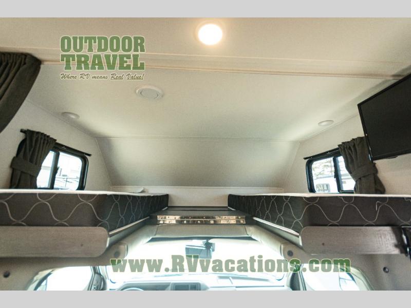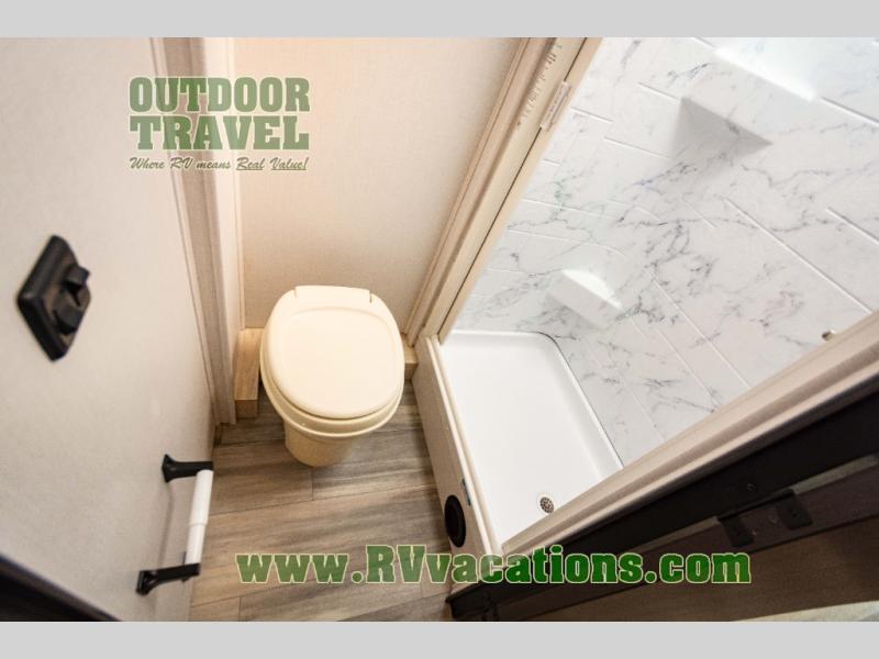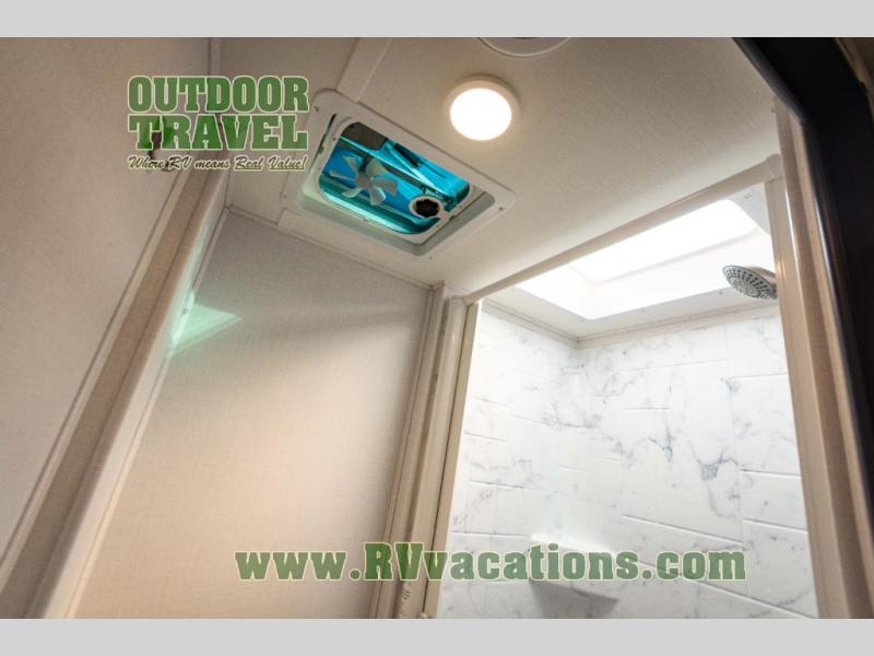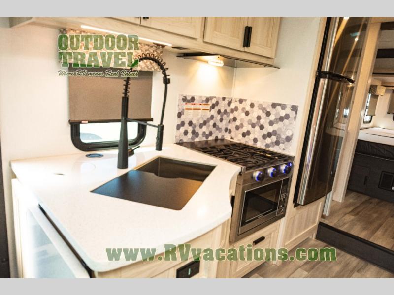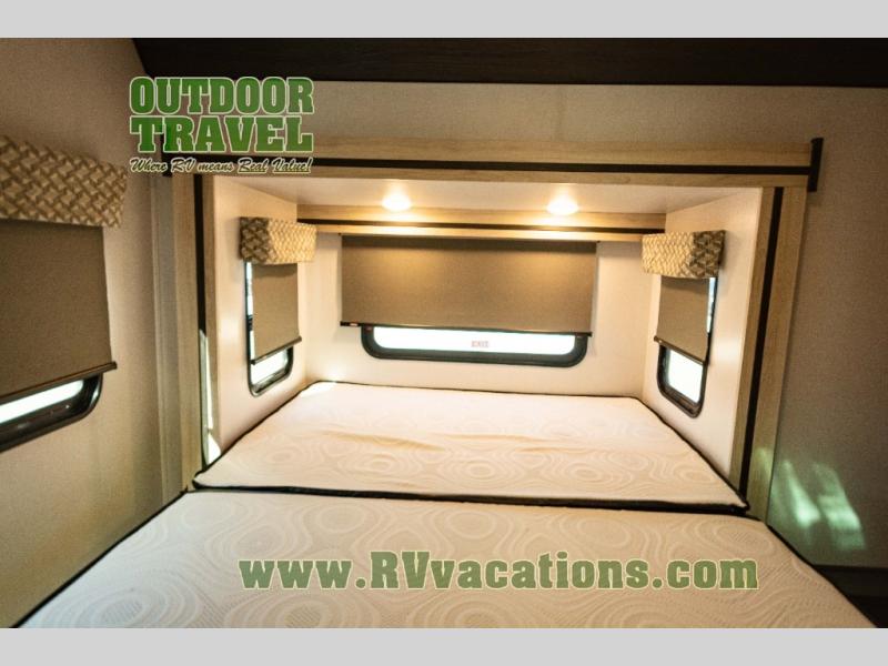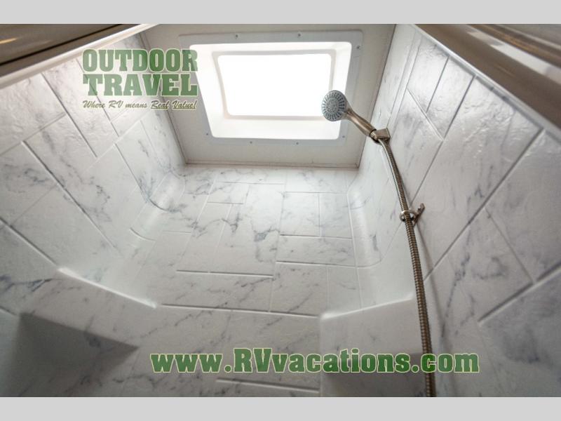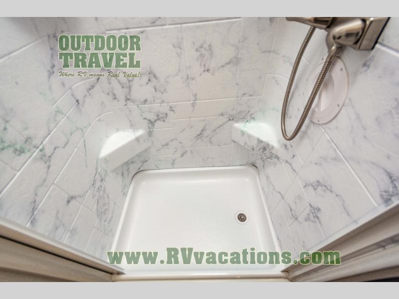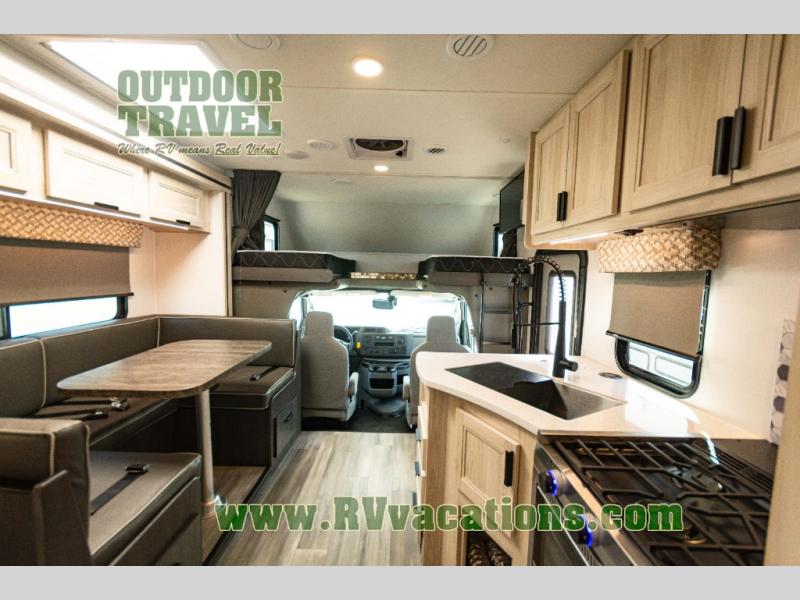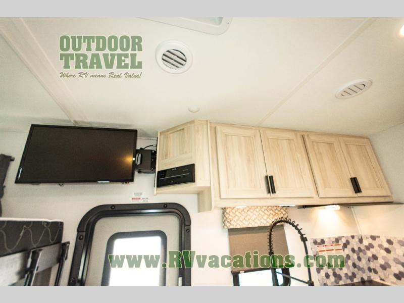 This motorhome has everything you will need for a fun and comfortable road trip! The rear private bedroom has a queen bed slide, a 12V TV, and a wardrobe to keep your clothes looking nice. Plus, it leads into the separated bathroom which has a private shower and a toilet across from a sink with a medicine cabinet. The 10.7 cu. ft. 12V refrigerator is big enough to store your perishables, the flip-up countertop will make meal prepping easier, and the three burner cooktop is just waiting for you to fry up some bacon. Enjoy all of your meals and game nights at the U-shaped dinette slide then transform it into an extra sleeping space if needed. Speaking of sleeping spaces, the 60" x 80" bunk over cab mat is a comfortable place for one to sleep or you can switch it out for an optional Trekker cap with a built-in entertainment center. You can even choose to add an optional outside 12V TV!