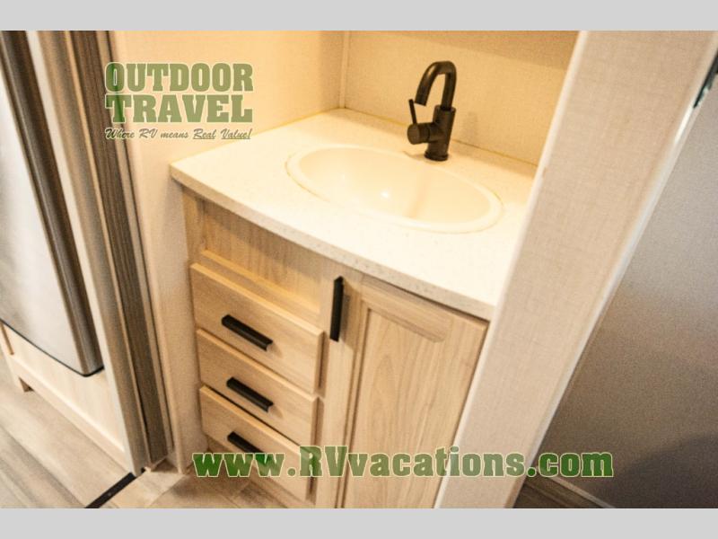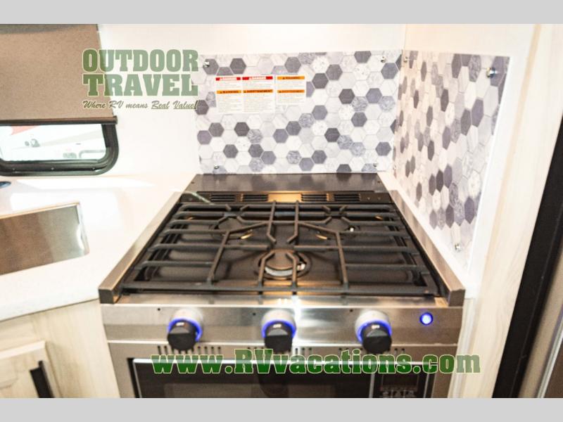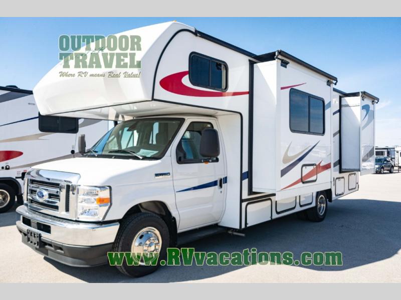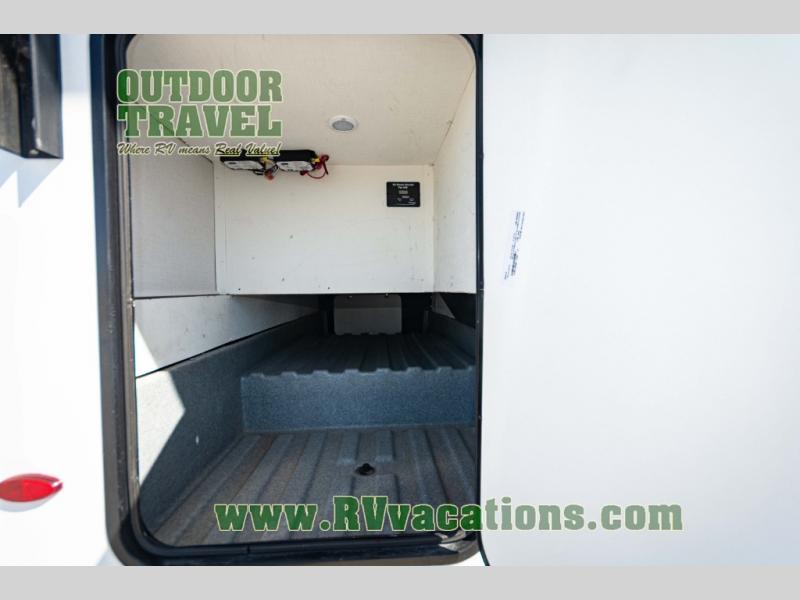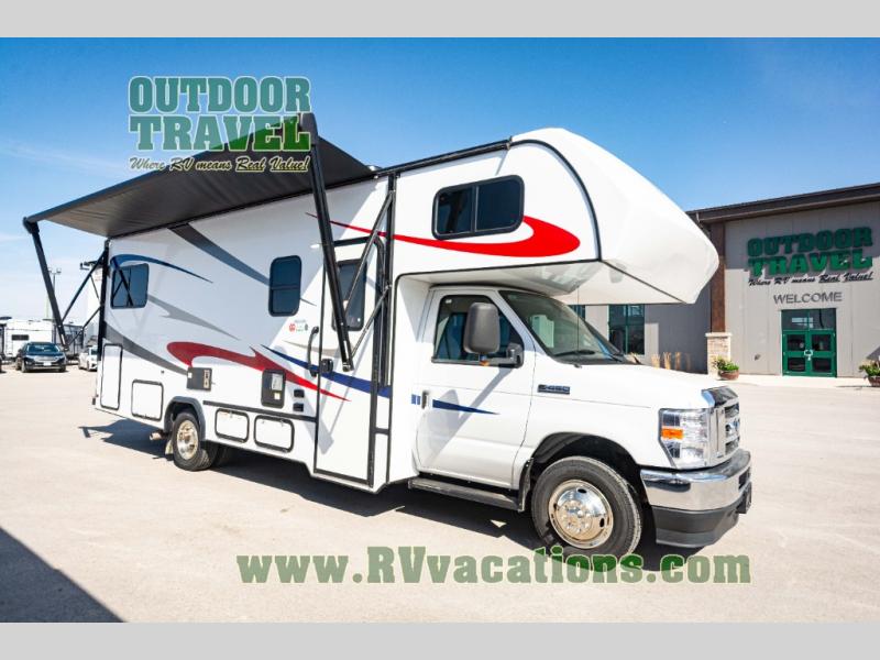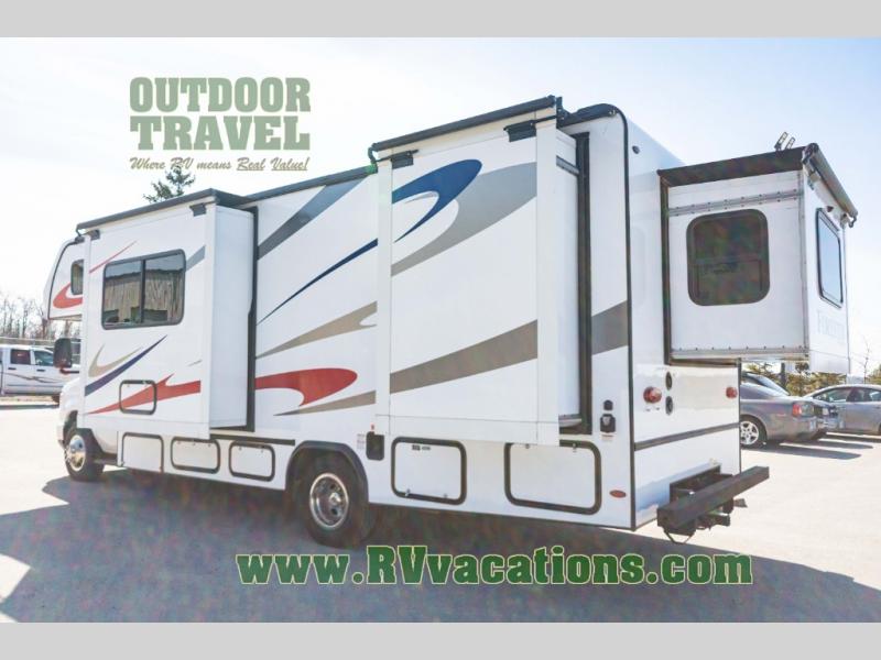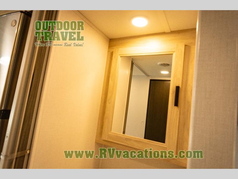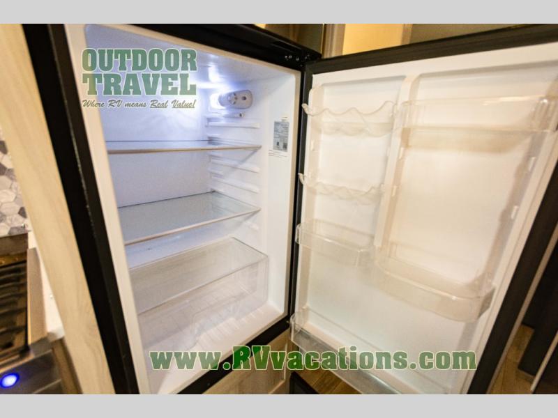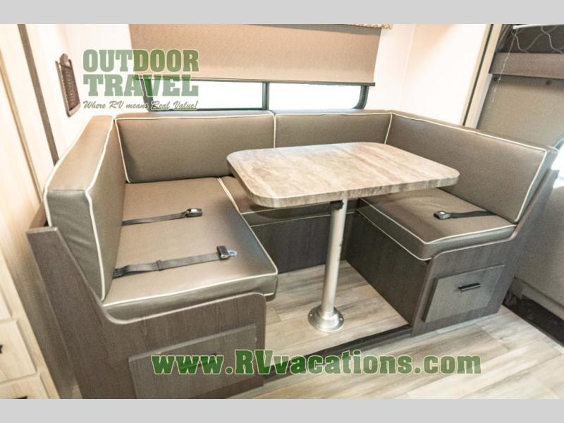 This motorhome has everything you will need for a fun and comfortable road trip! The rear private bedroom has a queen bed slide, a 12V TV, and a wardrobe to keep your clothes looking nice. Plus, it leads into the separated bathroom which has a private shower and a toilet across from a sink with a medicine cabinet. The 10.7 cu. ft. 12V refrigerator is big enough to store your perishables, the flip-up countertop will make meal prepping easier, and the three burner cooktop is just waiting for you to fry up some bacon. Enjoy all of your meals and game nights at the U-shaped dinette slide then transform it into an extra sleeping space if needed. Speaking of sleeping spaces, the 60" x 80" bunk over cab mat is a comfortable place for one to sleep or you can switch it out for an optional Trekker cap with a built-in entertainment center. You can even choose to add an optional outside 12V TV!
