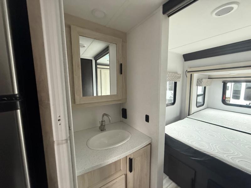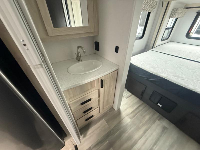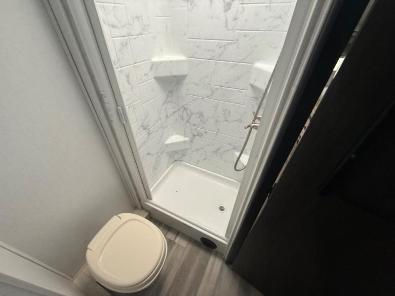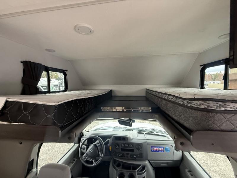 This motorhome has everything you will need for a fun and comfortable road trip! The rear private bedroom has a queen bed slide, a 12V TV, and a wardrobe to keep your clothes looking nice. Plus, it leads into the separated bathroom which has a private shower and a toilet across from a sink with a medicine cabinet. The 10.7 cu. ft. 12V refrigerator is big enough to store your perishables, the flip-up countertop will make meal prepping easier, and the three burner cooktop is just waiting for you to fry up some bacon. Enjoy all of your meals and game nights at the U-shaped dinette slide then transform it into an extra sleeping space if needed. Speaking of sleeping spaces, the 60" x 80" bunk over cab mat is a comfortable place for one to sleep or you can switch it out for an optional Trekker cap with a built-in entertainment center. You can even choose to add an optional outside 12V TV!