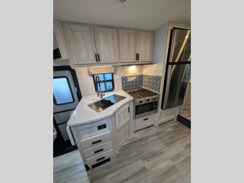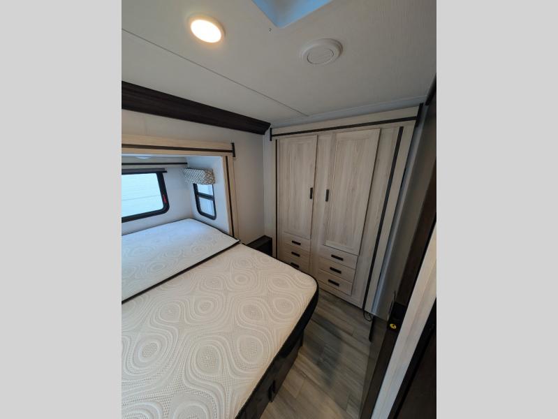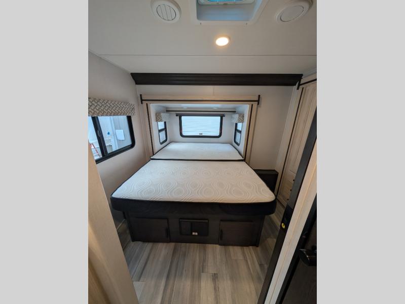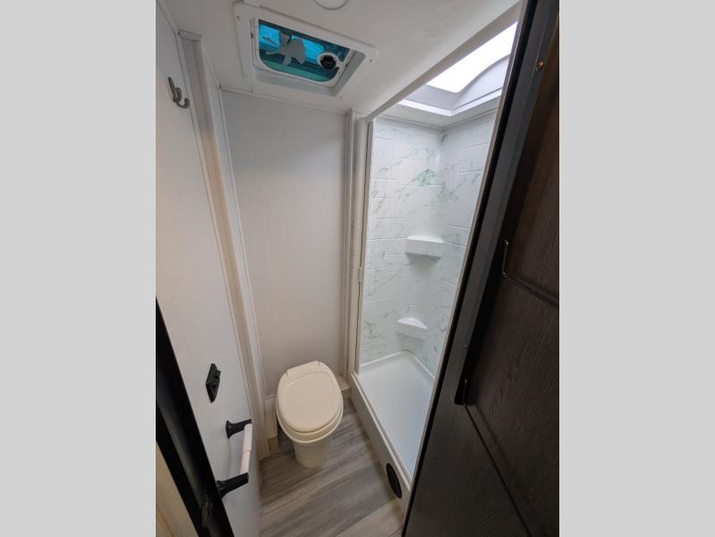 This motorhome has everything you will need for a fun and comfortable road trip! The rear private bedroom has a queen bed slide, a 12V TV, and a wardrobe to keep your clothes looking nice. Plus, it leads into the separated bathroom which has a private shower and a toilet across from a sink with a medicine cabinet. The 10.7 cu. ft. 12V refrigerator is big enough to store your perishables, the flip-up countertop will make meal prepping easier, and the three burner cooktop is just waiting for you to fry up some bacon. Enjoy all of your meals and game nights at the U-shaped dinette slide then transform it into an extra sleeping space if needed. Speaking of sleeping spaces, the 60" x 80" bunk over cab mat is a comfortable place for one to sleep or you can switch it out for an optional Trekker cap with a built-in entertainment center. You can even choose to add an optional outside 12V TV!