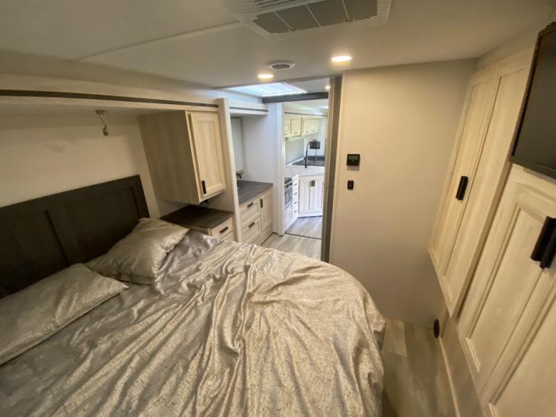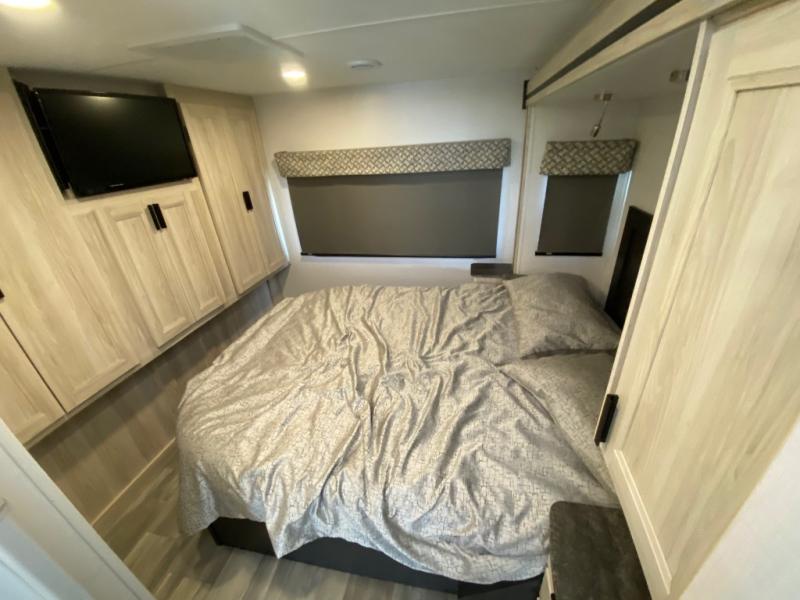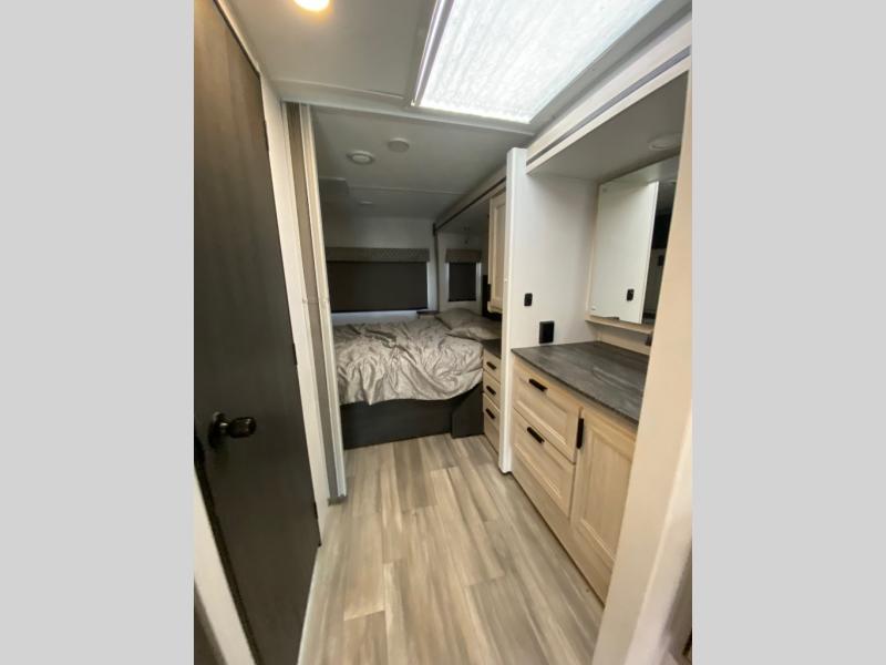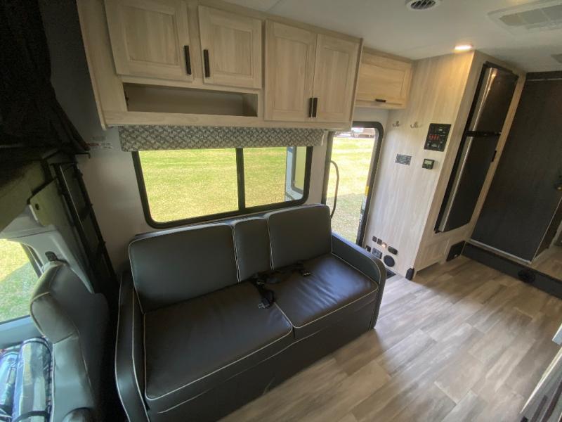 Start traveling in true luxury with this motorhome! The rear private bedroom has a queen bed slide to lay your head at night, a shirt closet, and wardrobes on either side of the 12V TV. It also leads into the separated bathroom which has a 24" x 36" shower and toilet across from a sink with a medicine cabinet above it. The undermount 1.3 cu. ft. convection microwave will come in handy on those nights when you don't feel like cooking and the flip-up countertop will make your meal prepping easier. You can enjoy your meals at the booth dinette and lay down on the sofa to catch up on your book. The 60" x 80" bunk over cab mat offers a comfortable sleeping space but can be switched out for the optional Trekker cap with a built-in entertainment center!