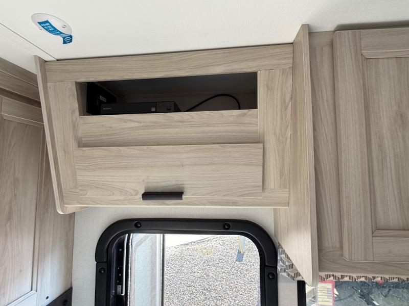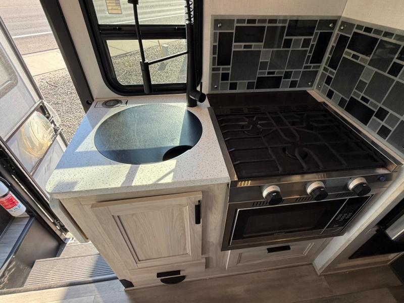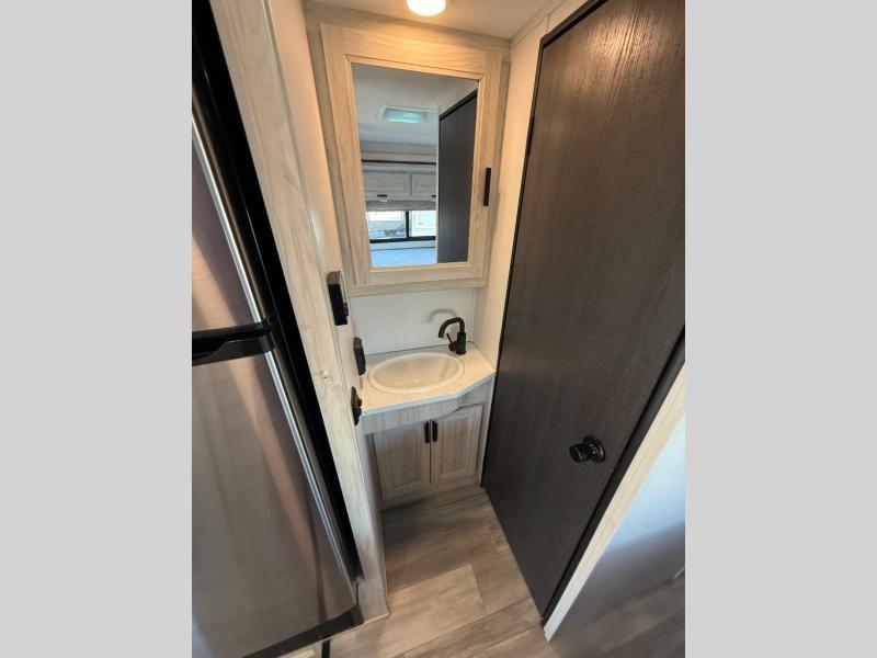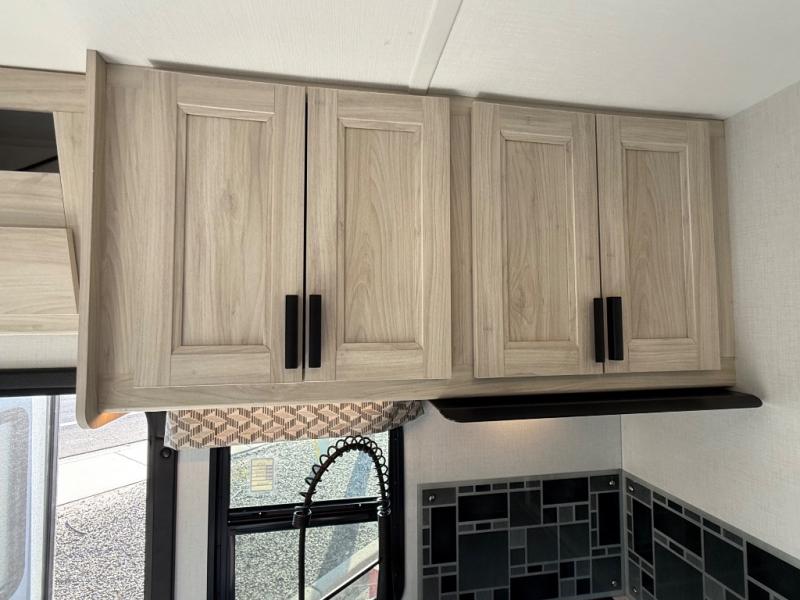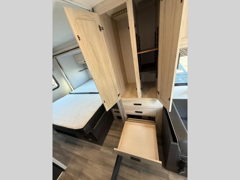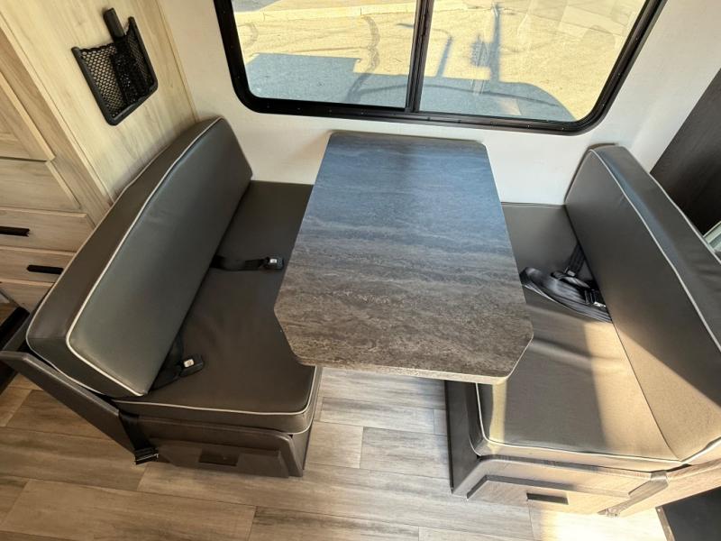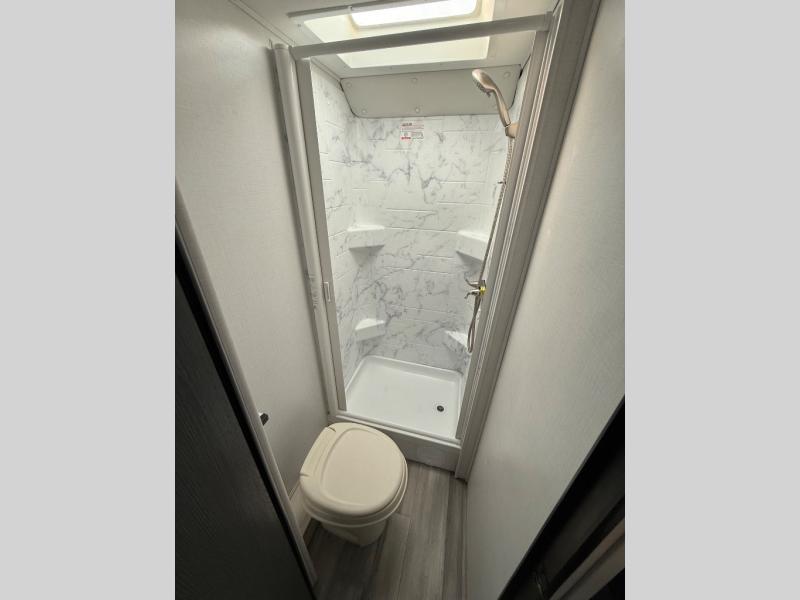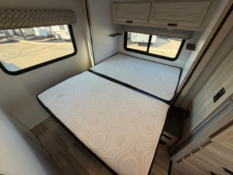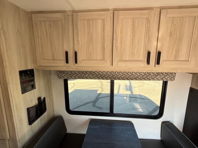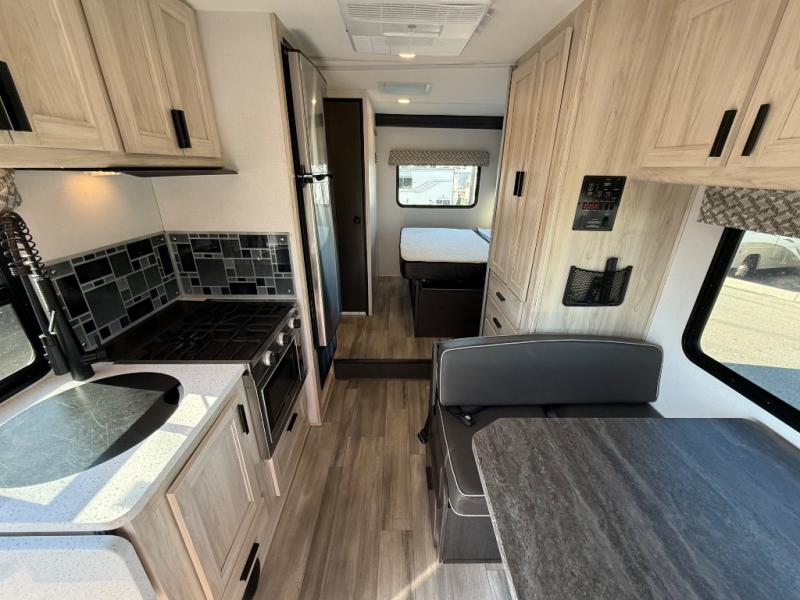 Enjoy trips near and far in this single slide out coach. The kitchen provides a 10.7 cu. ft. 12V refrigerator to store the cold items, a convection microwave and a recessed three-burner range to whip up meals. The private toilet and shower give you a place to get cleaned up, and the bathroom sink is just outside the door. This model includes a queen bed slide out with a wedge mattress, and there is a cab-over bunk for your guests. You can spend your evenings playing cards at the booth dinette, or head outdoors to relax under the 14' power awning with LED lights!