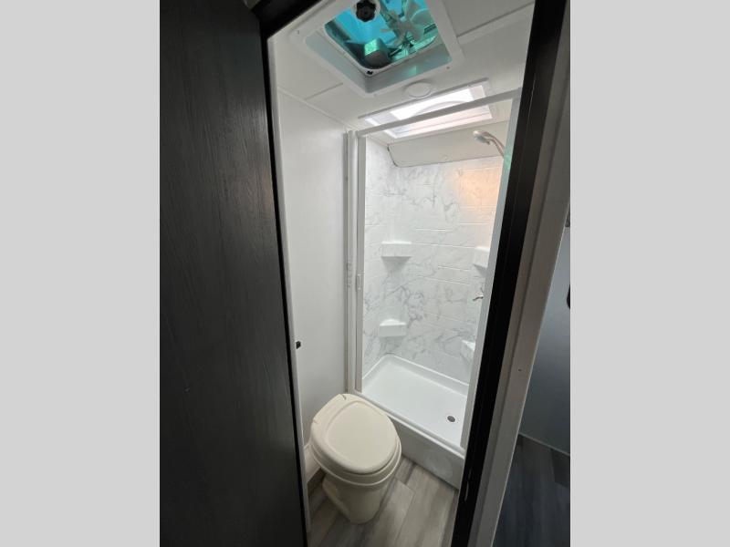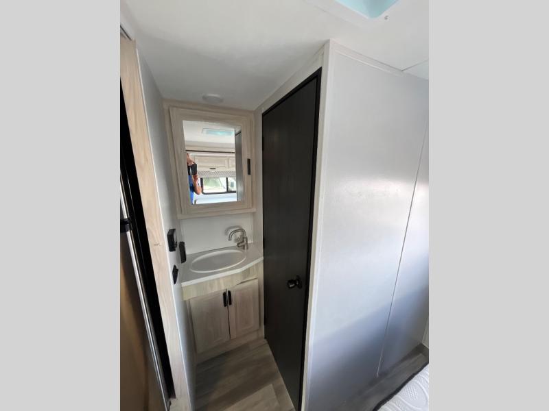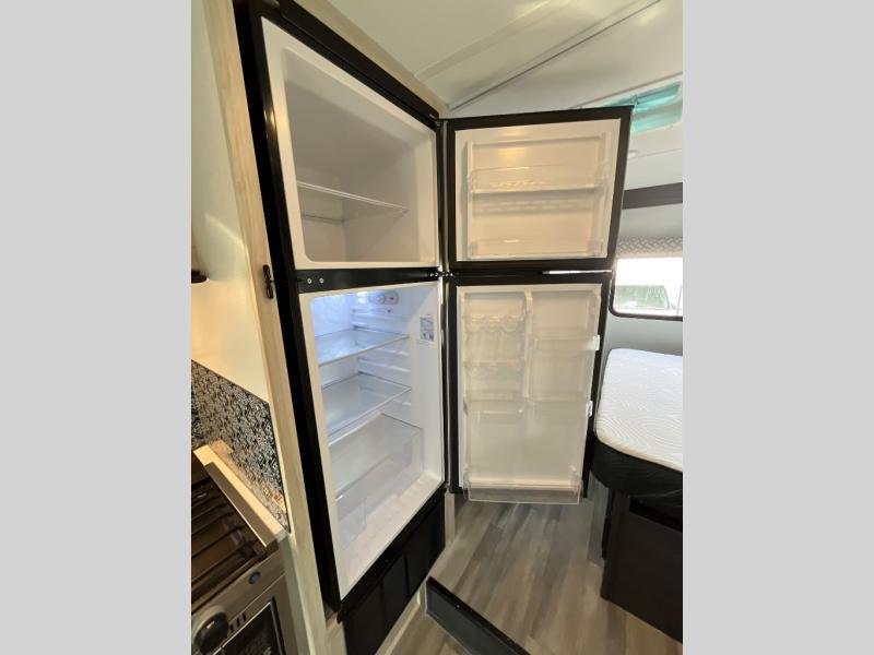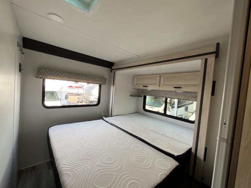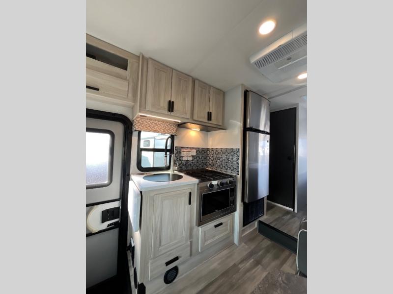 Enjoy trips near and far in this single slide out coach. The kitchen provides a 10.7 cu. ft. 12V refrigerator to store the cold items, a convection microwave and a recessed three-burner range to whip up meals. The private toilet and shower give you a place to get cleaned up, and the bathroom sink is just outside the door. This model includes a queen bed slide out with a wedge mattress, and there is a cab-over bunk for your guests. You can spend your evenings playing cards at the booth dinette, or head outdoors to relax under the 14' power awning with LED lights!