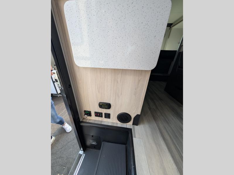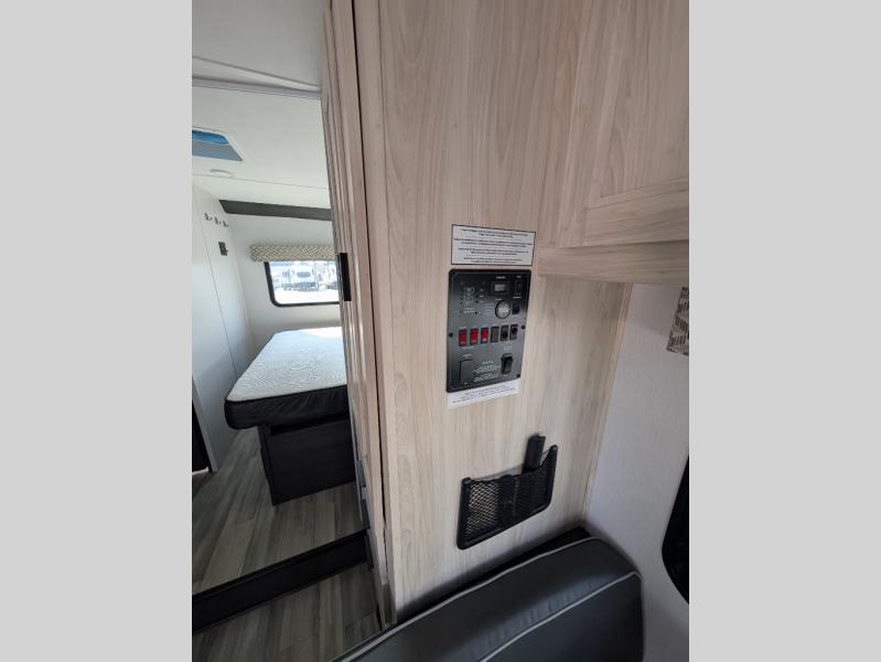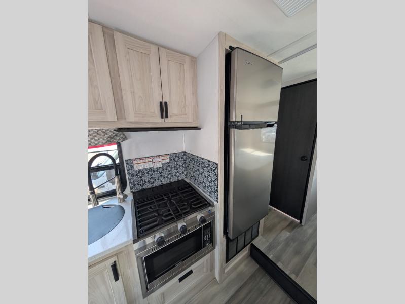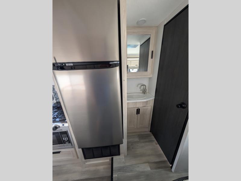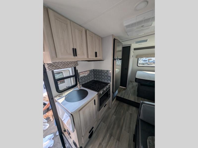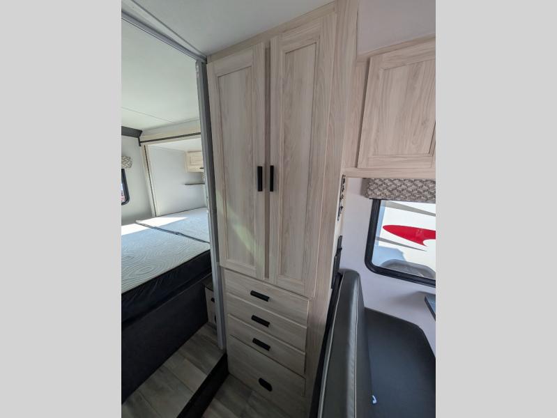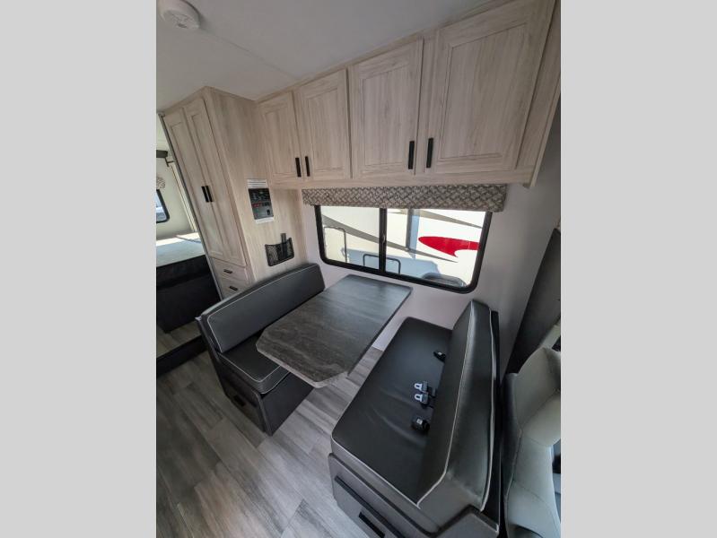 Enjoy trips near and far in this single slide out coach. The kitchen provides a 10.7 cu. ft. 12V refrigerator to store the cold items, a convection microwave and a recessed three-burner range to whip up meals. The private toilet and shower give you a place to get cleaned up, and the bathroom sink is just outside the door. This model includes a queen bed slide out with a wedge mattress, and there is a cab-over bunk for your guests. You can spend your evenings playing cards at the booth dinette, or head outdoors to relax under the 14' power awning with LED lights!