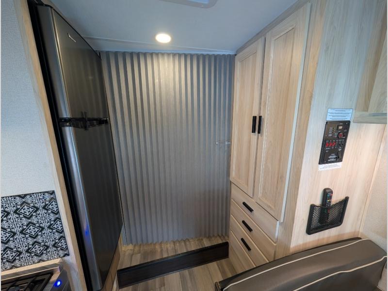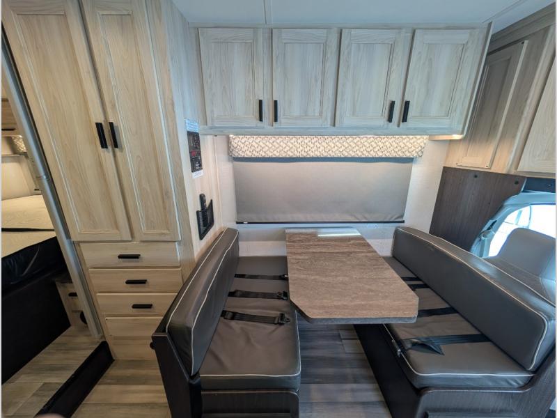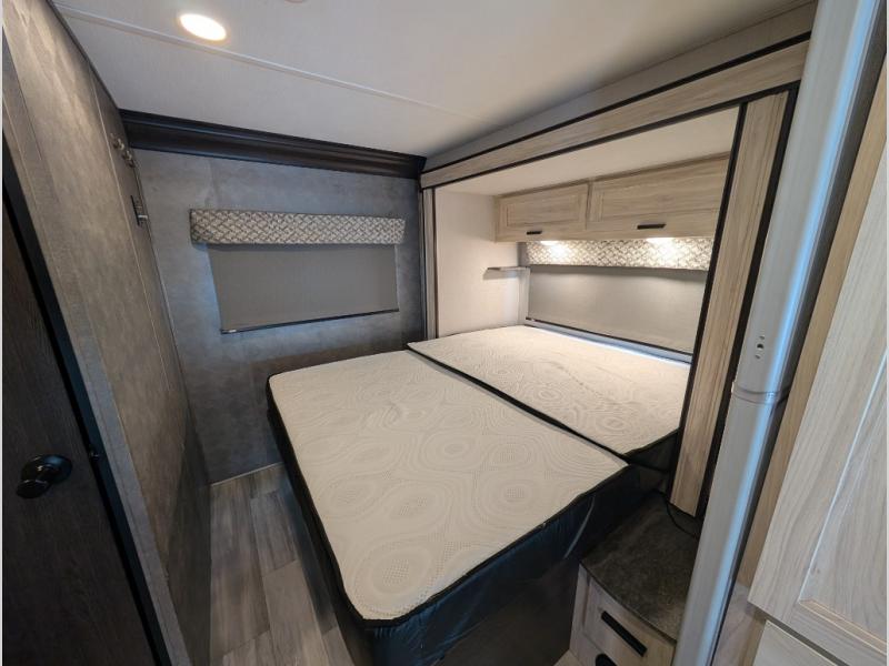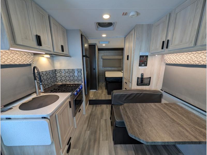 Enjoy trips near and far in this single slide out coach. The kitchen provides a 10.7 cu. ft. 12V refrigerator to store the cold items, a convection microwave and a recessed three-burner range to whip up meals. The private toilet and shower give you a place to get cleaned up, and the bathroom sink is just outside the door. This model includes a queen bed slide out with a wedge mattress, and there is a cab-over bunk for your guests. You can spend your evenings playing cards at the booth dinette, or head outdoors to relax under the 14' power awning with LED lights!