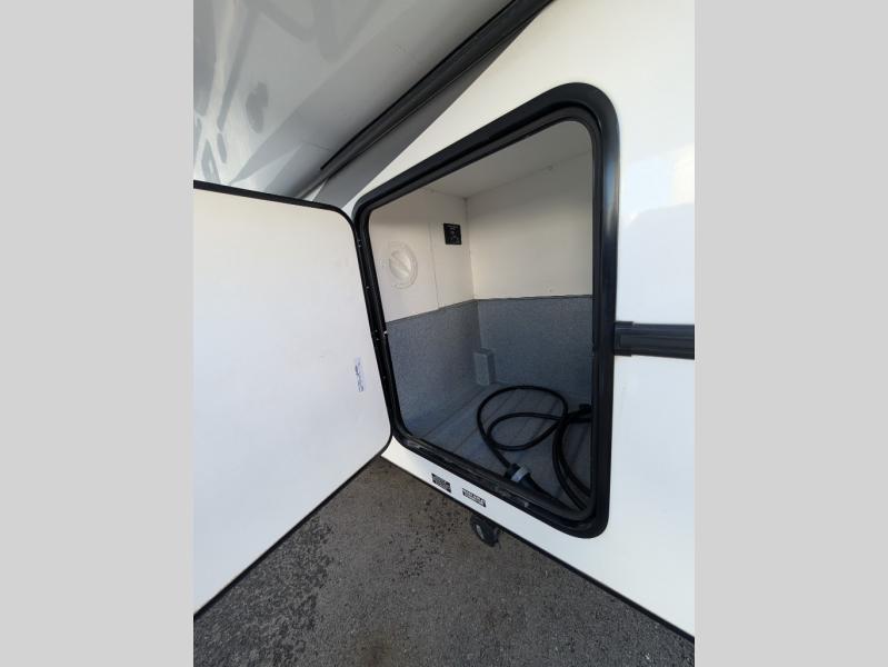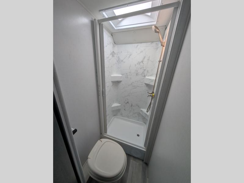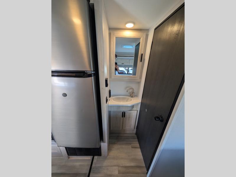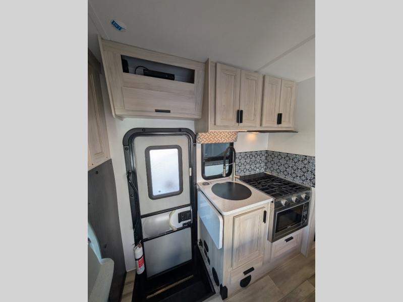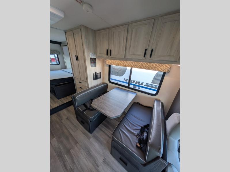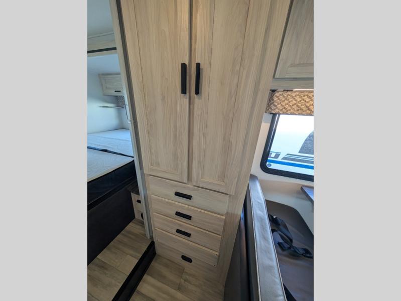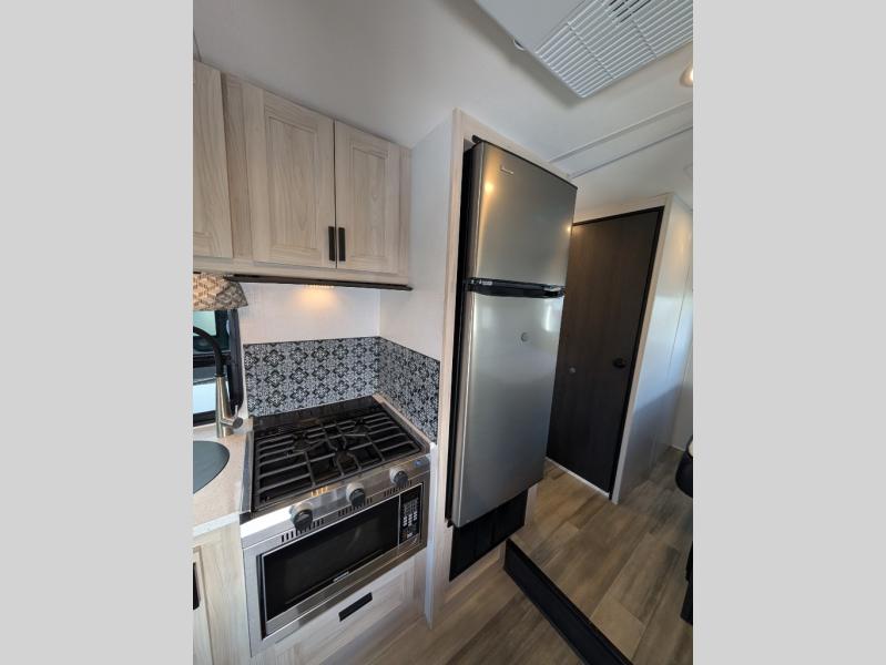 Enjoy trips near and far in this single slide out coach. The kitchen provides a 10.7 cu. ft. 12V refrigerator to store the cold items, a convection microwave and a recessed three-burner range to whip up meals. The private toilet and shower give you a place to get cleaned up, and the bathroom sink is just outside the door. This model includes a queen bed slide out with a wedge mattress, and there is a cab-over bunk for your guests. You can spend your evenings playing cards at the booth dinette, or head outdoors to relax under the 14' power awning with LED lights!