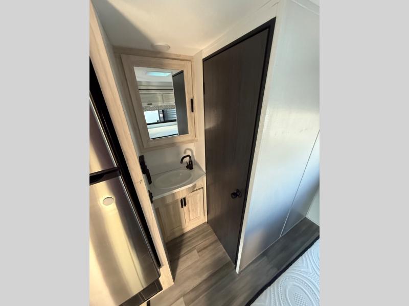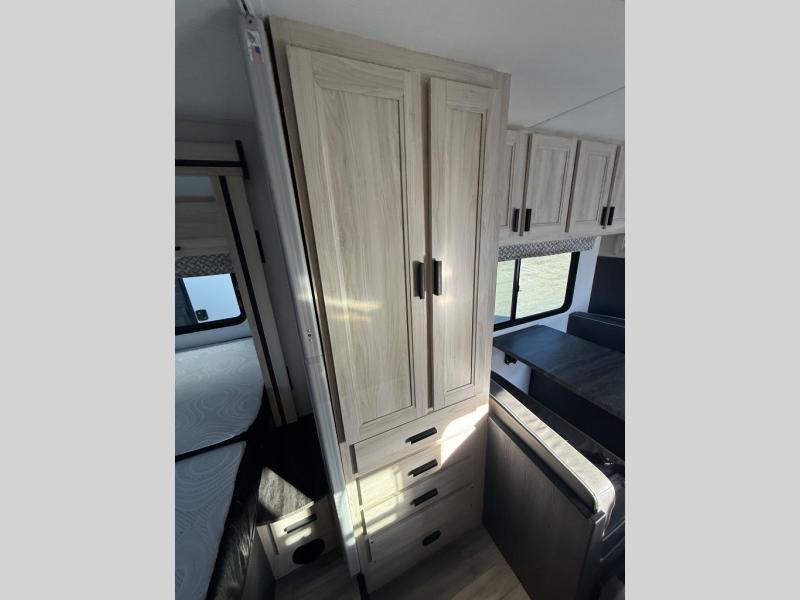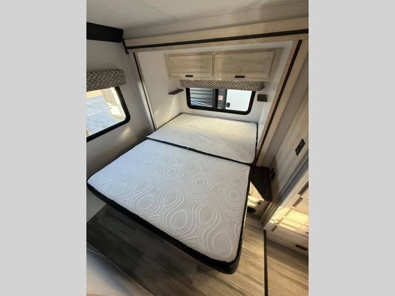 Enjoy trips near and far in this single slide out coach. The kitchen provides a 10.7 cu. ft. 12V refrigerator to store the cold items, a convection microwave and a recessed three-burner range to whip up meals. The private toilet and shower give you a place to get cleaned up, and the bathroom sink is just outside the door. This model includes a queen bed slide out with a wedge mattress, and there is a cab-over bunk for your guests. You can spend your evenings playing cards at the booth dinette, or head outdoors to relax under the 14' power awning with LED lights!