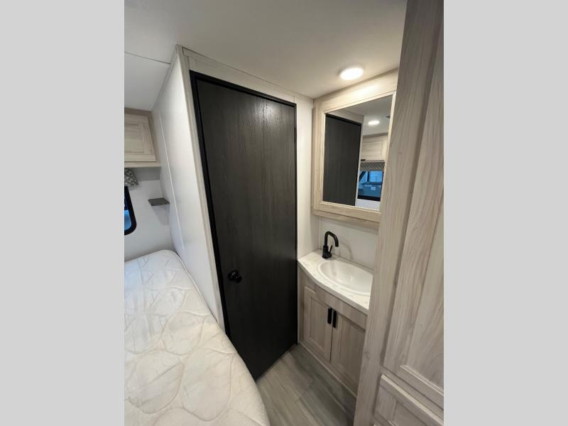 Travel in style with your own accommodations in this coach. You'll find a queen-size cab-over bunk that can be utilized as extra sleeping space or even storage, plus the rear corner offers a queen bed. And don't forget about the U-dinette as extra sleeping space after dining, playing games and relaxing. The kitchen offers a 10.7 cu. ft. 12V refrigerator, a convection microwave, a recessed three-burner range, soft touch self-closing drawer guides and a cordless 12V charging plate. The private toilet and shower room gives you a place to get cleaned up, and the bathroom sink is just outside the door allowing someone else the ability to get ready at the same time.
