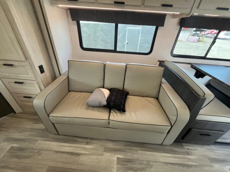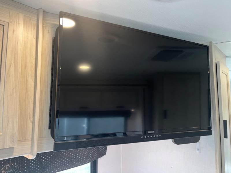 This flush floor bedroom and living area is spacious and inviting with a slide out sofa and booth dinette across from the kitchen amenities. The kitchen offers a 10.7 cu. ft. 12V refrigerator, a convection microwave, and a recessed three-burner range. You will also find the 12V TV with work station below and a pantry. More storage can be found in the linen cabinet next to the rear bathroom plus there is a wardrobe in the rear bedroom. You'll get a great night's rest on the queen bed slide out and your guests can sleep on the cab-over bunk or living area furniture.