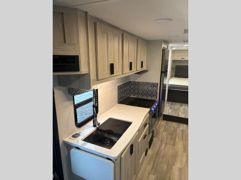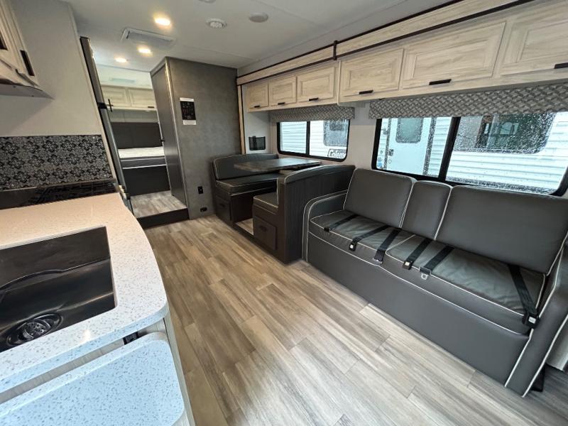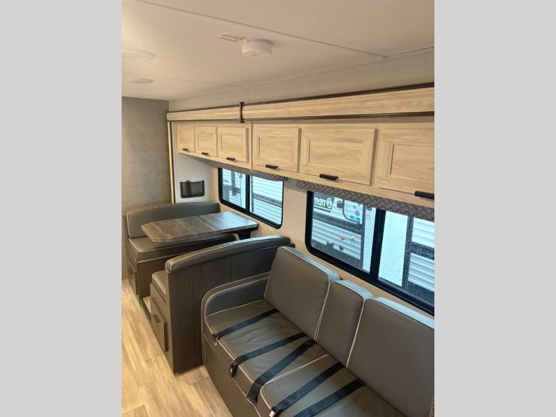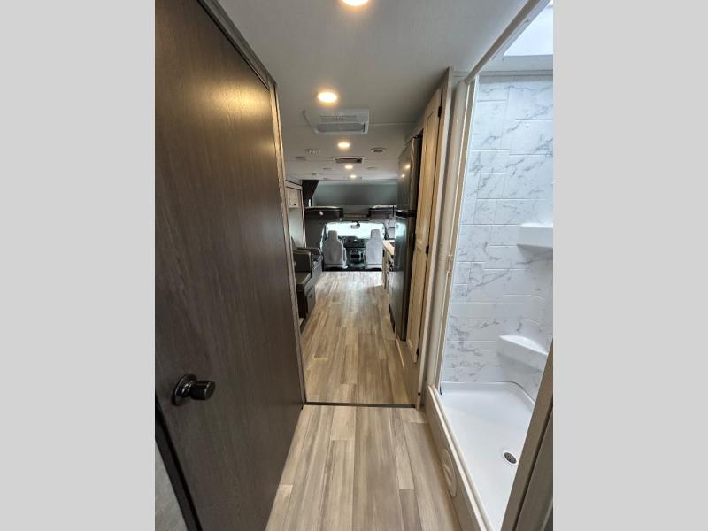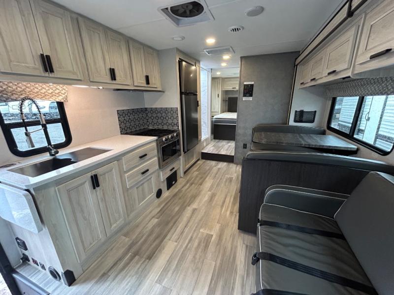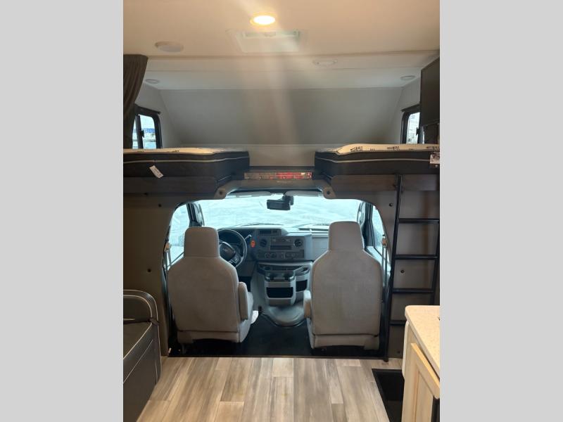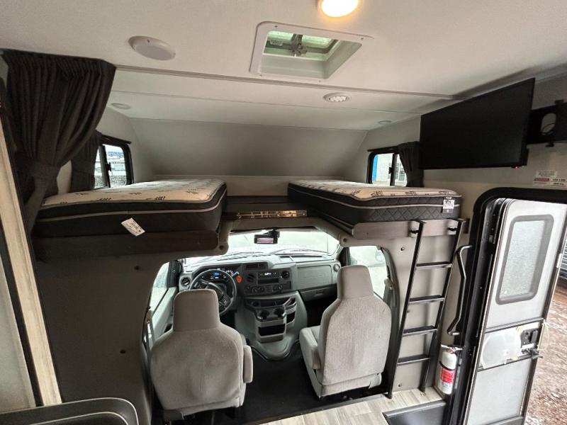 With any Forester LE Class C gas motorhome by Forest River, you will enjoy premier features such as the color back-up camera/side view cameras with a rear view mirror monitor, the Winegard Air 360+ digital antenna, and the 15,000 BTU ceiling ducted, ultra quiet roof air with a heat pump when traveling during the warmer months. The exterior includes aluminum framed laminated sidewalls, gel coat exterior fiberglass, a one-piece fiberglass front cap, and slide room toppers. Some of the interior top features are the Maxx Air multi-speed power fan with a cover in the kitchen, the overhead bunk ladder, the high pressure oxygen infused shower head, and the blackout roller shades for a good night's sleep. Make your selection today!
