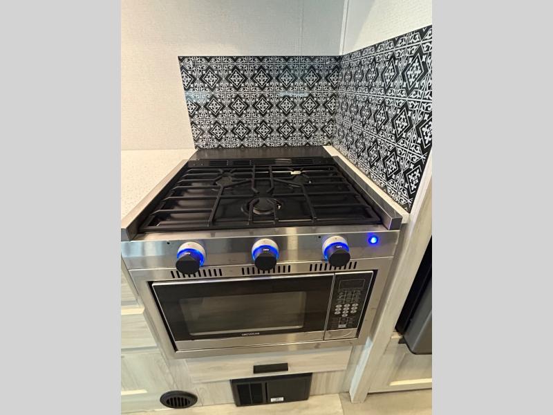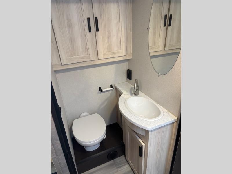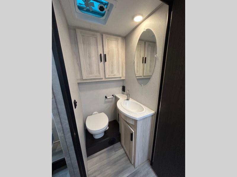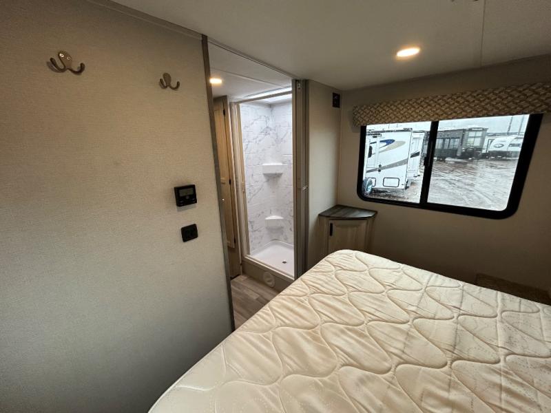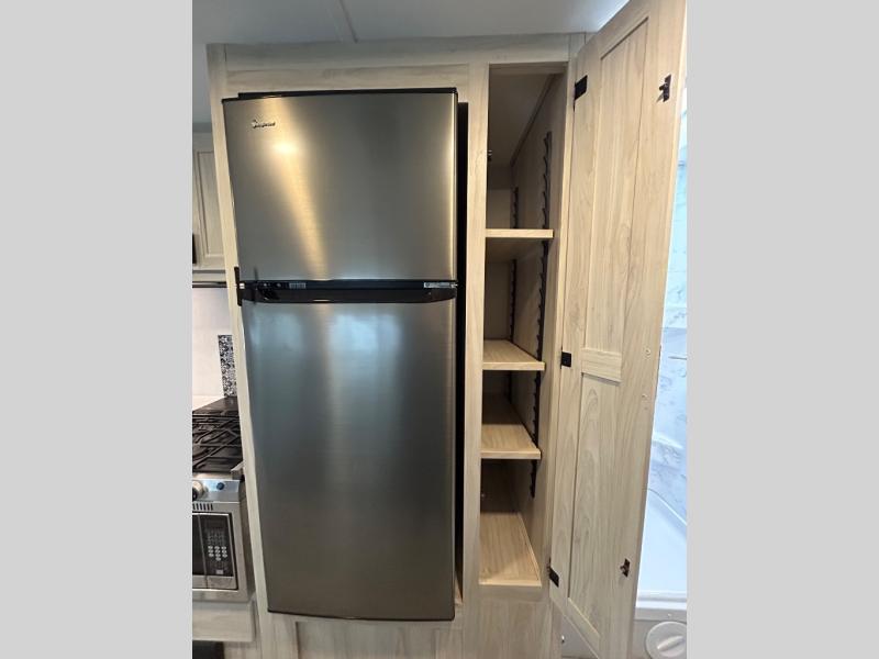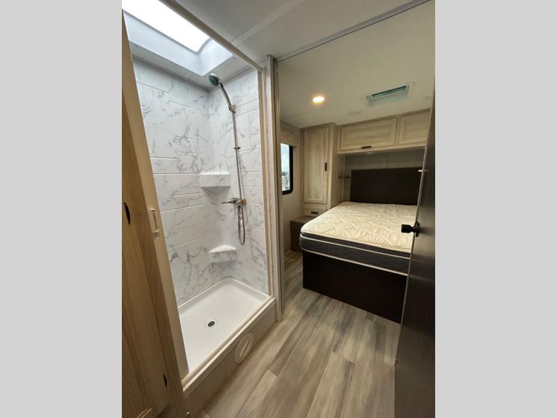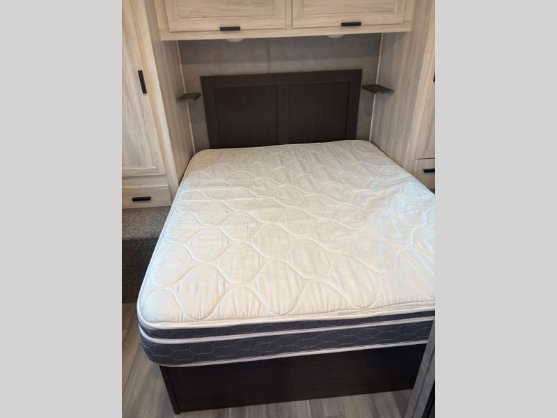 You and your favorite person will love this coach for many reasons including having your own private bedroom with a split bathroom, a walk-around queen bed, plus your own wardrobe. The split bathroom is pretty handy since one person can get ready in the private toilet and sink room while another is taking a shower. The kitchen offers a 10.7 cu. ft. 12V refrigerator, a convection microwave, a recessed three-burner range, soft touch self-closing drawer guides and a cordless 12V charging plate. You will have overhead cabinets and a pantry for storage. The slide out sofa and booth dinette offer a great place to relax and dine plus gives you more floor space. And the queen bunk over the cab will be a popular sleeping space for overnight guests.
