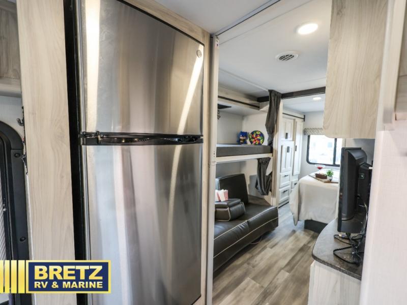 This family friendly coach allows the kids to have their own space either on the flip-down bunk above the kid's sofa sleeper that is across from the full bathroom or on the cab-over bunk. You will have the rear bedroom all to yourselves with a queen bed and a large wardrobe for your things. Everyone can visit while relaxing on the sofa and booth dinette while watching the LED TV or even while sitting under the 11' power awning outside when you add your camping chairs. The kitchen offers a corner area to make meals with a convection microwave and recessed three-burner range, plus a round sink and flip-up counter extension, and you can store cold items in the 10.7 cu. ft. 12V refrigerator near the entry, and the soft touch self-closing drawer guides and cordless 12V charging plate are features you will love.