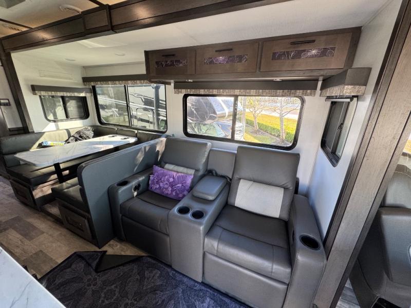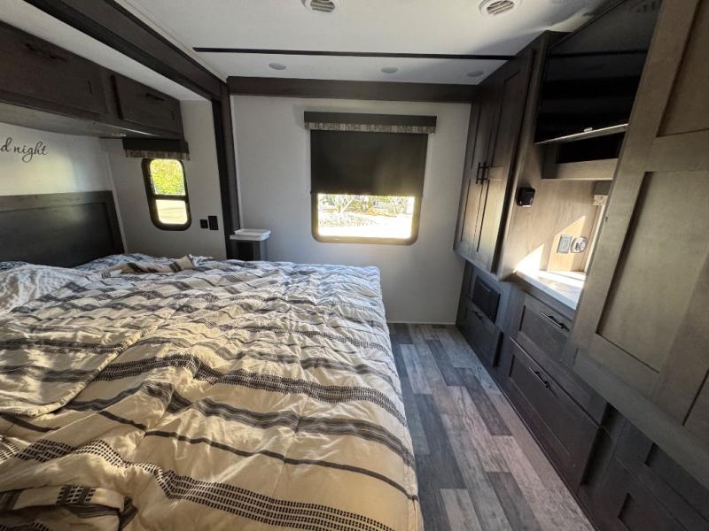 Whether you travel with your spouse, grandkids or friends, this FR3 Class A gas motorhome allows you to travel in style with plenty of additional sleeping choices from the power overhead bunk to the furniture once they are set up a night. You can dine at the wrap-around booth dinette, relax on the hide-a-bed sofa, and make full meals in the kitchen which also includes a residential microwave and countertop extension. The separated bathroom allows someone to take a shower while another freshens up in the sink and toilet room, or maybe you decide to close this area off within the bedroom. Every night you can sleep like a king while watching the 32" LED 12V TV in the bedroom, and maybe you decided to add the washer/dryer option to keep everything clean while on the road.