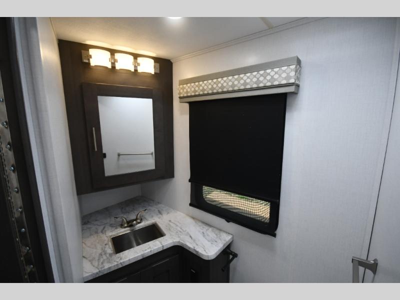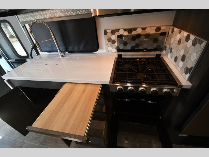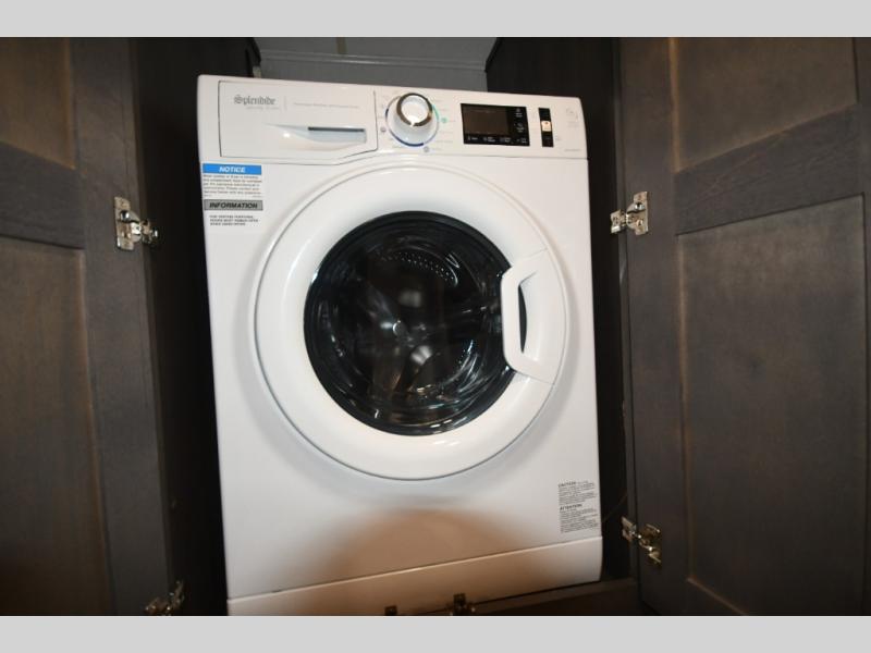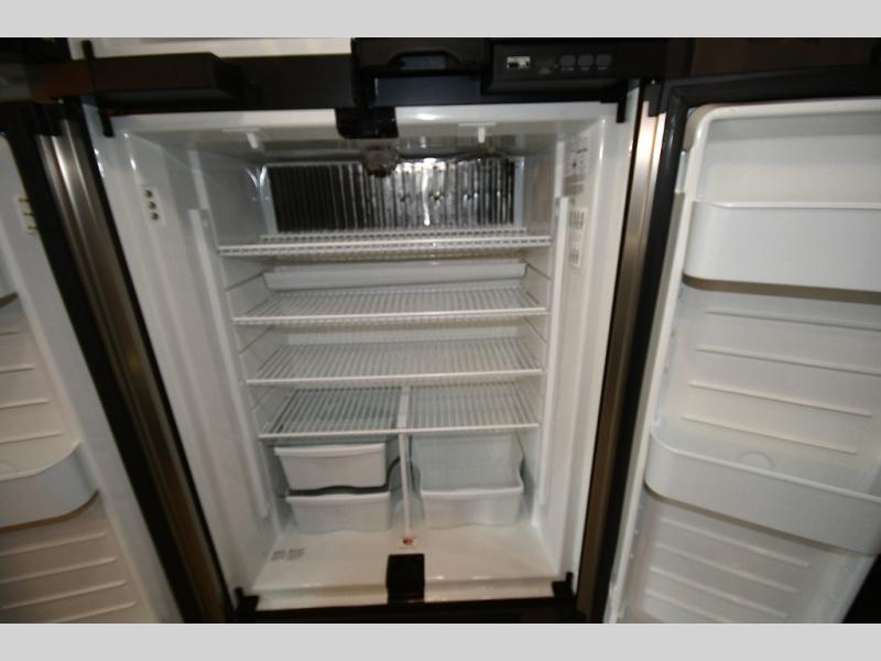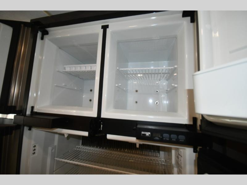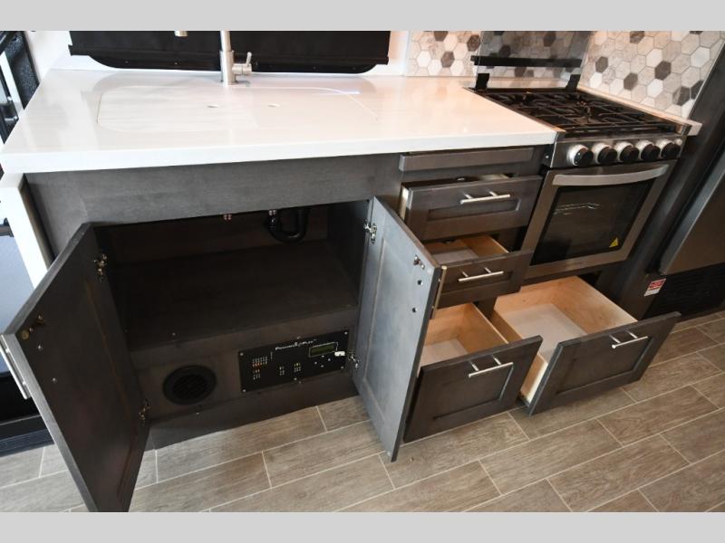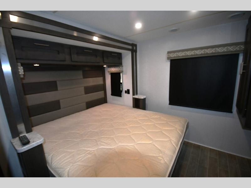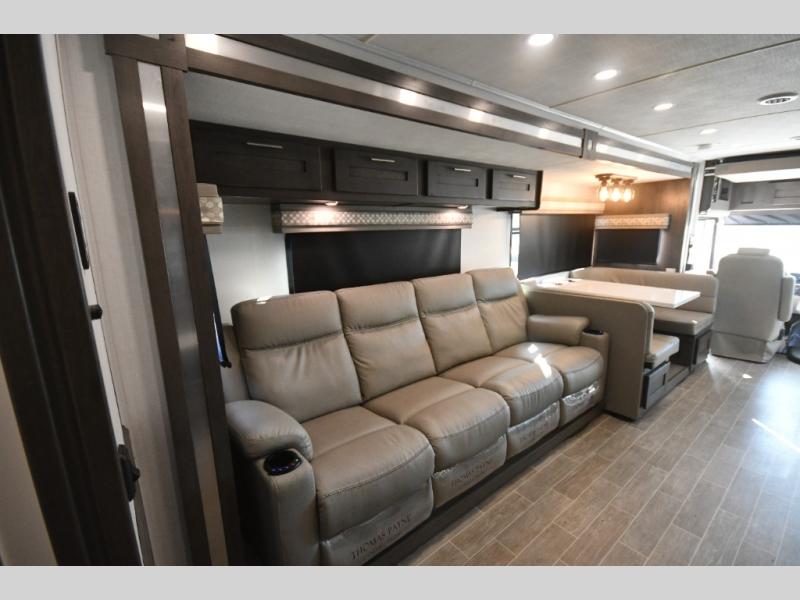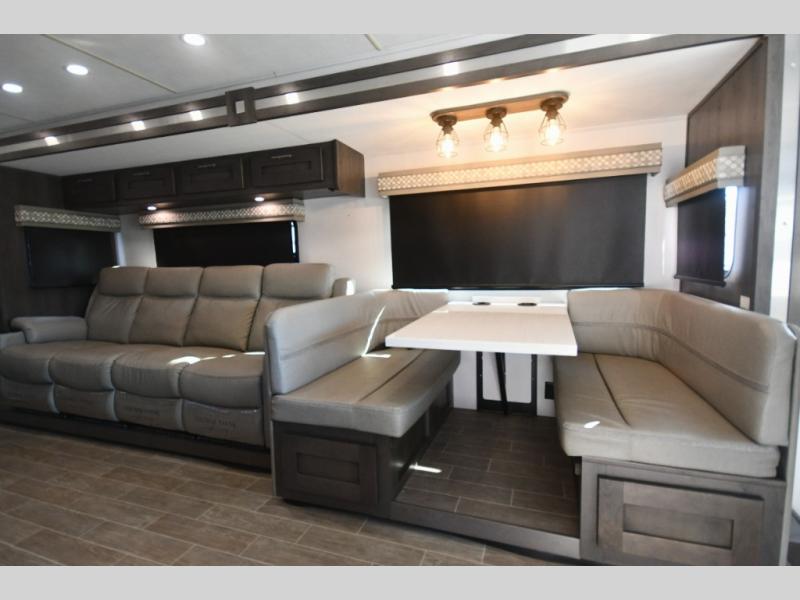 Step inside and you’re welcomed by upscale finishes and a thoughtfully designed living space that feels more like a high-end condo than an RV. Plush seating, modern cabinetry, and expansive windows create a bright, open atmosphere ideal for relaxing or entertaining.