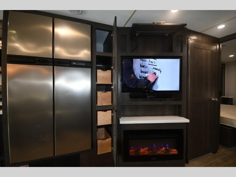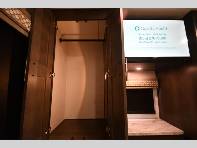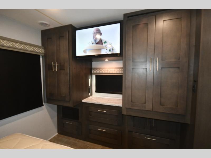 You will love the spacious living entertainment in this motorhome! There is a Thomas Payne 4-person theater seating that reclines with adjustable headrests, heat, massage and has pop-up 110V outlets across from the 5,000 BTU fireplace with a 40" LED TV to watch your favorite movies in true comfort. The kitchen has everything you need to prepare your best home cooked meals including a brush nickel designer faucet with pull out spray wand for easy clean up, and you can enjoy all of your meals at the Dream Dinette. You will appreciate having your own private retreat with the rear bedroom which has a 72" x 80" king bed slide across from a dresser with a 32" LED TV, a wardrobe on one side, and another wardrobe on the other that is prepped to add an optional washer and dryer. There is also a 42" x 80" P2K Euro loft power bunk over cab for extra sleeping space!