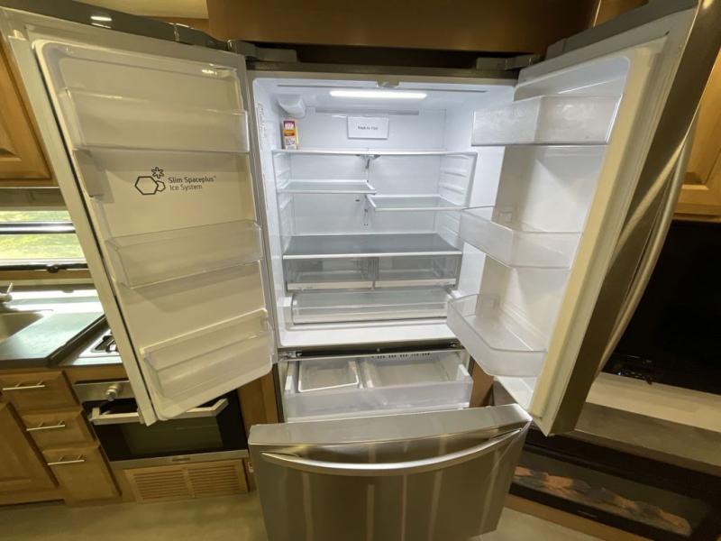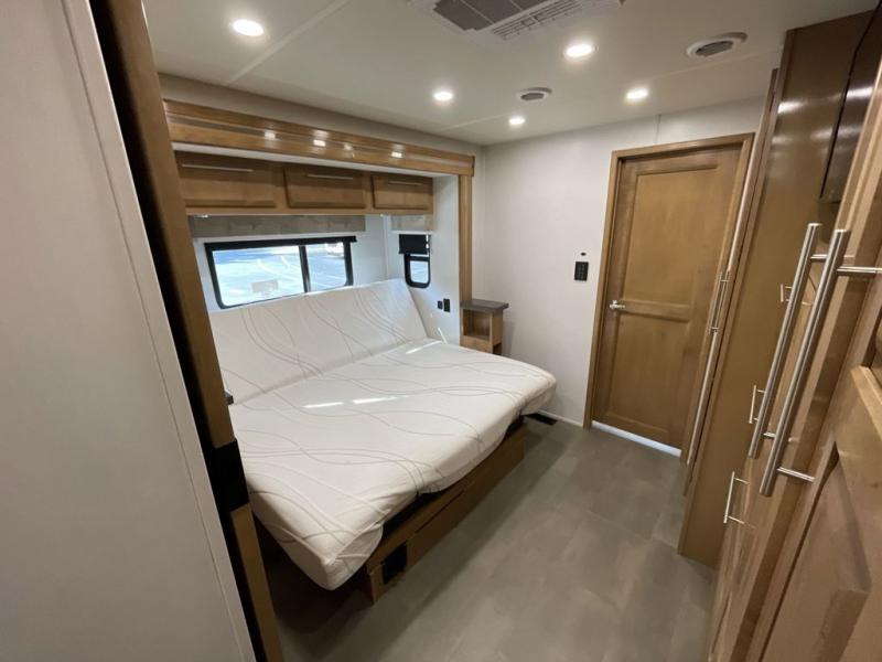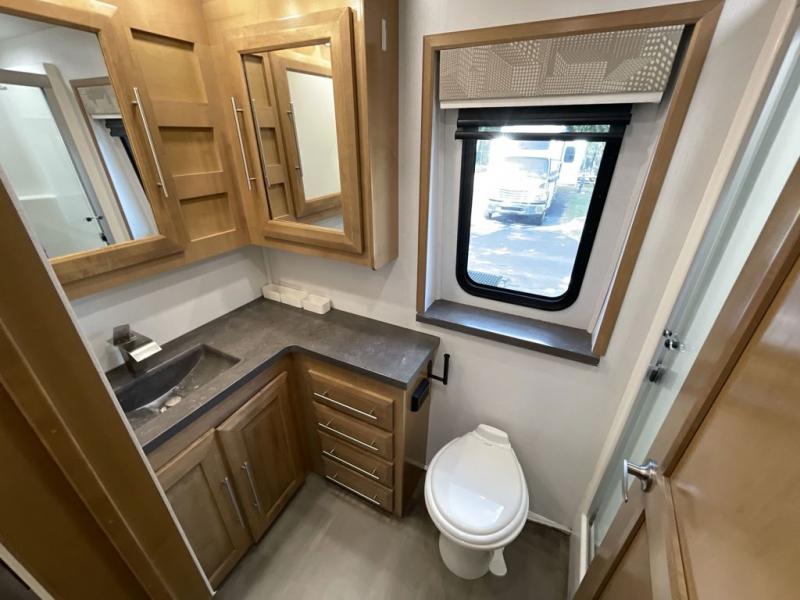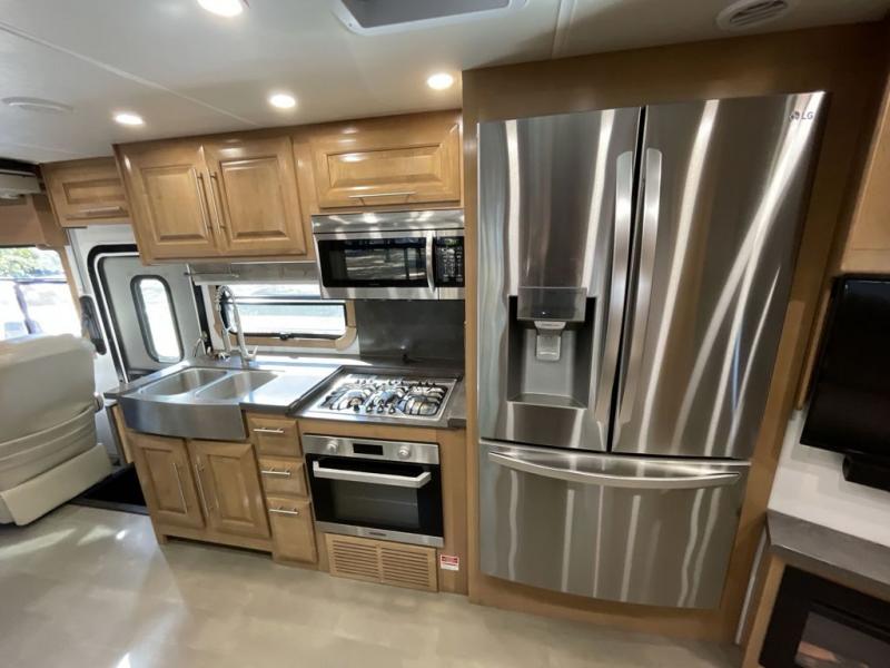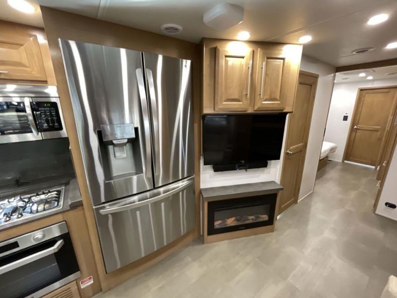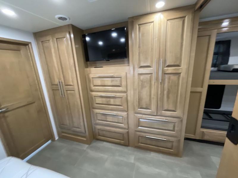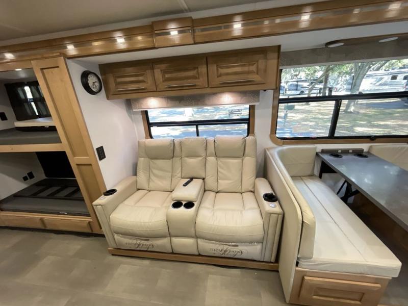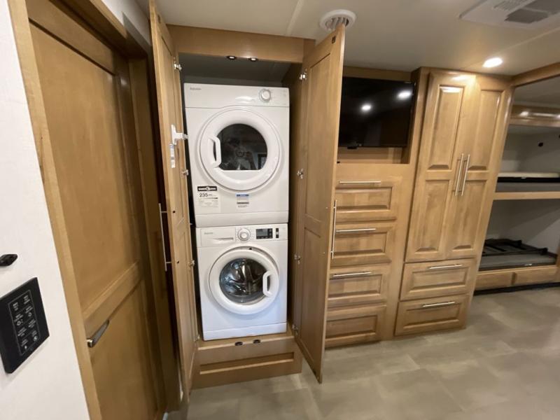 It's a clean decision to take this motorhome on all of your adventures with two full bathrooms! The full rear bathroom has a 42" x 30" shower with a seat and creates a master suite with the bedroom which has a 72" x 80" king bed slide across from a dresser with a 32" LED TV and wardrobes on either side of it with one of them prepped to add an optional washer and dryer. The set of bunk beds are conveniently across from the second full bathroom which will come in handy at night and keep things running smoothly in the mornings with a 41" x 34" shower. Prepare your best home cooked meals with the three burner cooktop and enjoy them at the booth dinette then relax on the theater seating!